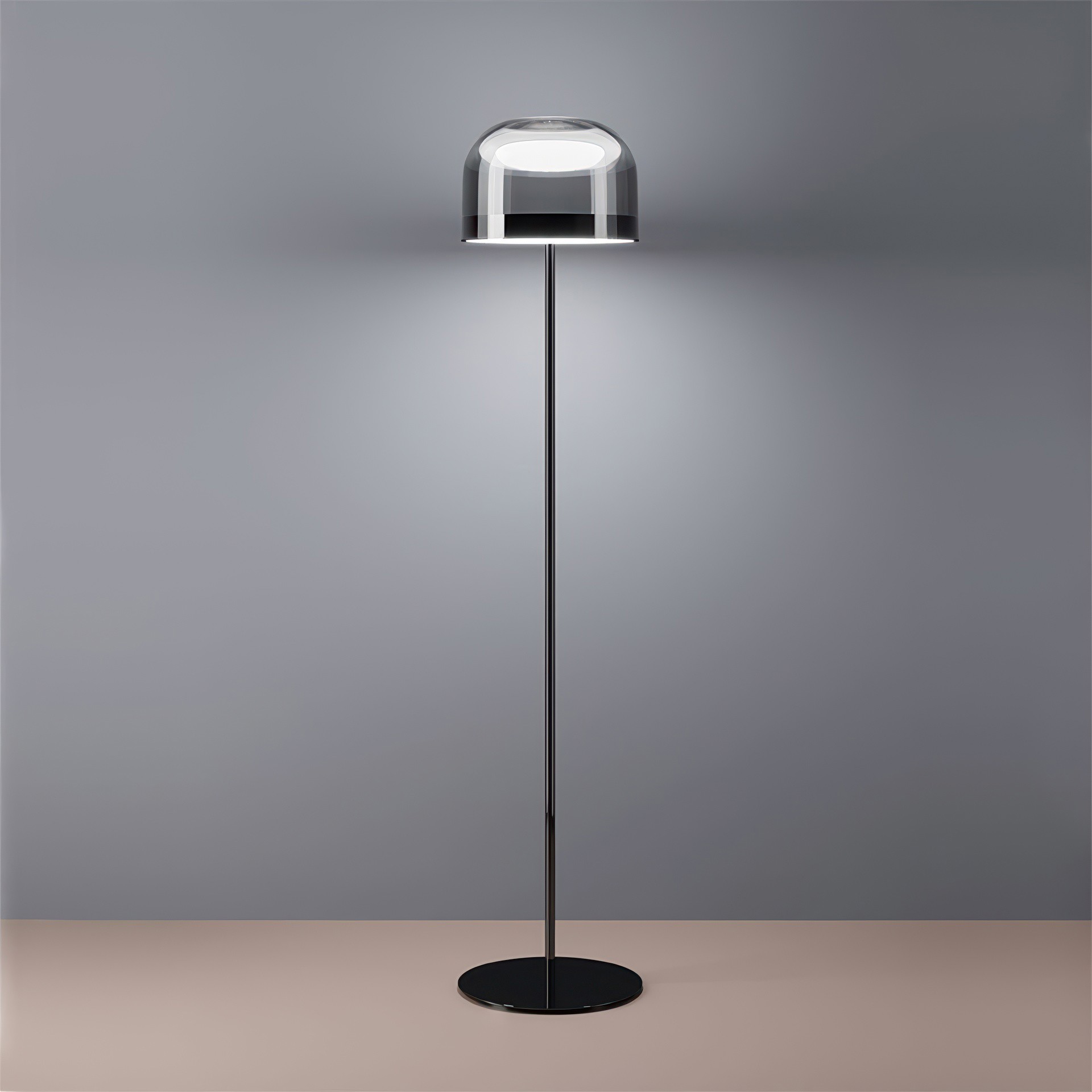 Shine is a contemporary reinterpretation of the classic lamp with a glass shade. The bottom disc produces a downward light output, the upper one illuminates the glass cover.