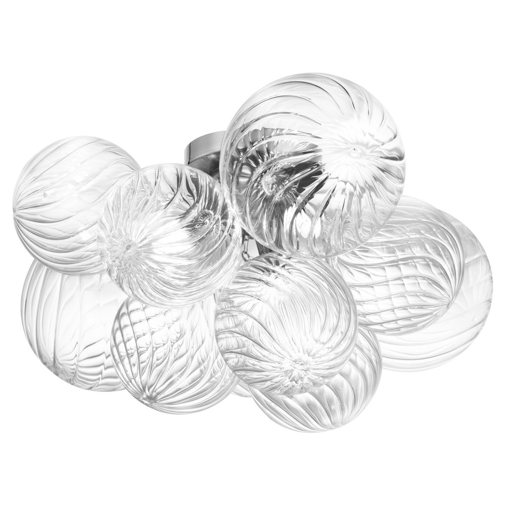 Contemporary Charlize flush mount in spiral clear glass for the ceiling with 3 bulb, G9 socket base 40 Watts max dimmable and UL approved for damp with a one year limited warranty.