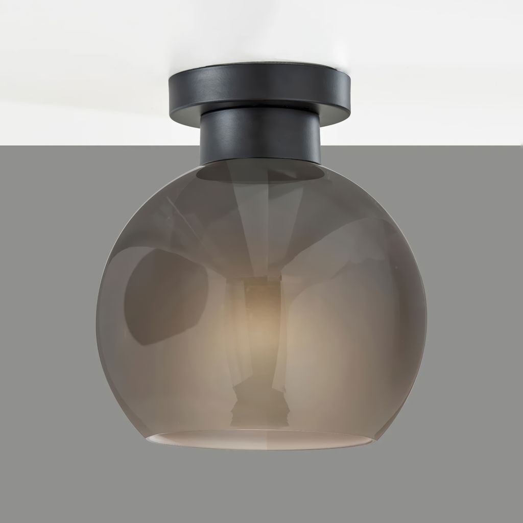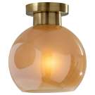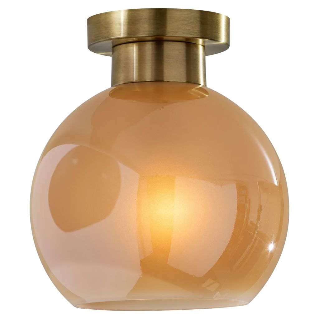 Finished in antique brass, this flush mount fixture exudes elegance and sophistication. Its 9-inch diameter globe-shaped amber glass shade boasts a glossy exterior and frosted interior, casting a warm and inviting glow when illuminated.