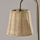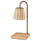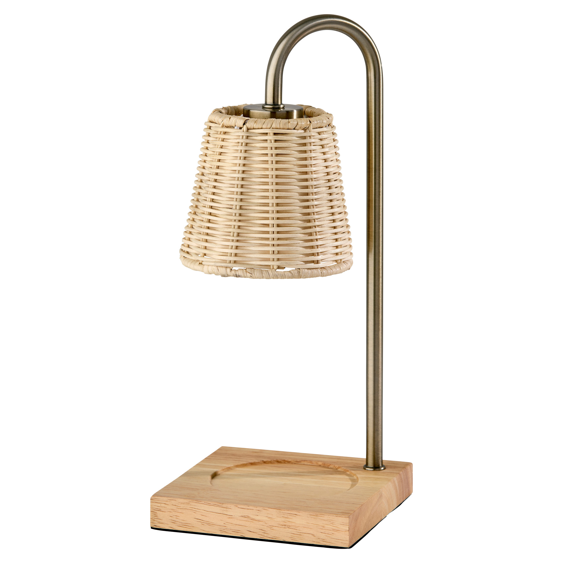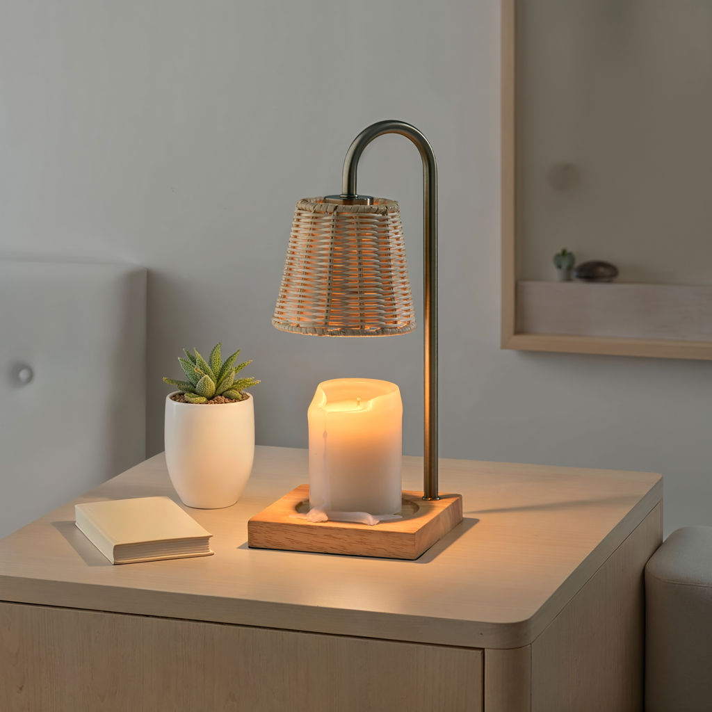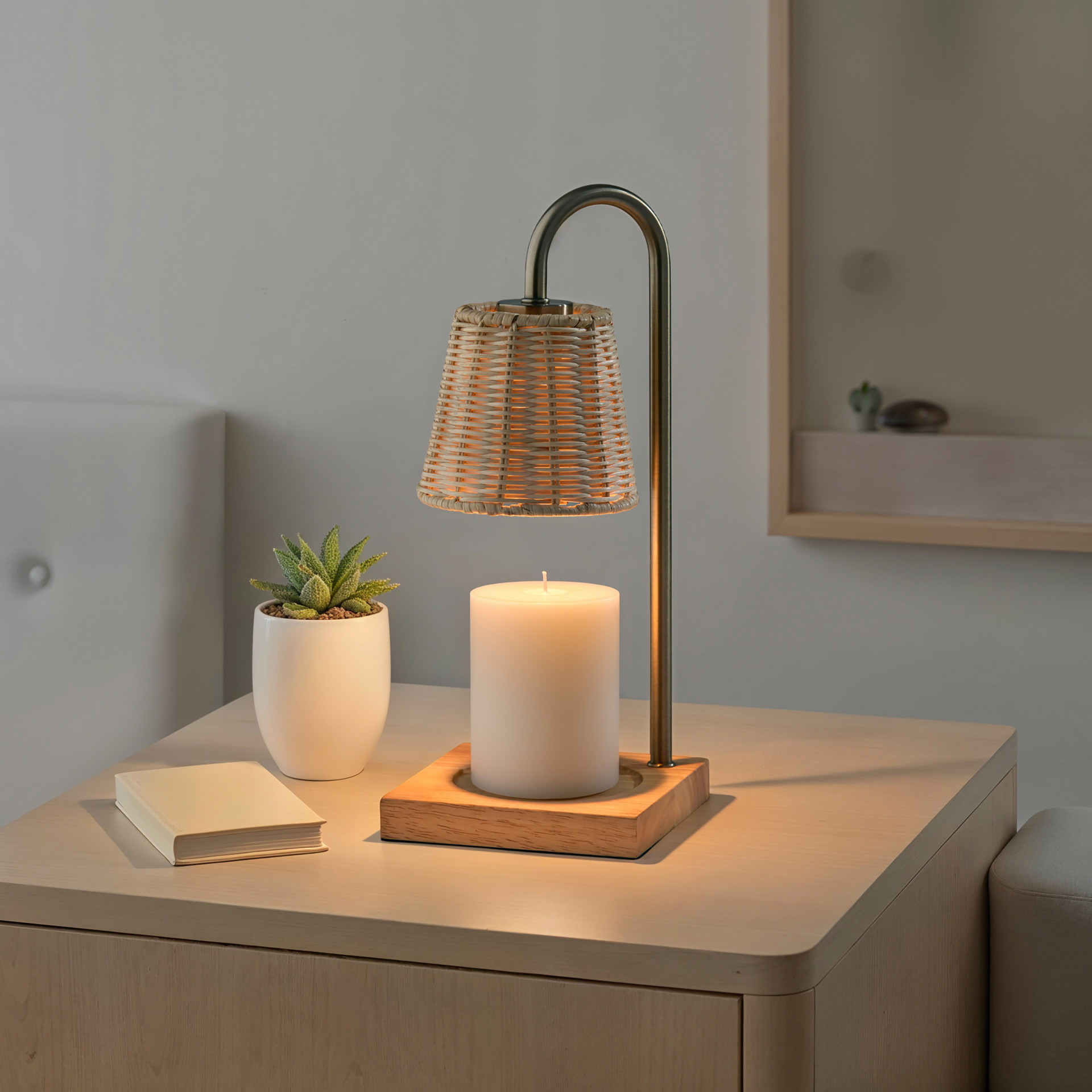 Designed to gently release the fragrance of your favorite candles without an open flame, this beautifully balanced piece features a natural wood base with a sculpted candle holder, a matte black stem, and a woven rattan shade with organic charm.