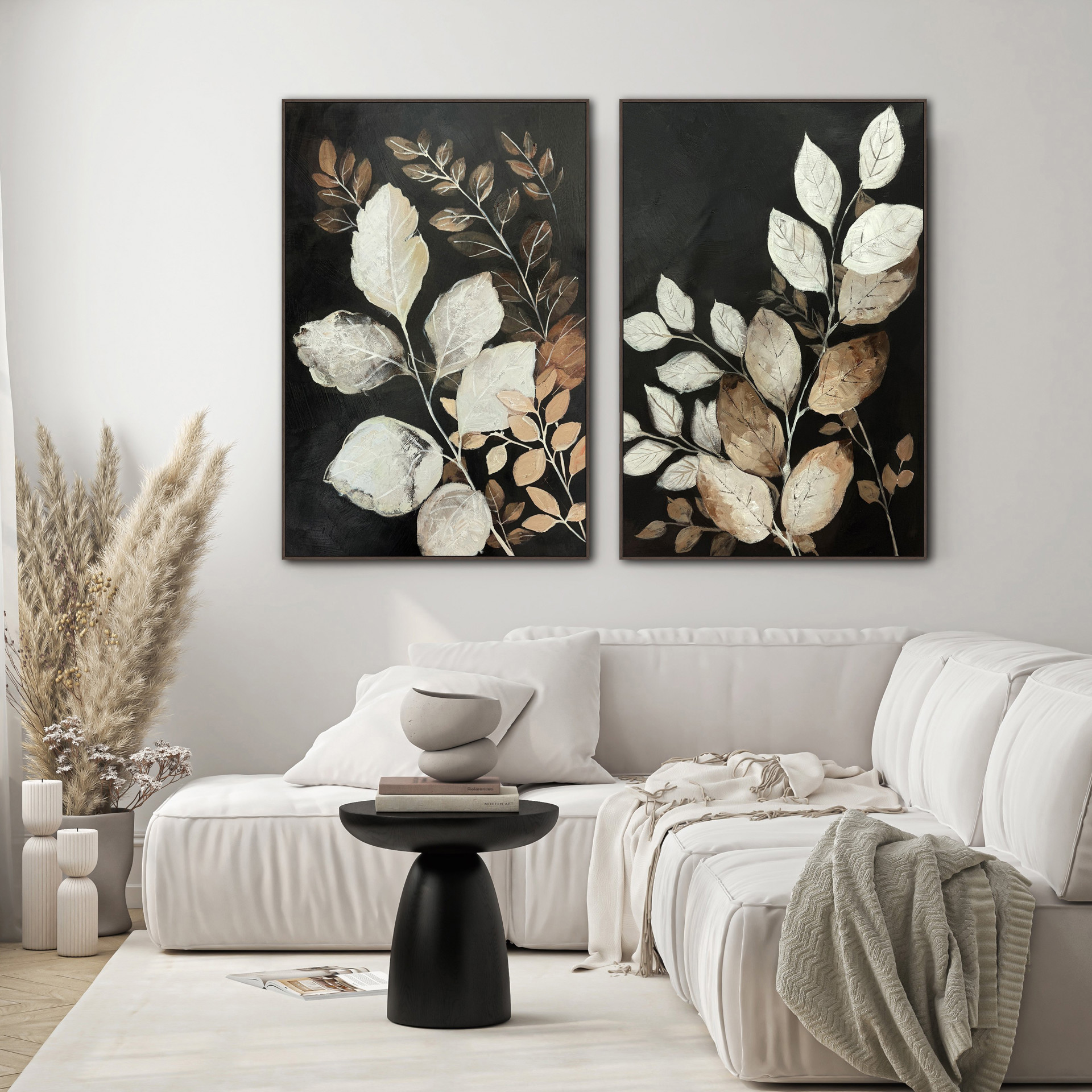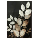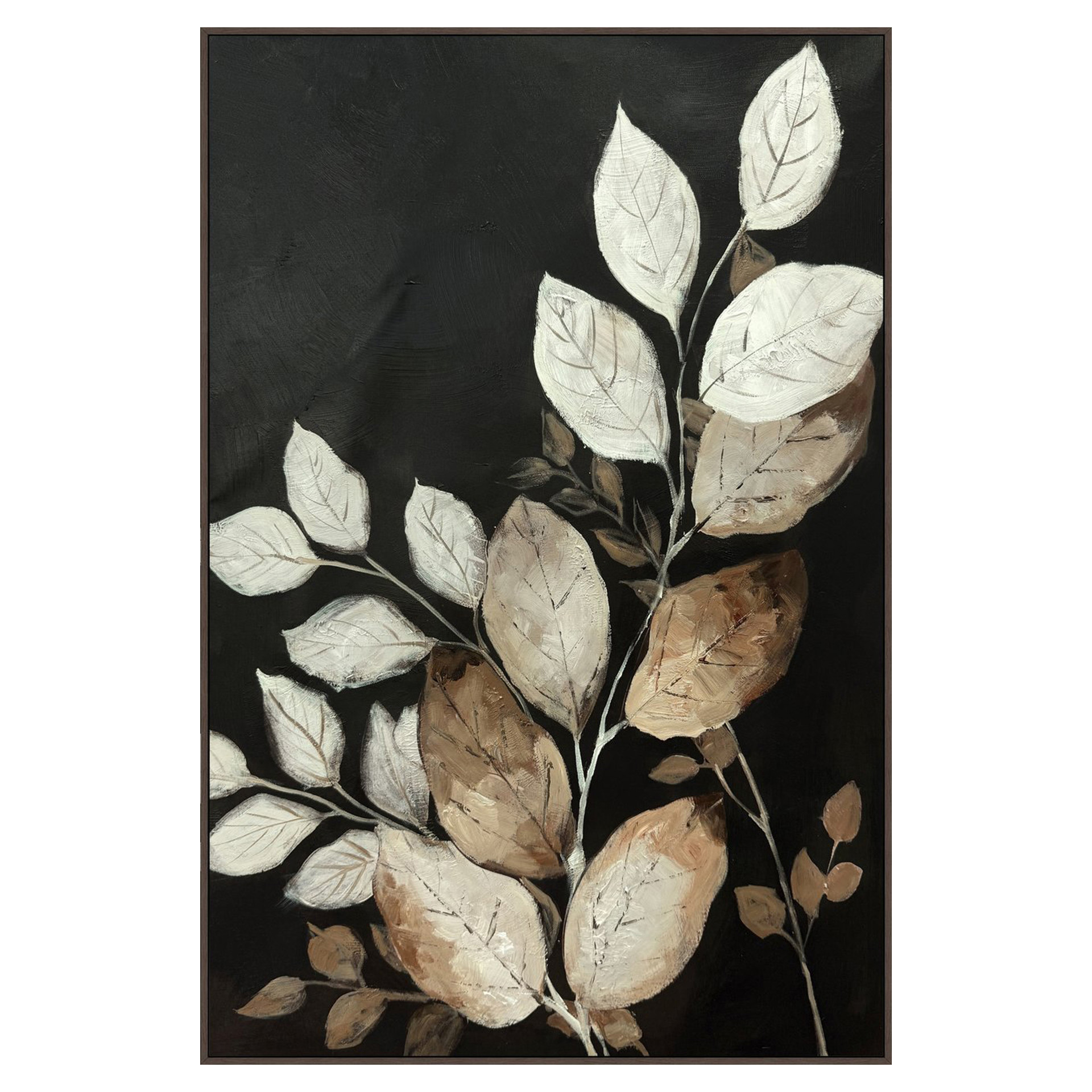 This artwork highlights delicate leaves painted in cream and beige tones, standing out beautifully against a deep black background.