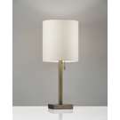 This table lamp has an elegant style that highlights simple materials with a classic silhouette. A thick dark bronze finished metal pole supports a natural textured fabric shade. A tall cylinder shade is contrasted with a compact square-shaped metal base. A simple pull chain turns the lamp on and off. Set this table lamp on your nightstand for a soft, transitional look.
