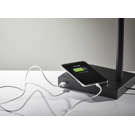 A USB port is located on the side of the base, allowing for easy charging capabilities.
