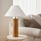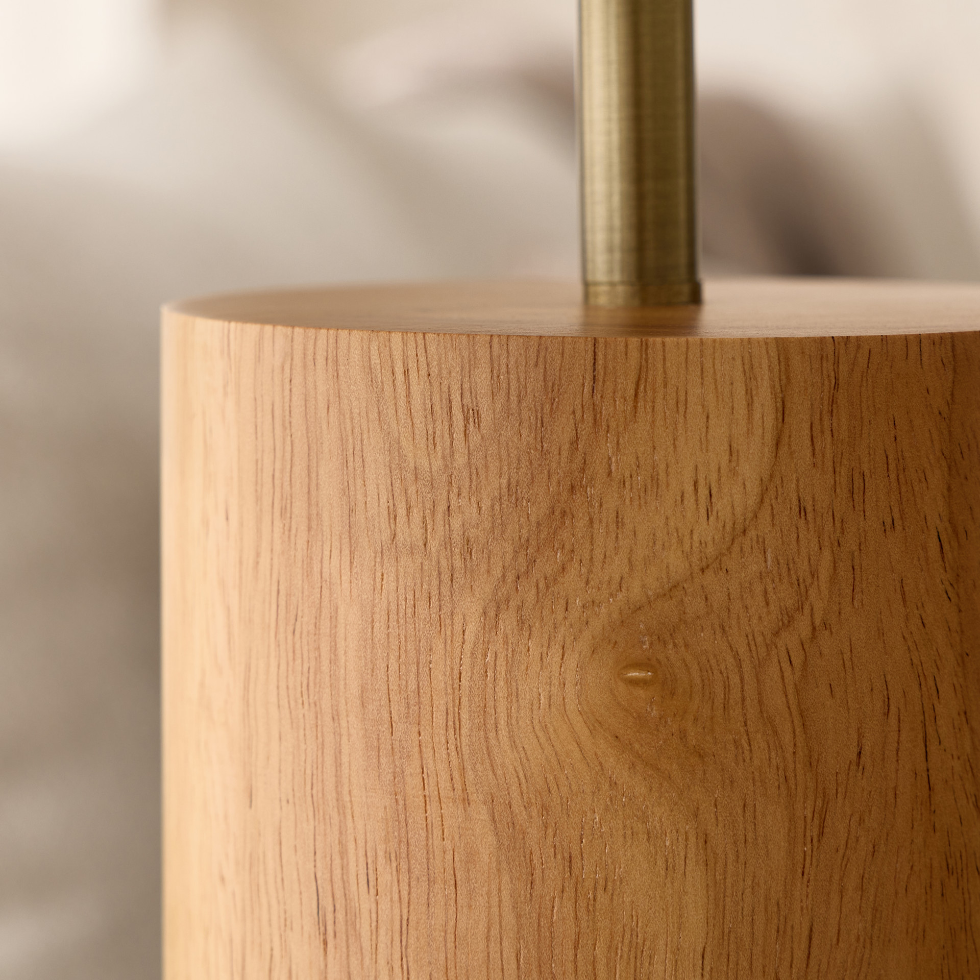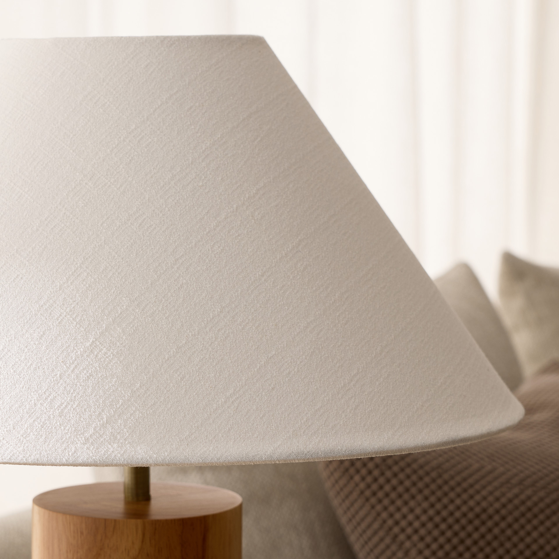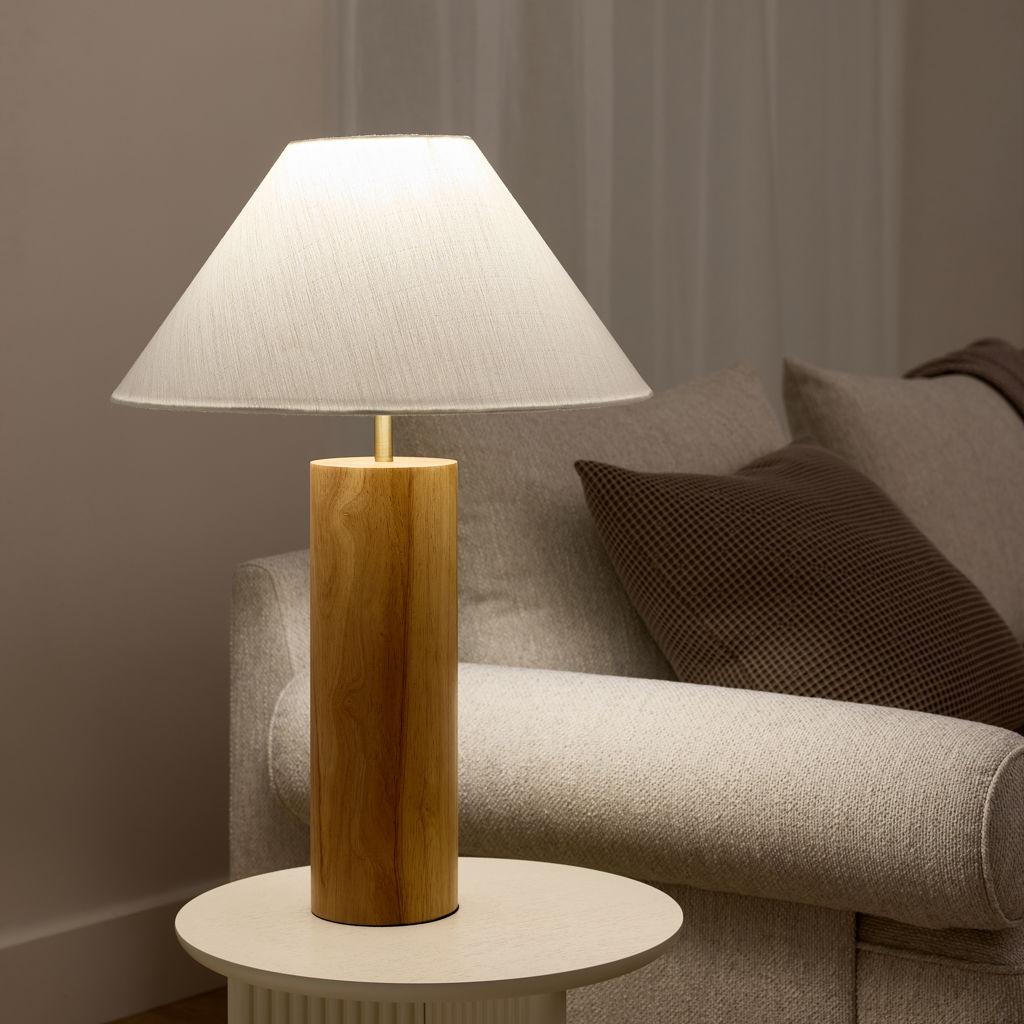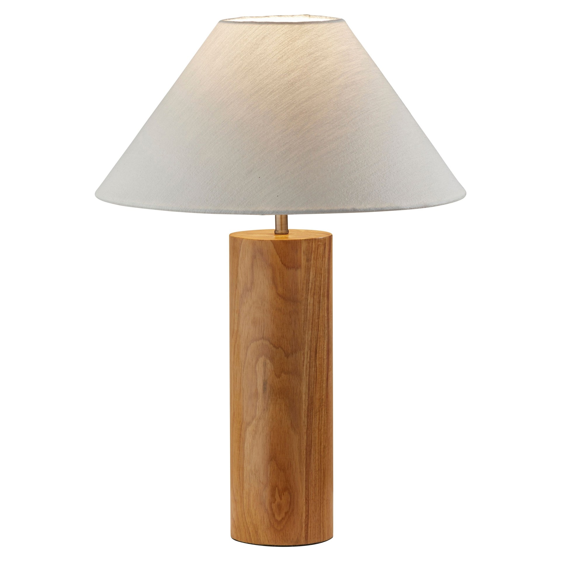 Crafted from natural oak wood with antique brass metal accents, this lamp will add an elegant touch of modern style to your home. The retro-inspired shade is composed of white textured fabric.