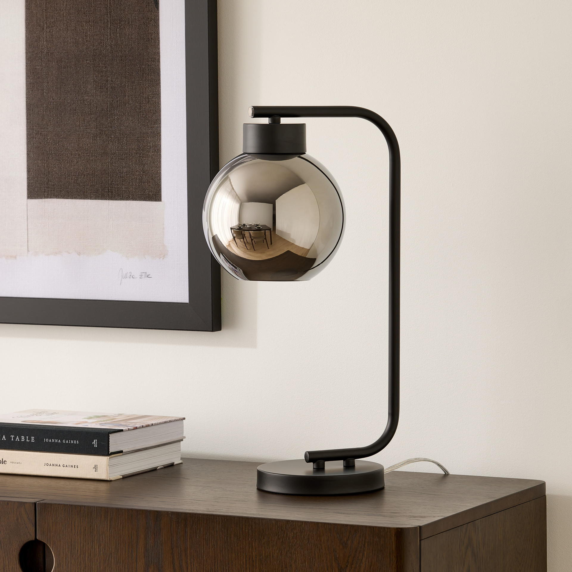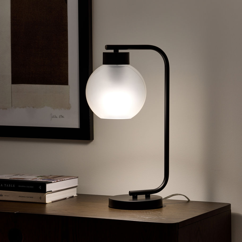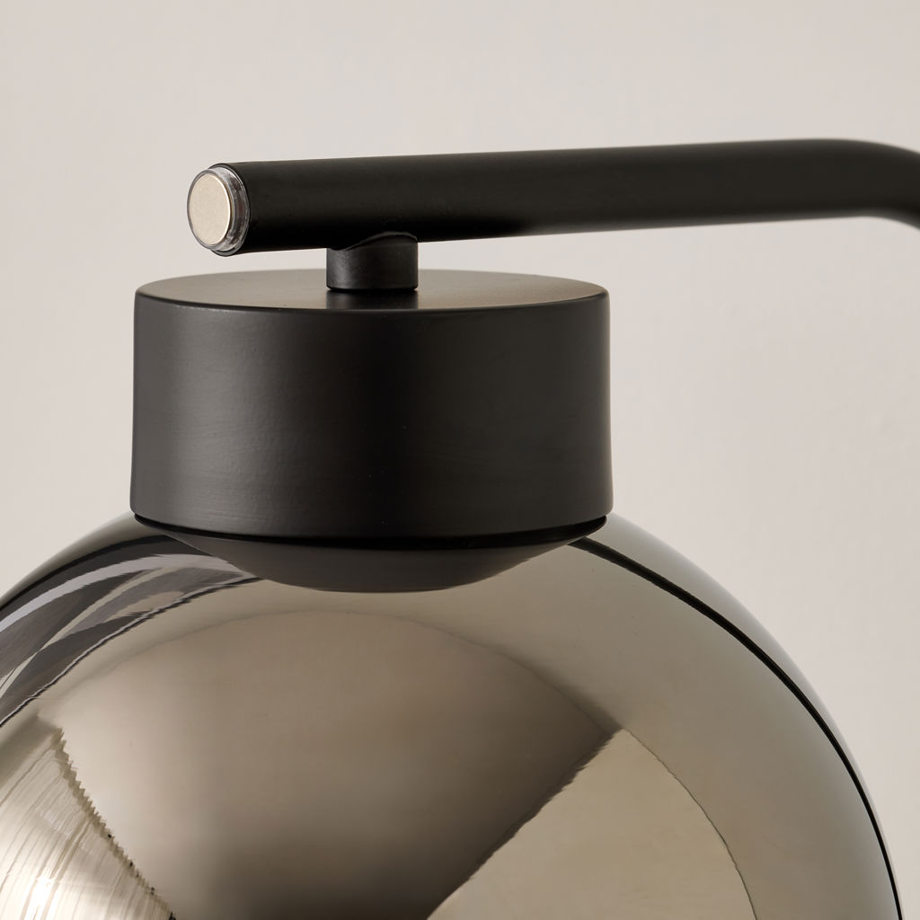 Finished in black and featuring a globe-shaped smoked glass shade, this lamp adds a touch of contemporary flair to any room. The glossy exterior paired with the frosted interior creates a unique lighting effect, casting a warm and inviting glow.