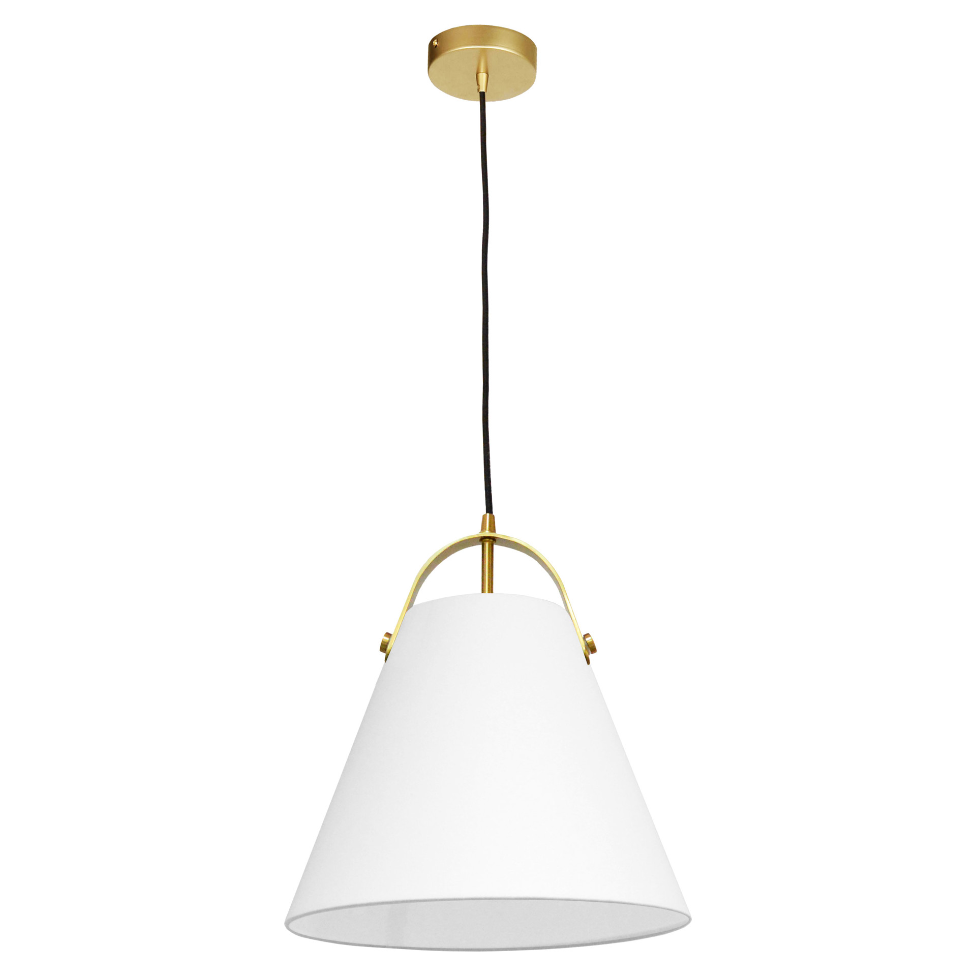 This pendant light combines the softness of white fabric with the warm glow of golden brass to create a timeless, approachable design. The conical shade diffuses a welcoming light, while the arched brass handle adds a distinctive touch of sophistication.