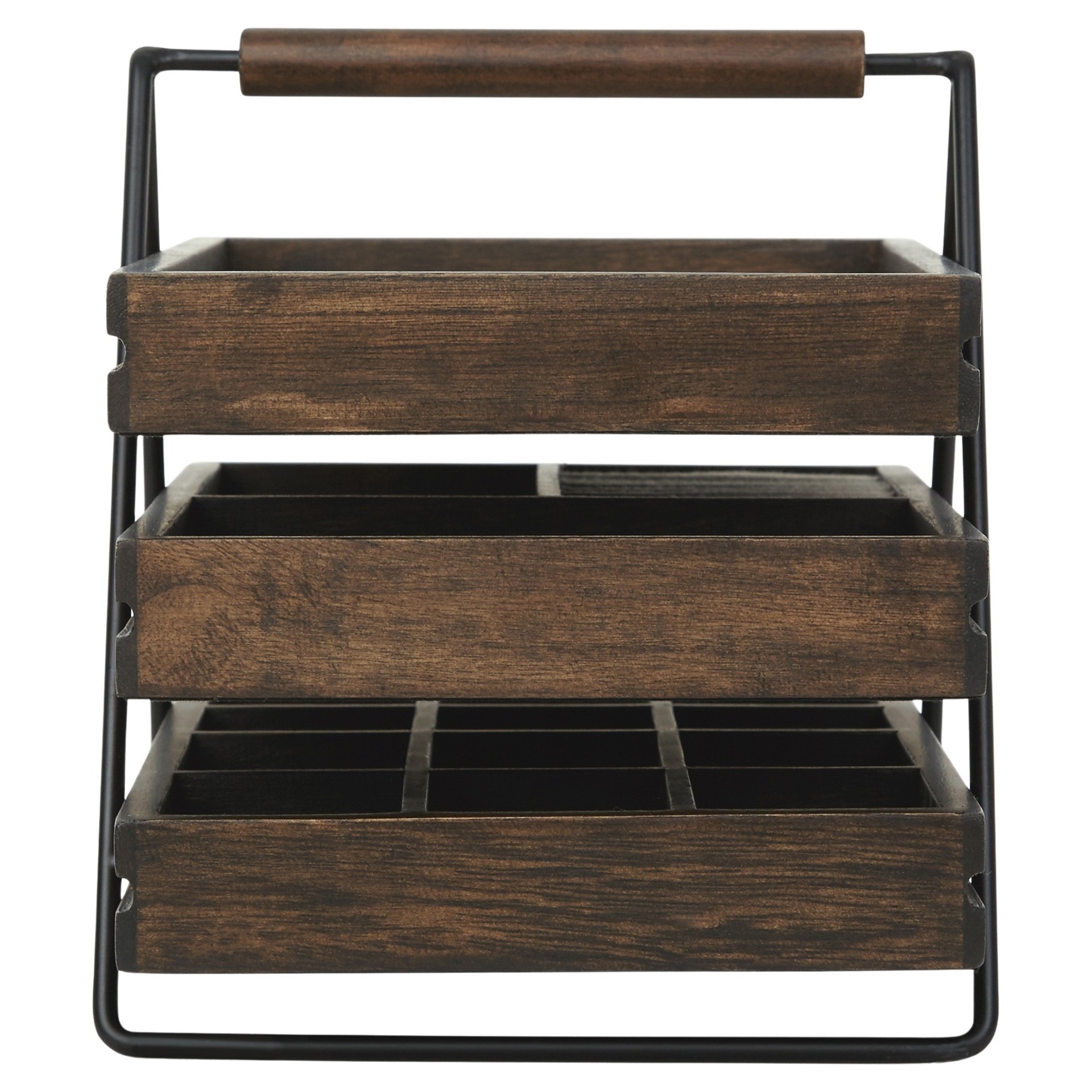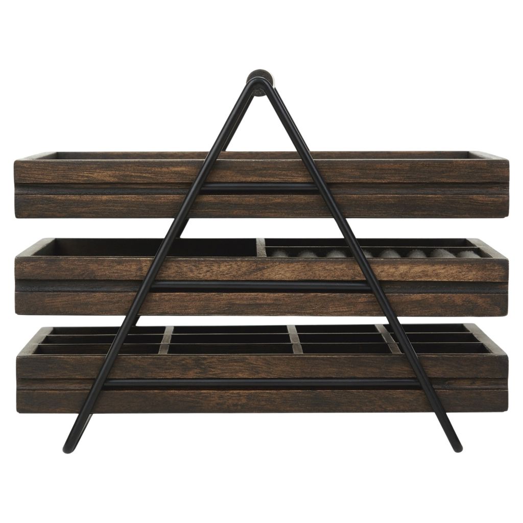 Made of high-quality, Rubber wood with an elegant, walnut finish, and a black metal wire frame for stacking its trays.