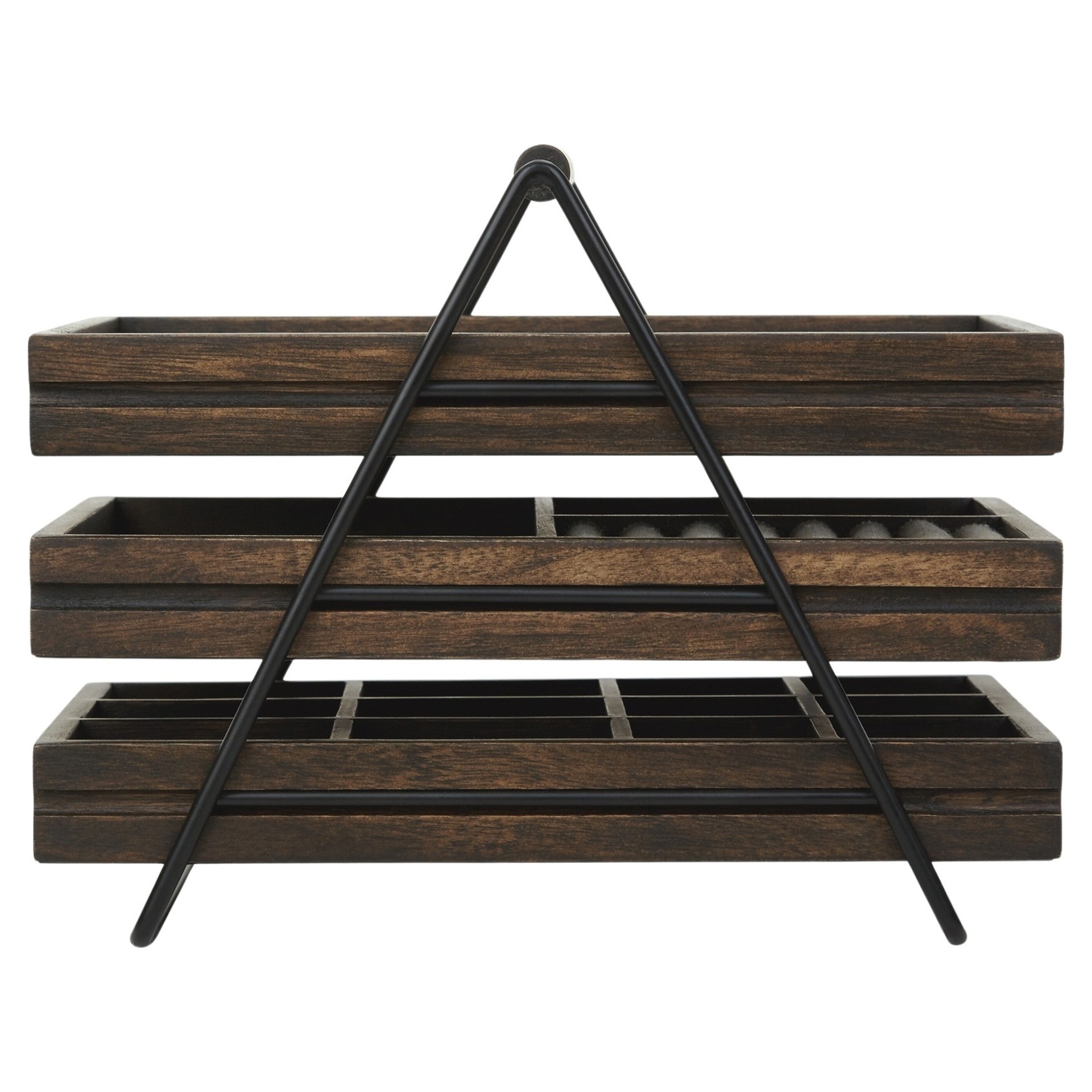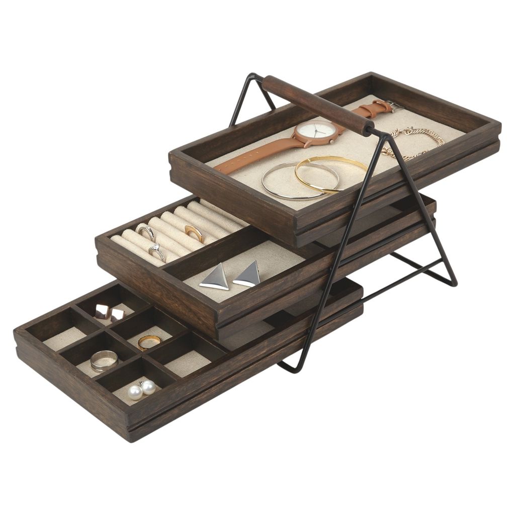 The Terrace Jewelry Tray features three stacked trays, each with dividers optimized for organizing jewelry and keeping it safe.