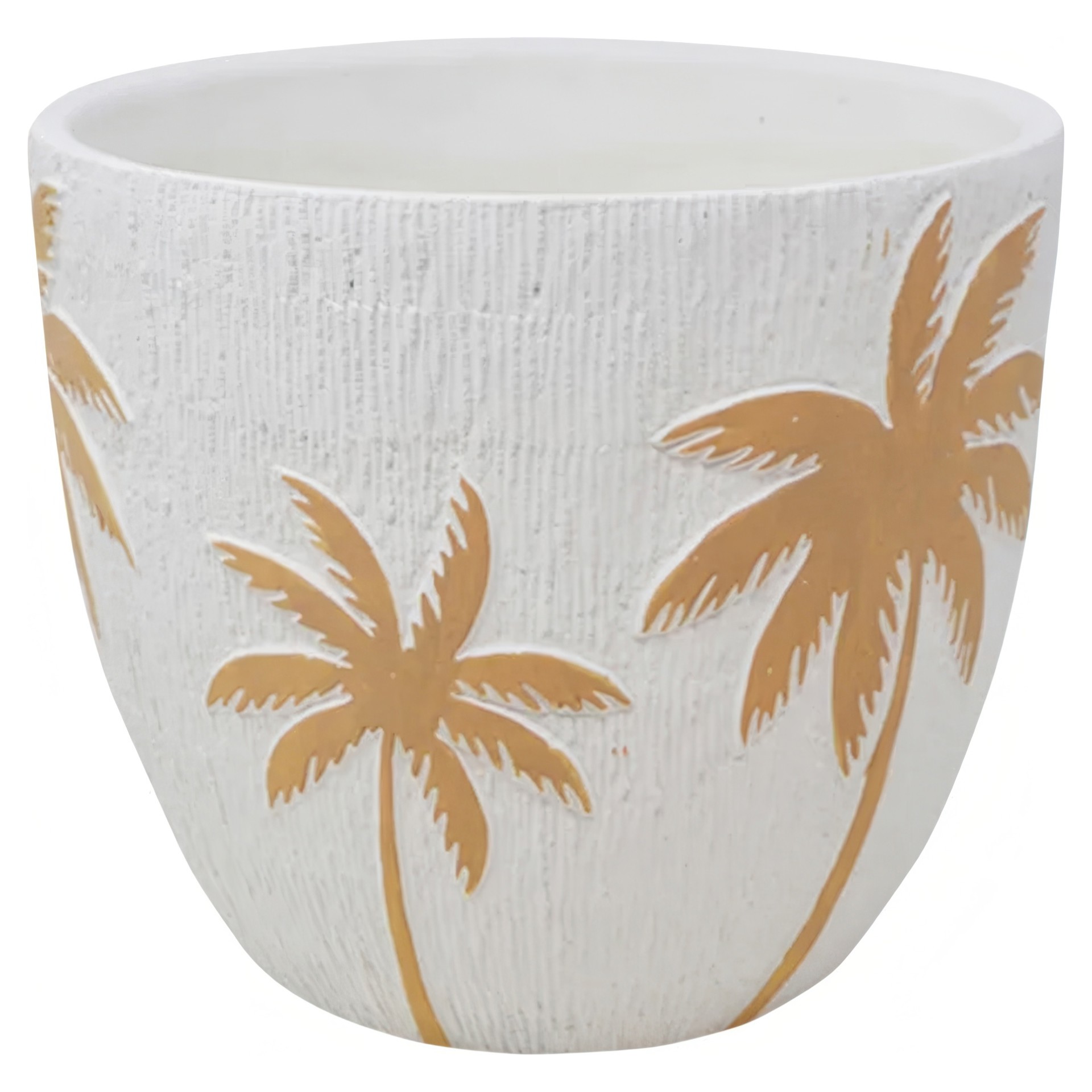 This white ceramic pot features a golden palm tree pattern, bringing a tropical and summery vibe. Its textured design and natural tones make it a perfect decorative piece for adding a touch of escape to your home or garden.