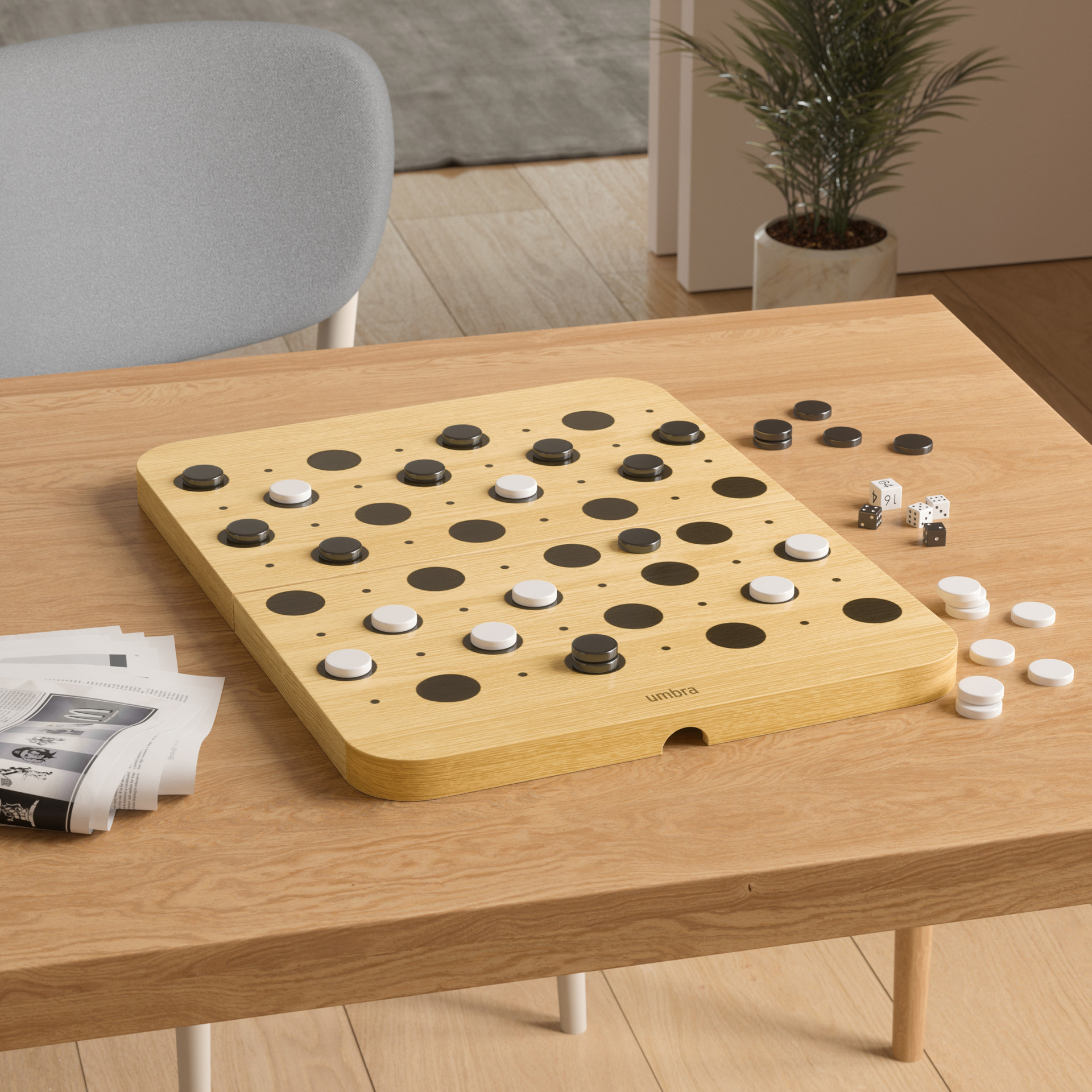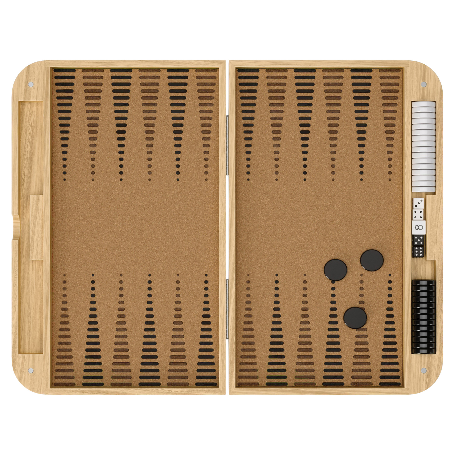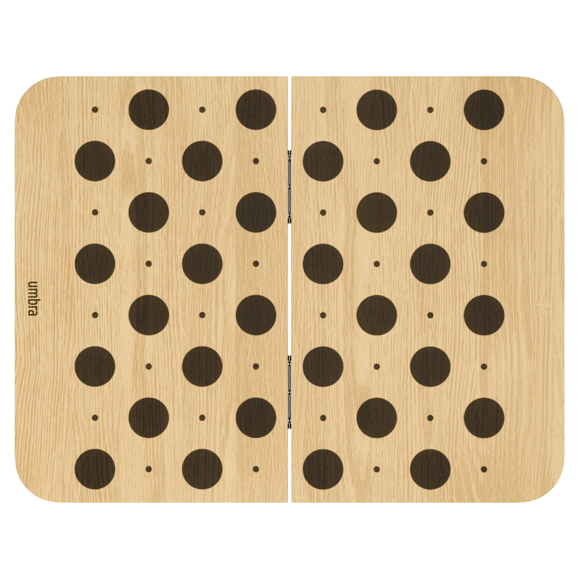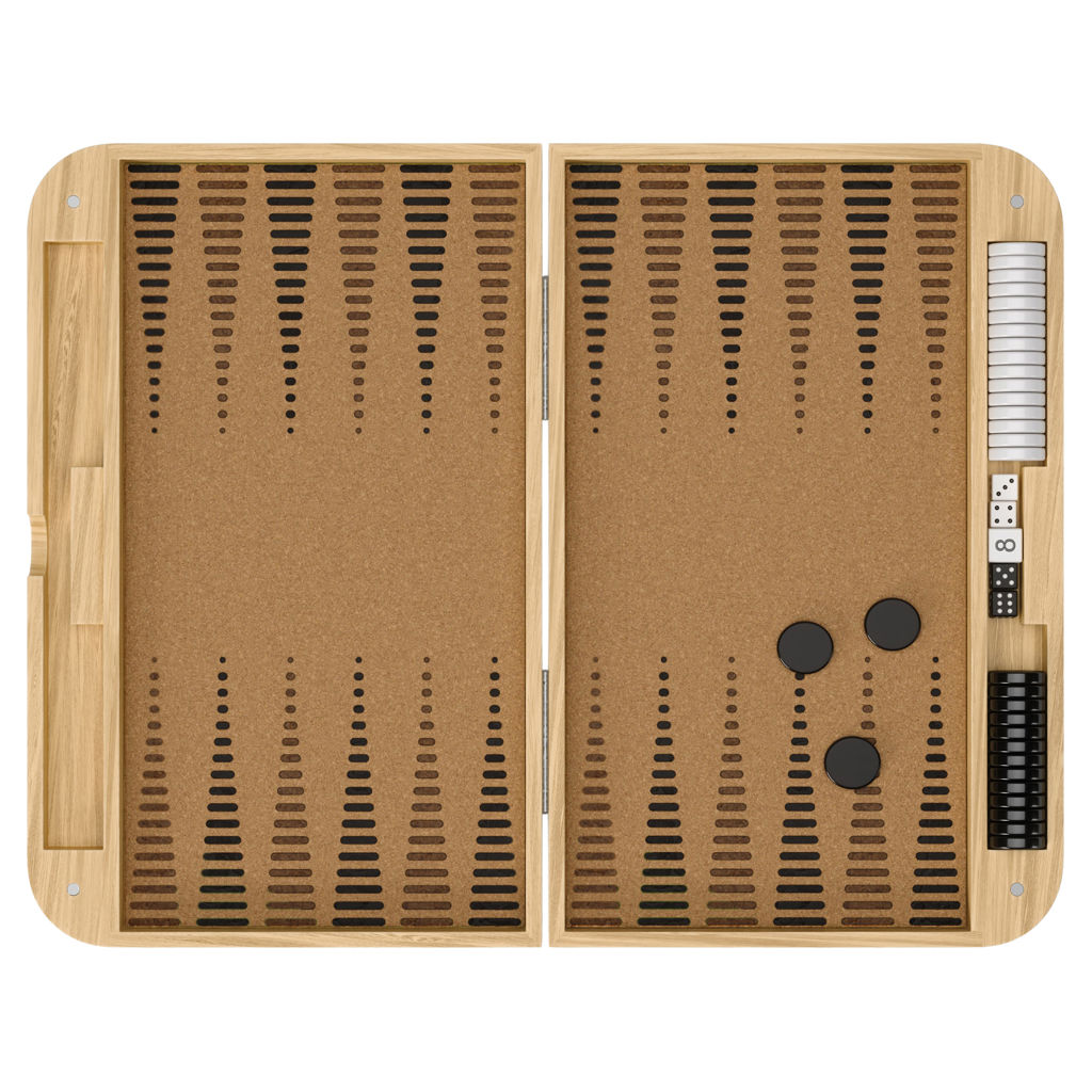 Blitz folds easily in half for convenient storage, transport, or display. Open it to reveal a checkers board printed on warm ash wood, with a soft cork interior for a pleasant playing experience.