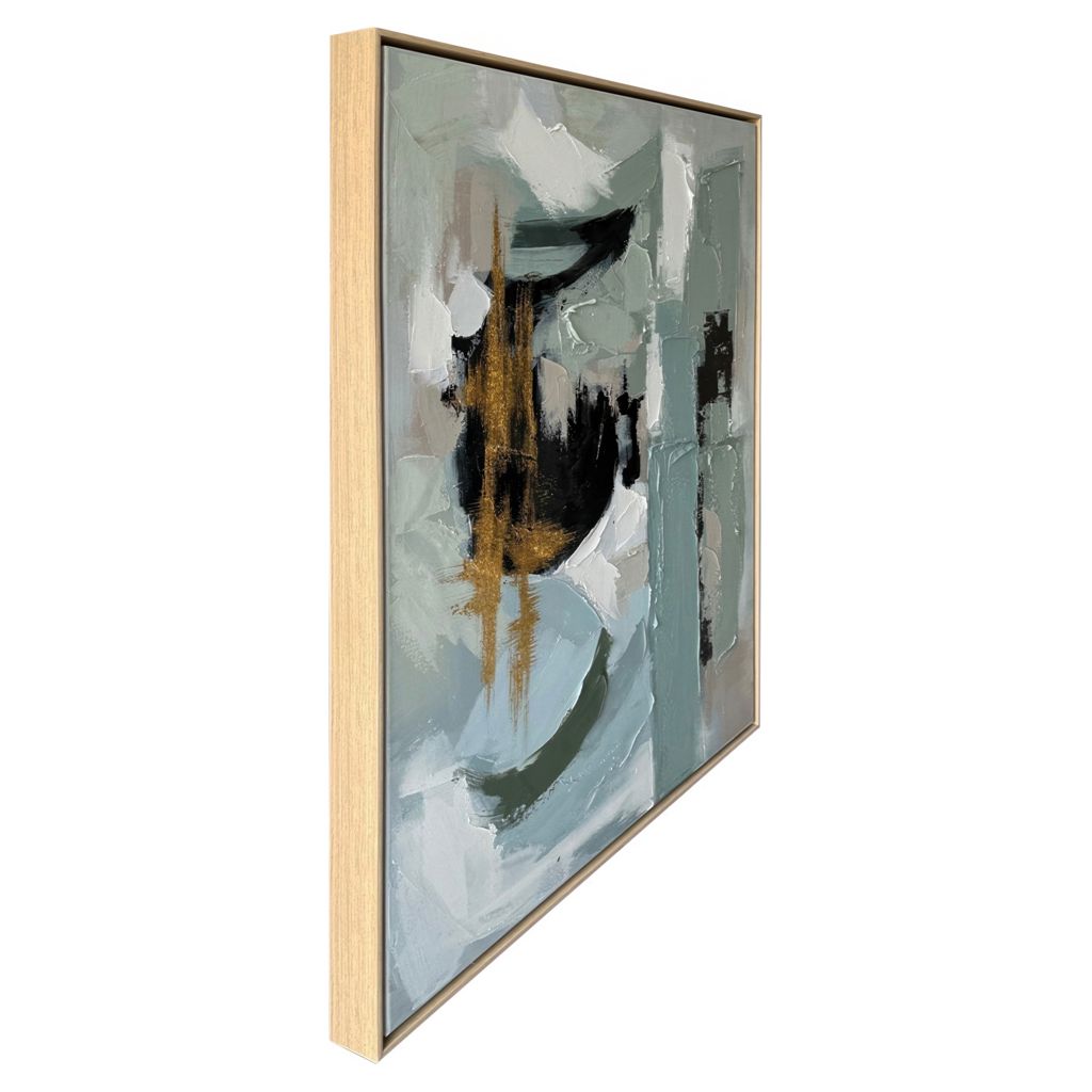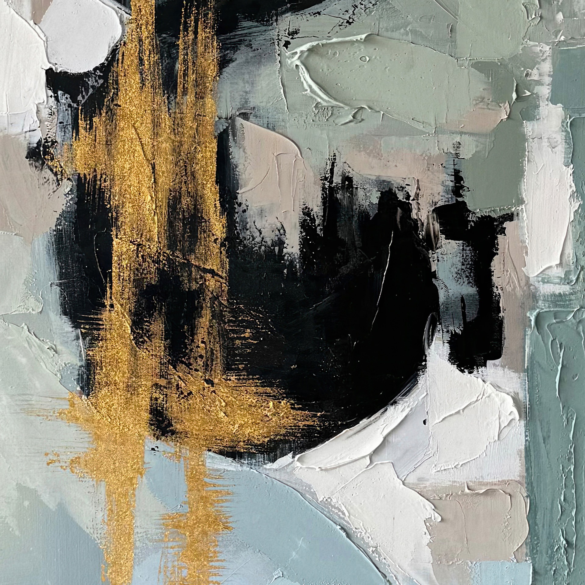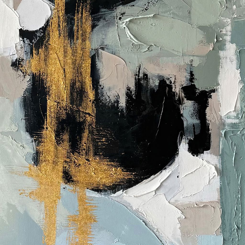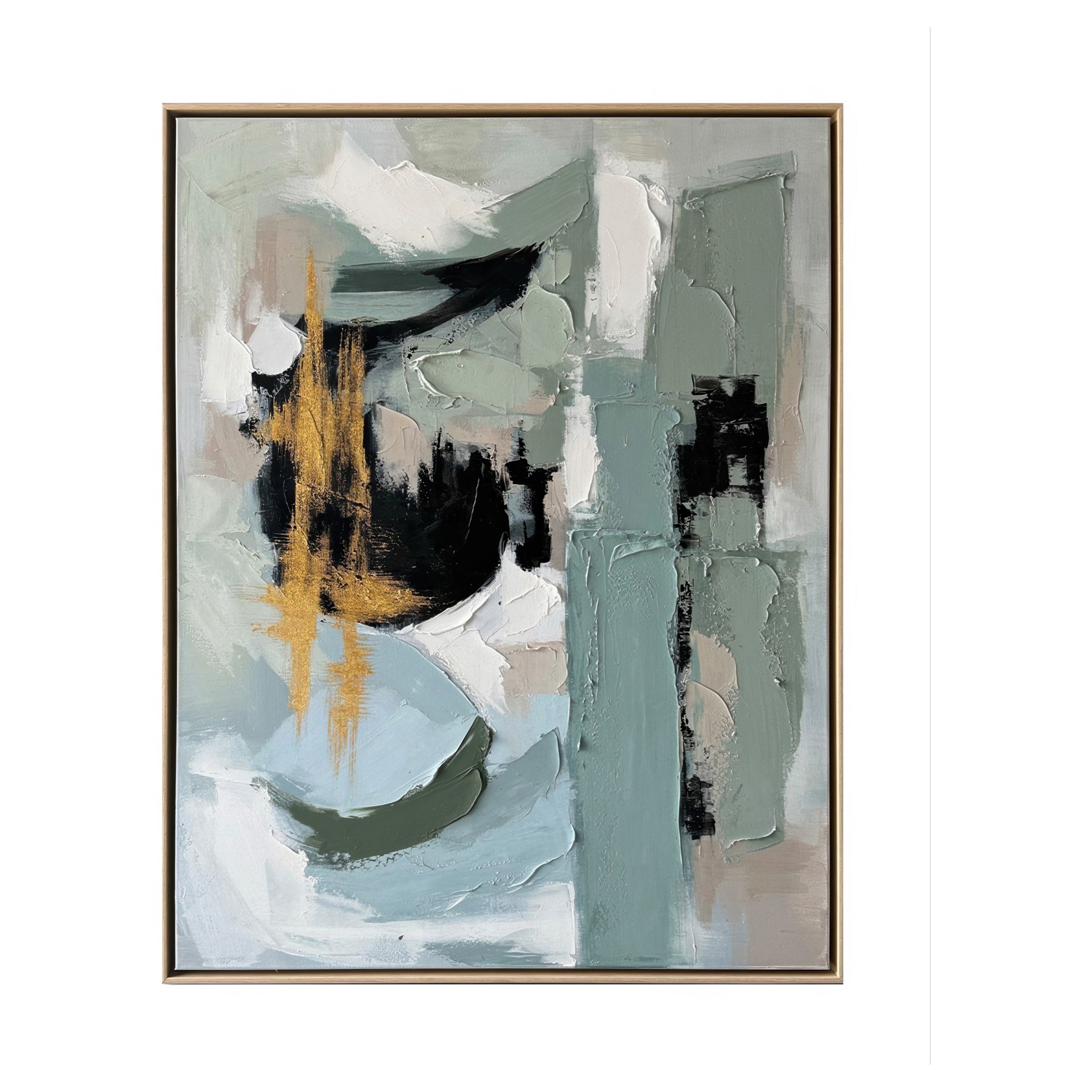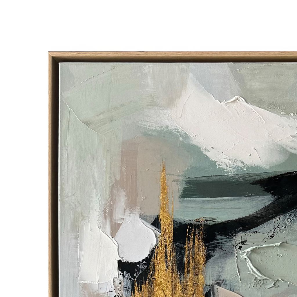 The Auri abstract painting with its rich gold leaf accents framed in 36x48 will elevate your space with 100% hand-painted wall art, blending modern sophistication with artisanal craftsmanship.