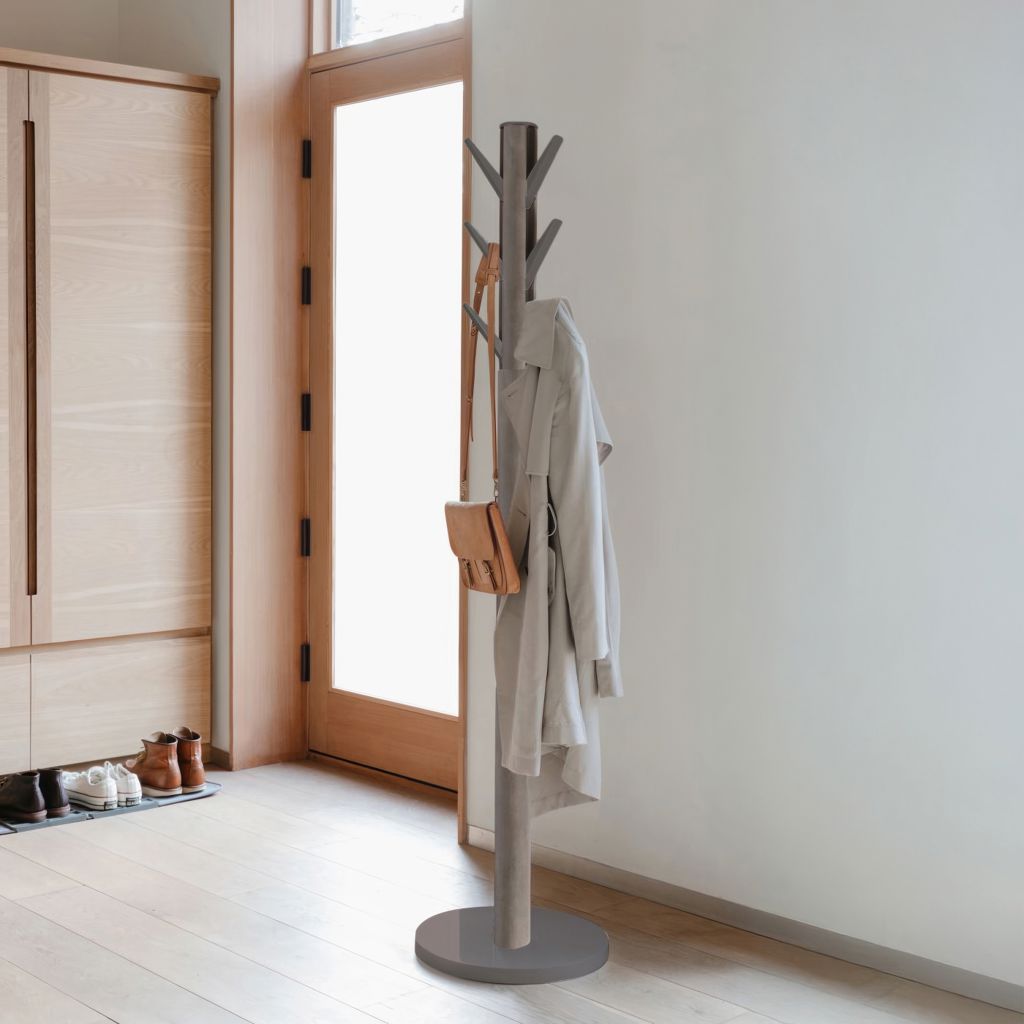 This wooden coat rack stands tall and sleek with 9 folding hooks, providing ample storage space. It can be easily tucked away when not in use. Made of wood, it has a tree-like aesthetic, yet is completely modern.