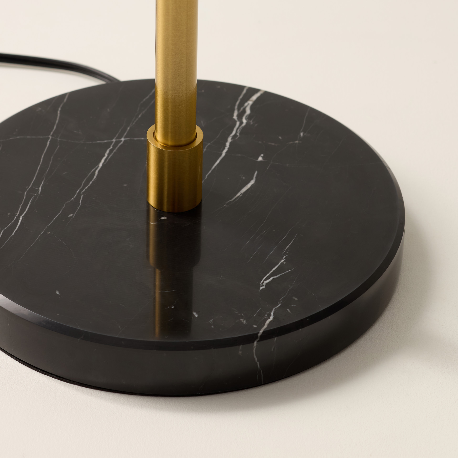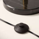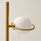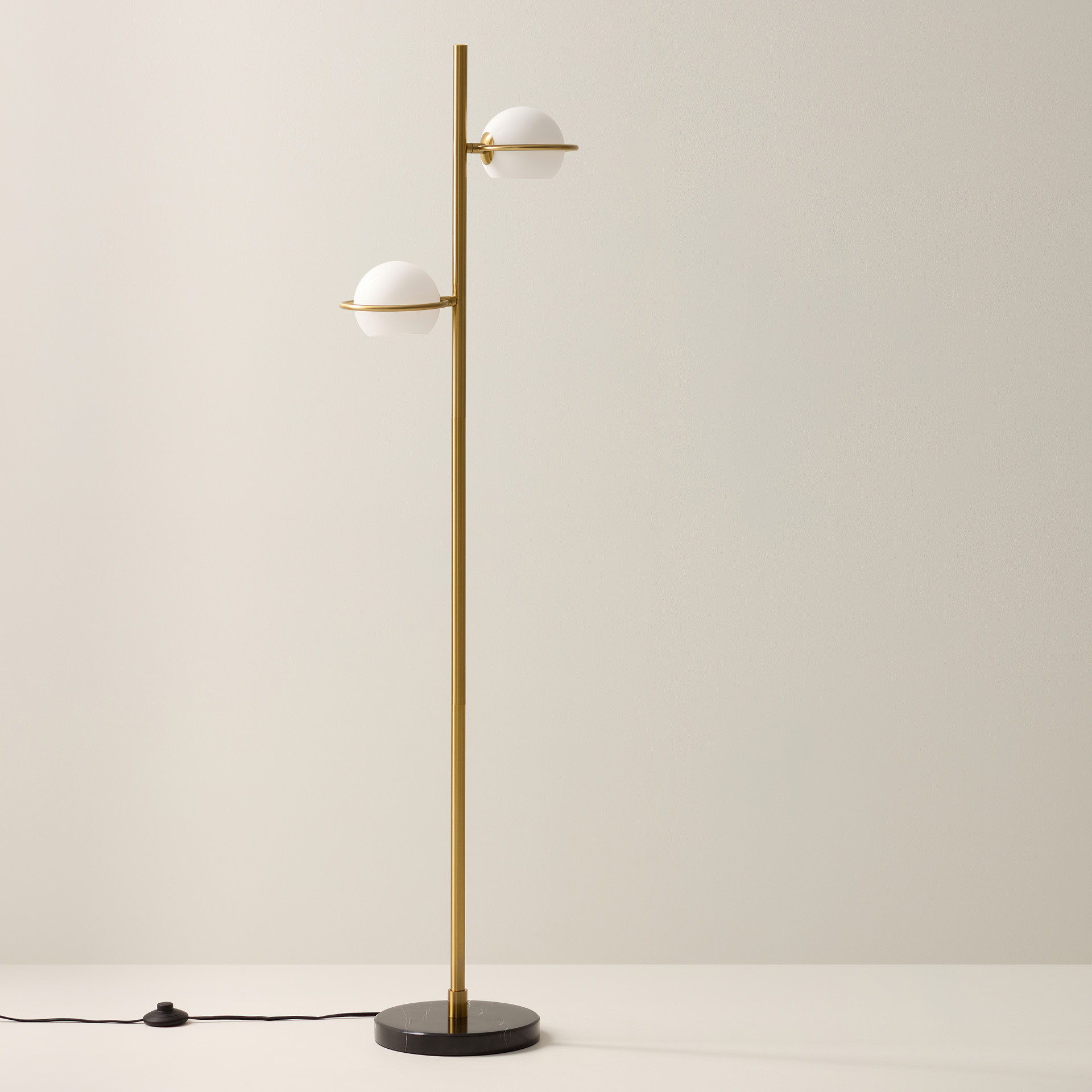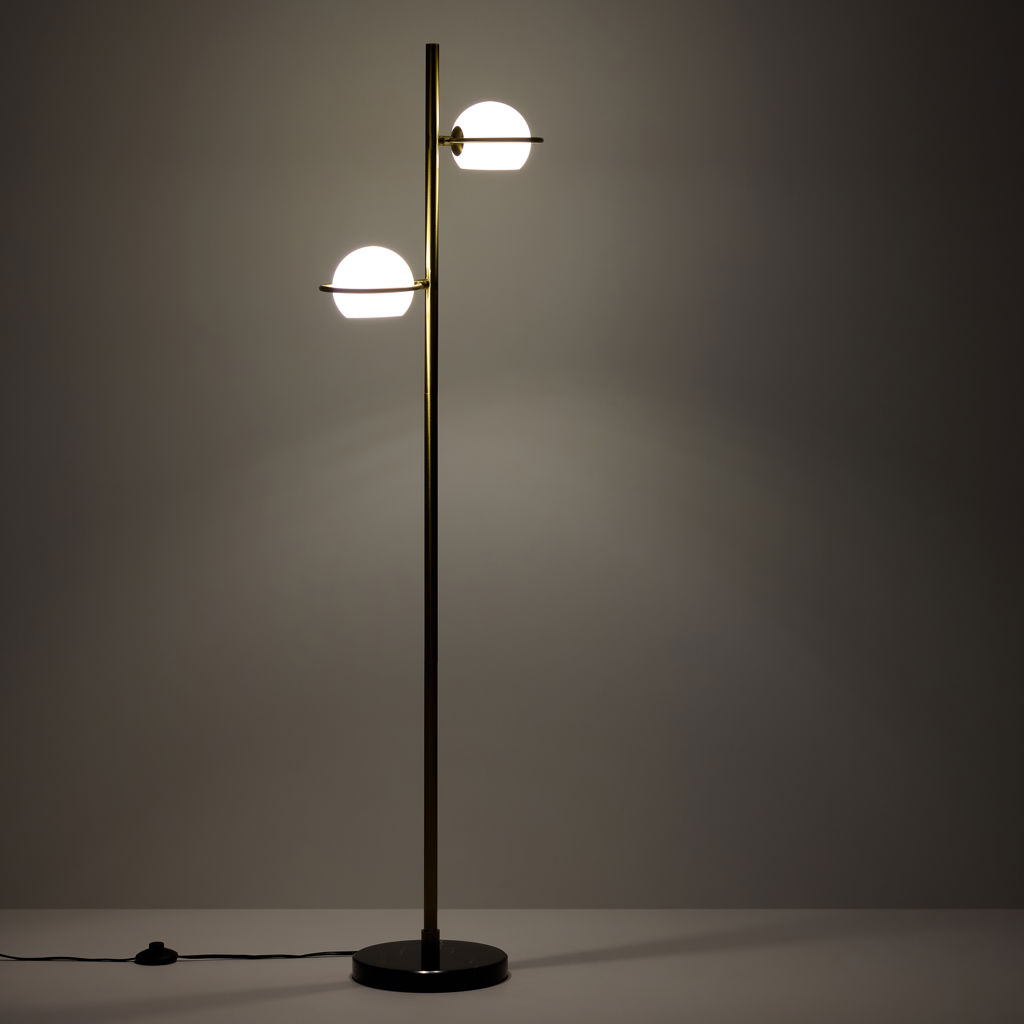 This metal floor lamp with two bulbs features gold accents, glass globes, and a black marble base. The solid, polished black marble base provides both elegance and stability.