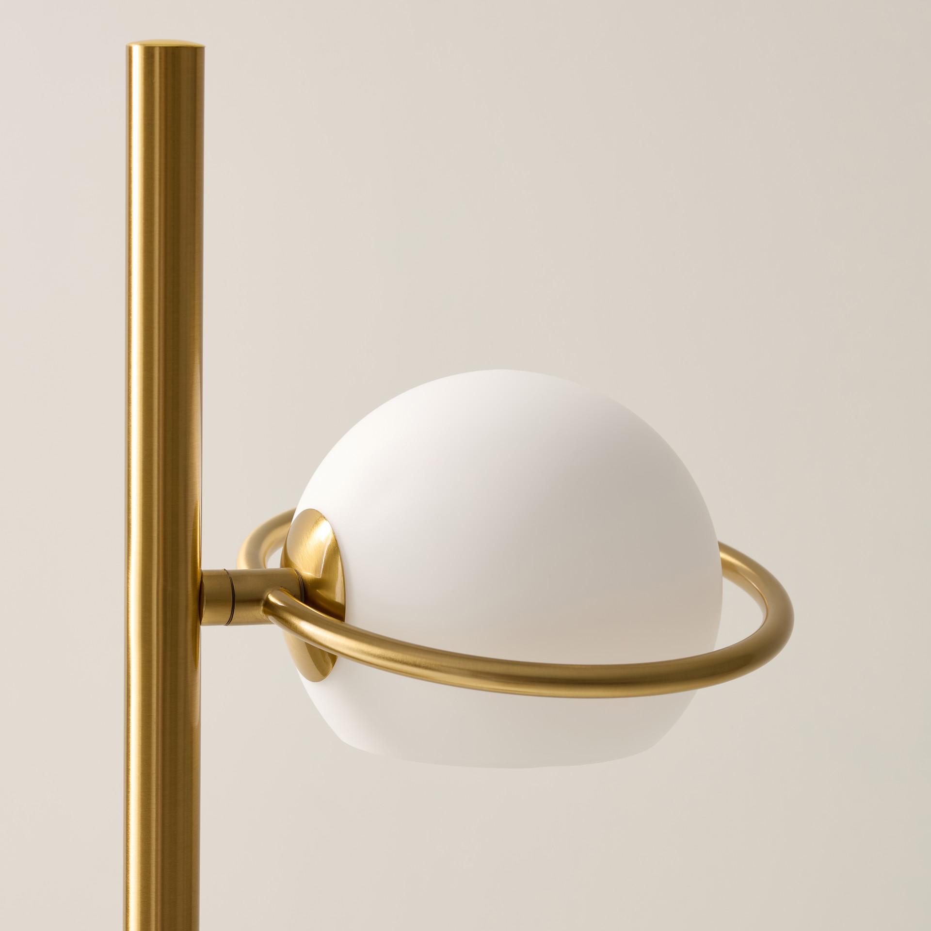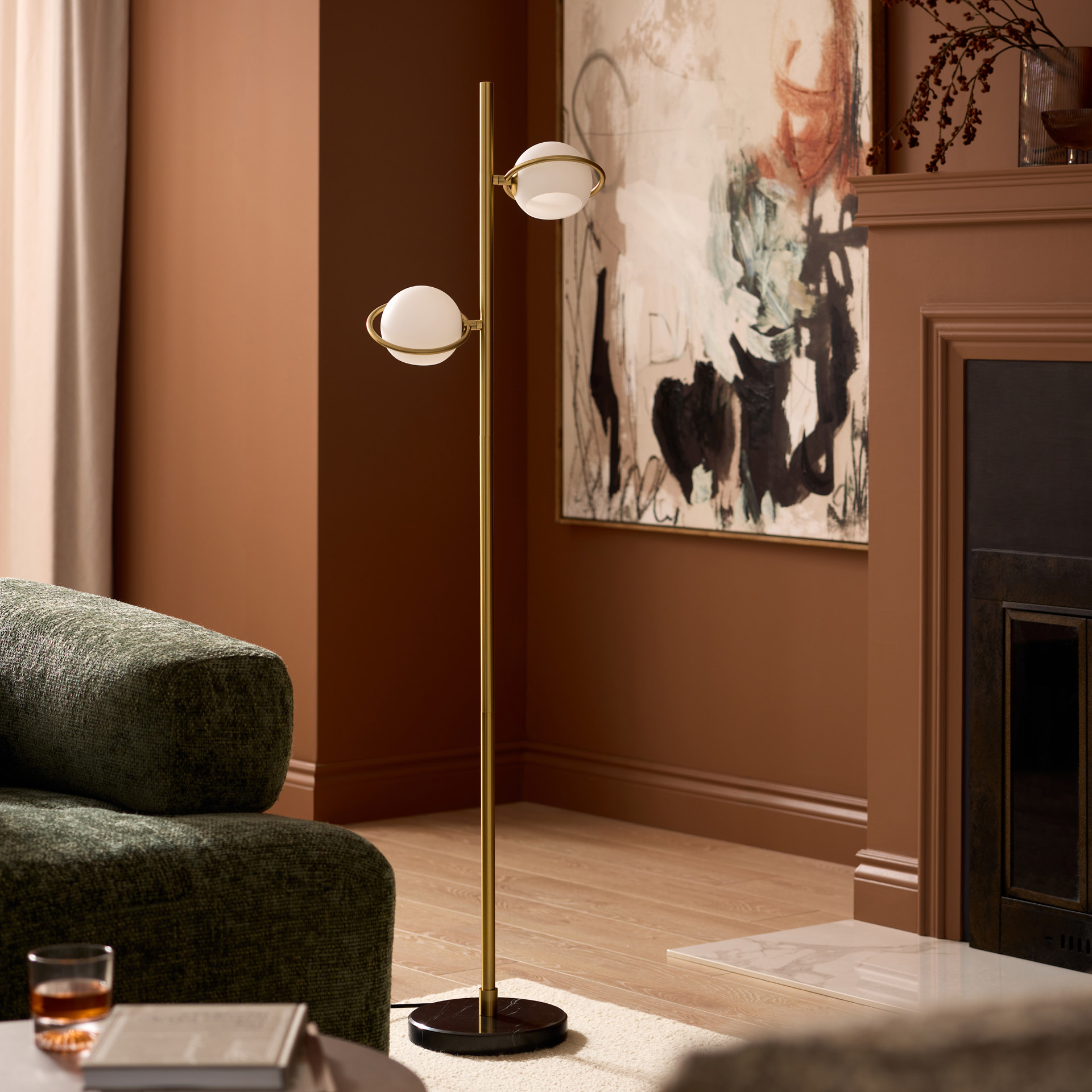 At the ends of the metal arms, the two frosted glass globes diffuse a soft light, creating a warm, ambient glow throughout your home.