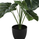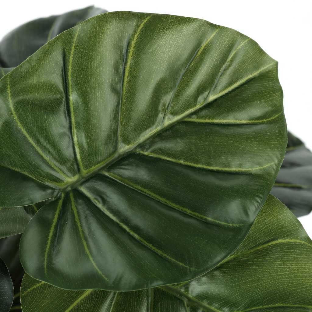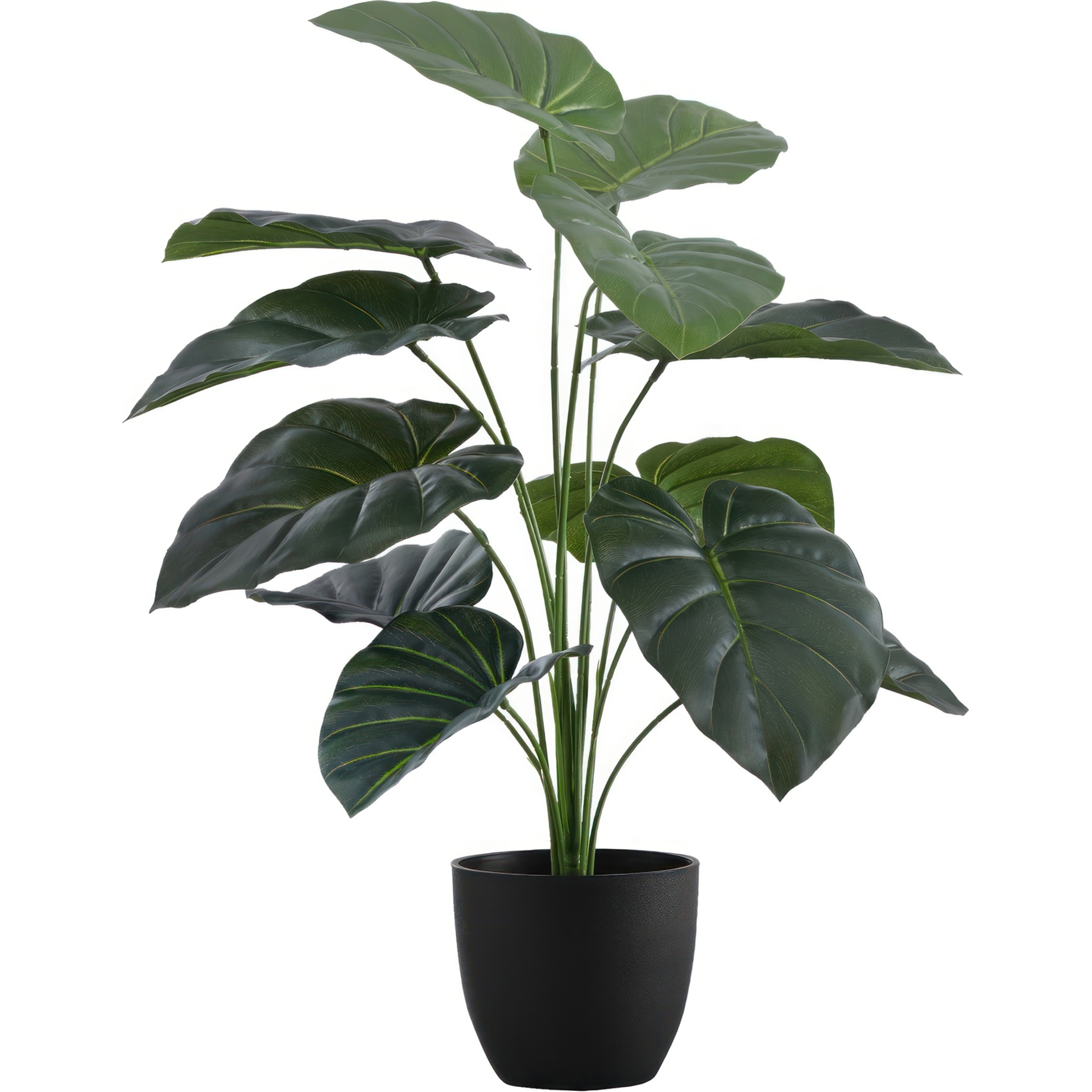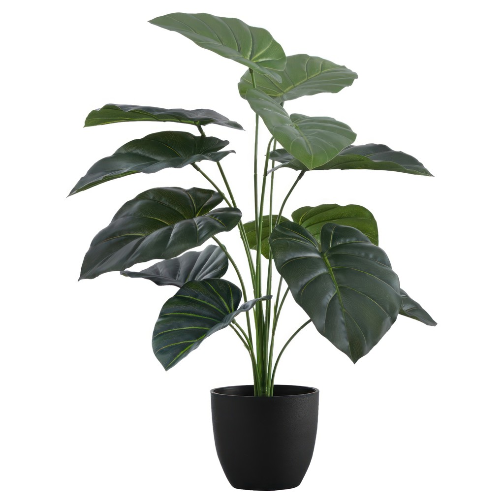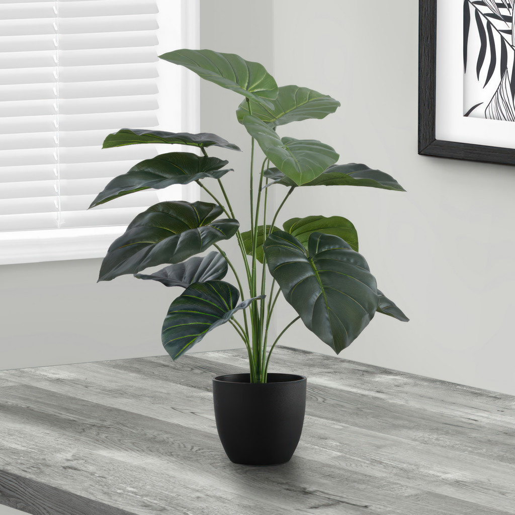 This environmentally friendly faux plant requires no watering, trimming, or maintenance. Already potted in cement and foam in a neutral 5" black pot, this lifelike Alocasia plant is the perfect decorative accent for any home or office.