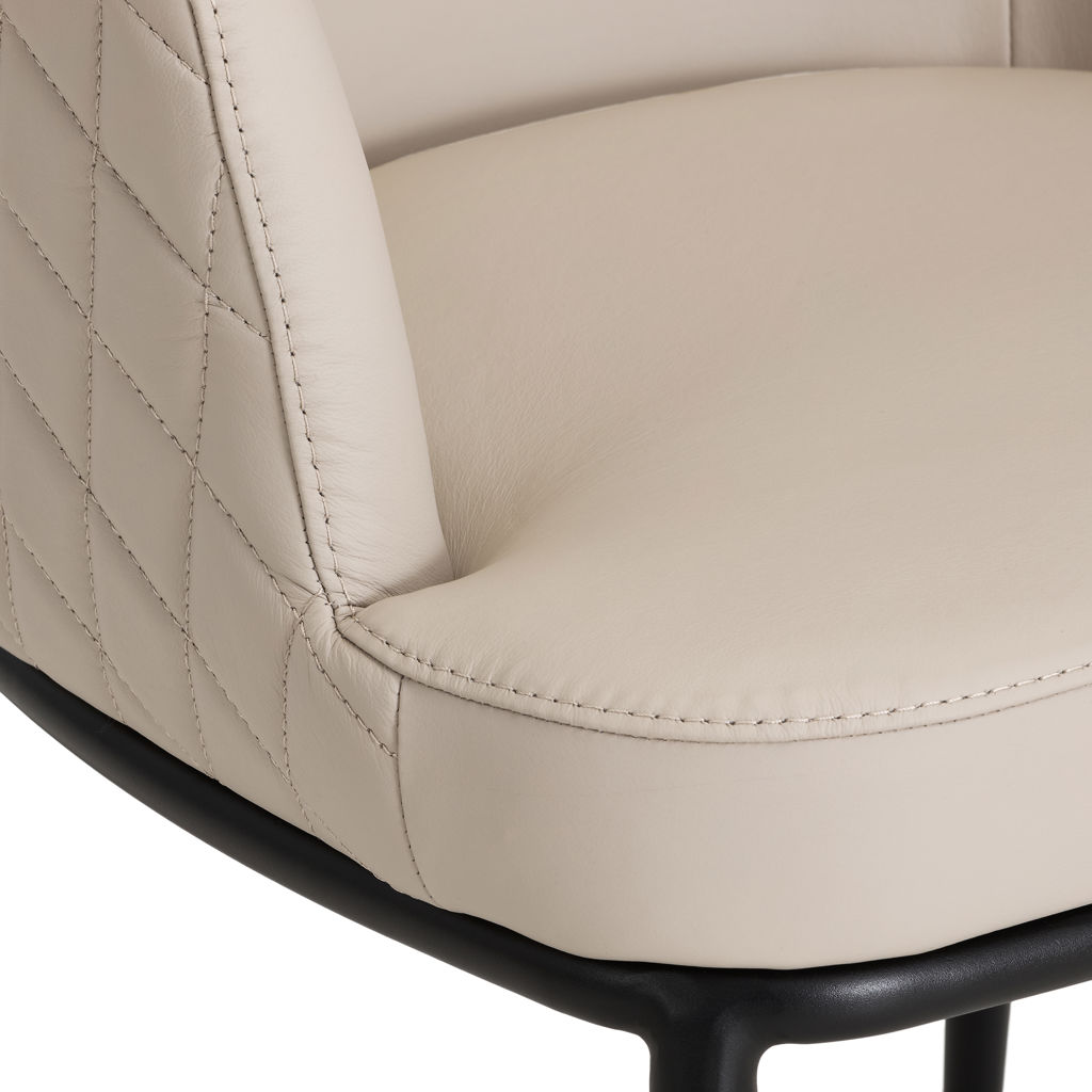 The matching chairs, upholstered in premium synthetic leather, combine comfort and practicality. Their quilted cushions invite relaxation, while their lightweight structure makes them easy to move and arrange. The harmonious contrast between the grey table and beige seats creates a soothing, timeless atmosphere.