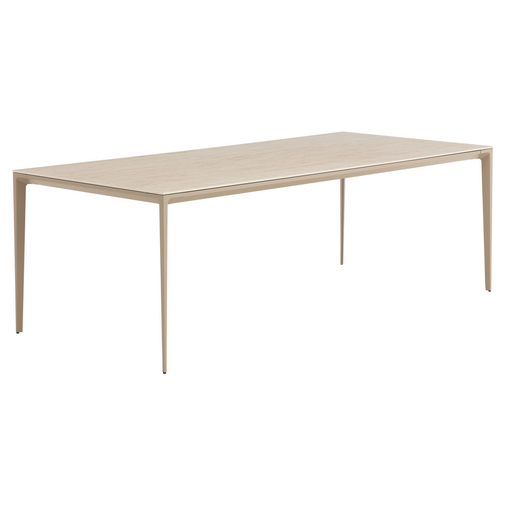 • Travertine stone-look ceramic surface. The surface of this table is made of Italian ceramic that resembles travertine stone.