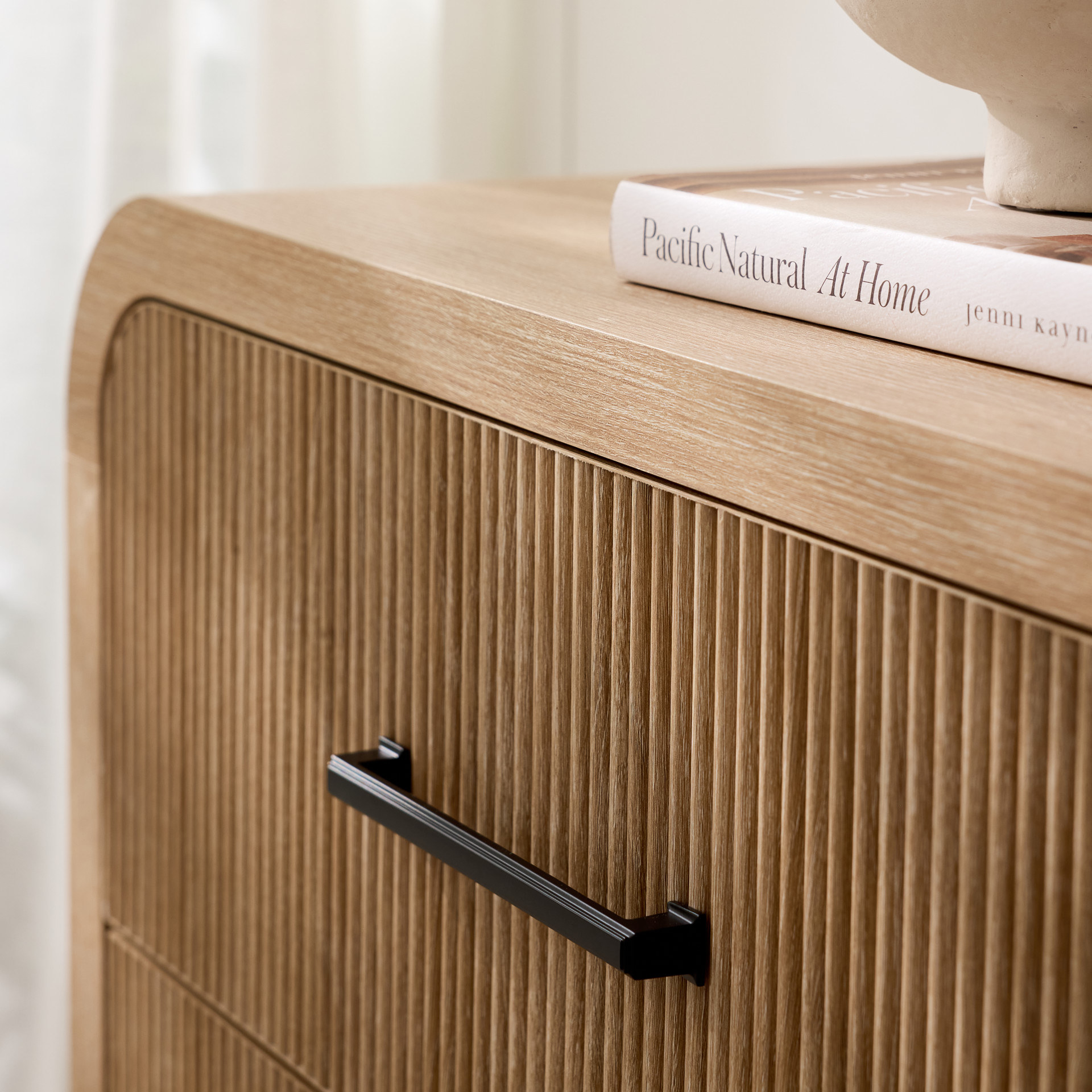 Featuring ball-bearing drawer glides for smooth operation and paper veneer for a sophisticated finish, this set features ribbed panels and elegant black metal hardware.