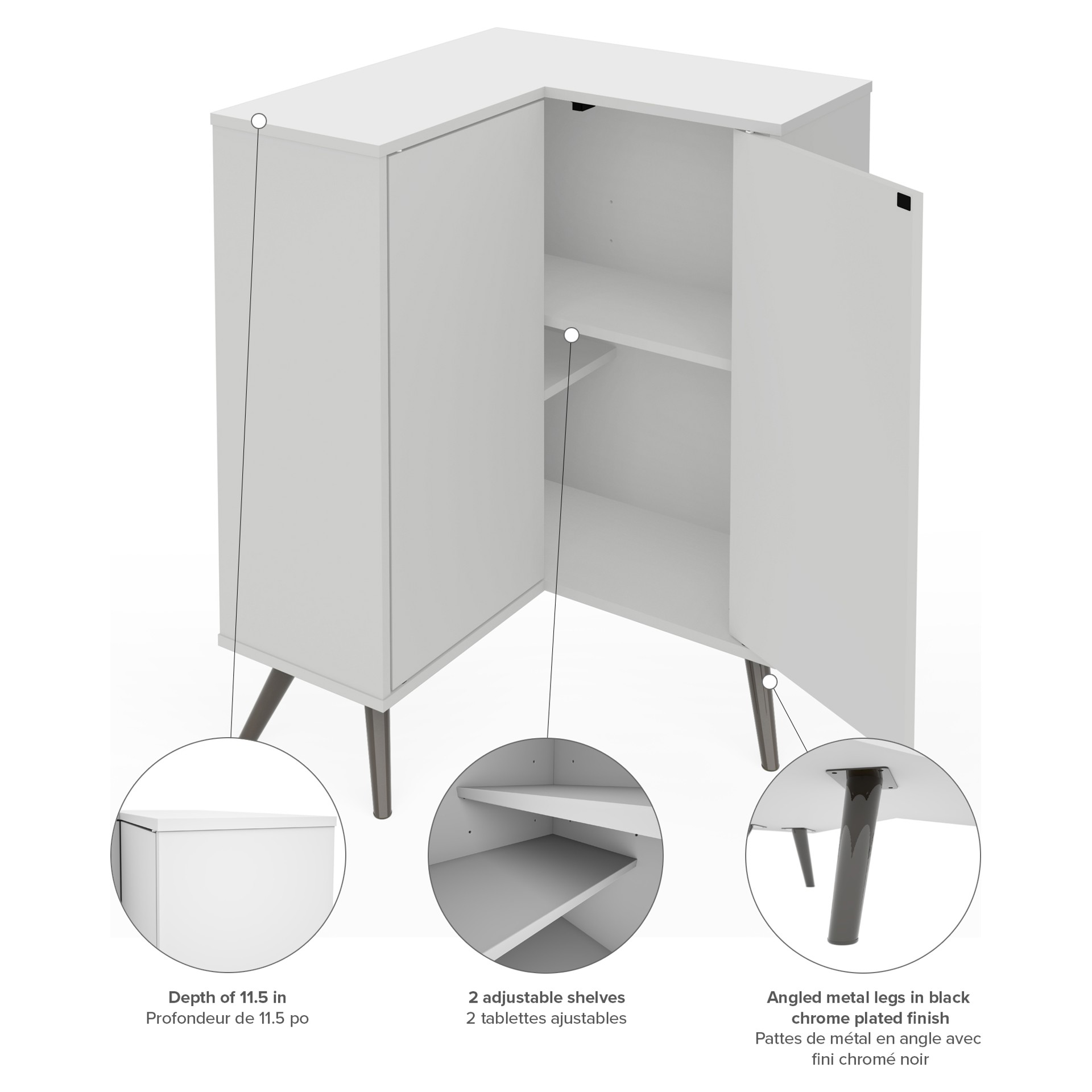 • The 2 adjustable shelves let you maximize your storage options. Angled metal legs with a black chrome finish.
