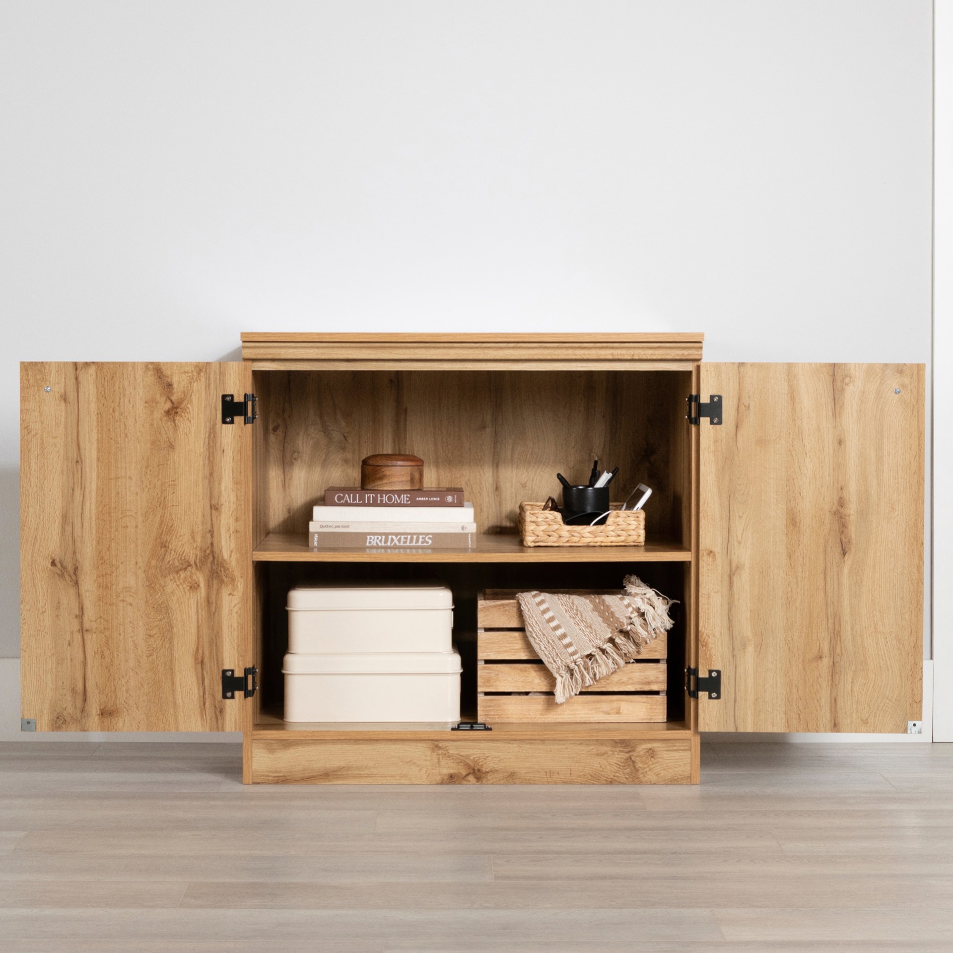 ADJUSTABLE SHELF: Behind the doors are two storage spaces, separated by an adjustable shelf. So you can adapt the inside of this cabinet to meet your needs!