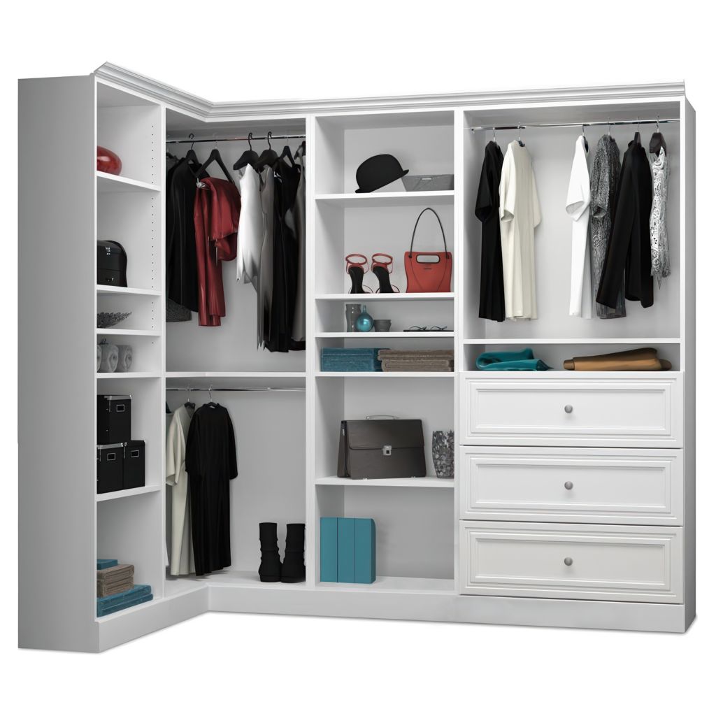 This storage set includes  1 -36“ storage unit with a set of 3 drawers, 1 corner storage unit and 2-  25“ storage units. Durable 0.75" thick shelves with scratch, stain and wear-resistant melamine finish. Adorned with elegant crown mouldings.