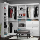 The 36“ storage unit offers 2 fixed shelves, 3 adjustable shelves and 2 clothes poles. Drawers on ball-bearing slides for smooth opening. Satin nickel handles.