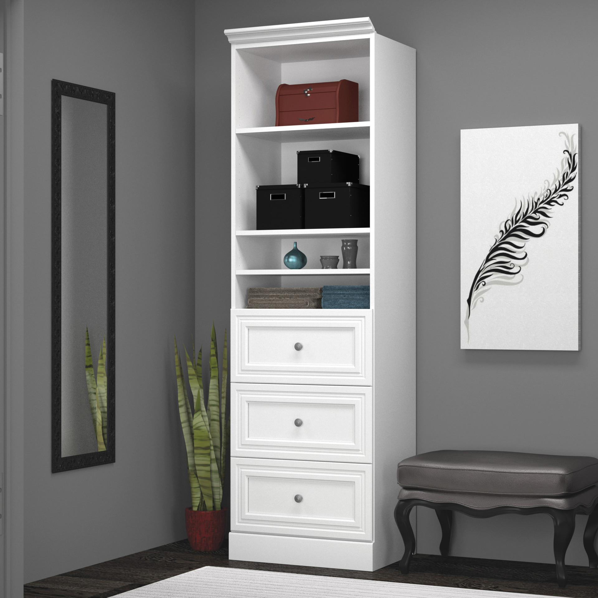 This storage kit includes a 25" Storage Unit with a 3 drawer set. Durable 0.75" thick shelves with scratch, stain and burn resistant melamine finish. décorated with crown mouldings. 2 fixed shelves, 4 adjustable shelves and 2 hanging rails. The back panel features grommets for convenient access to electrical outlets. Drawers on ball-bearing slides for slick opening. Satin nickel handles. Easy to assemble. Assembly required.