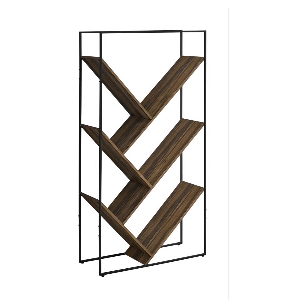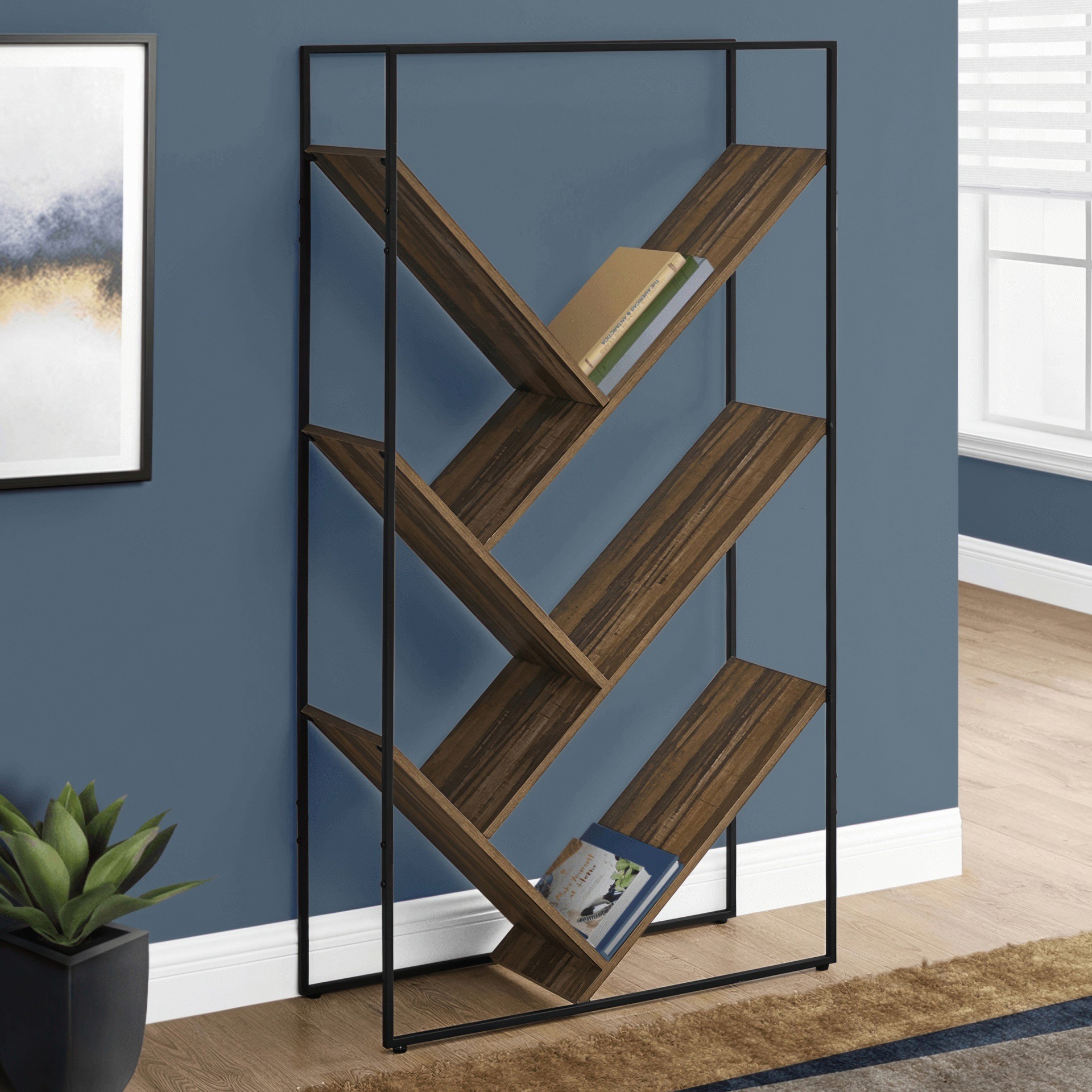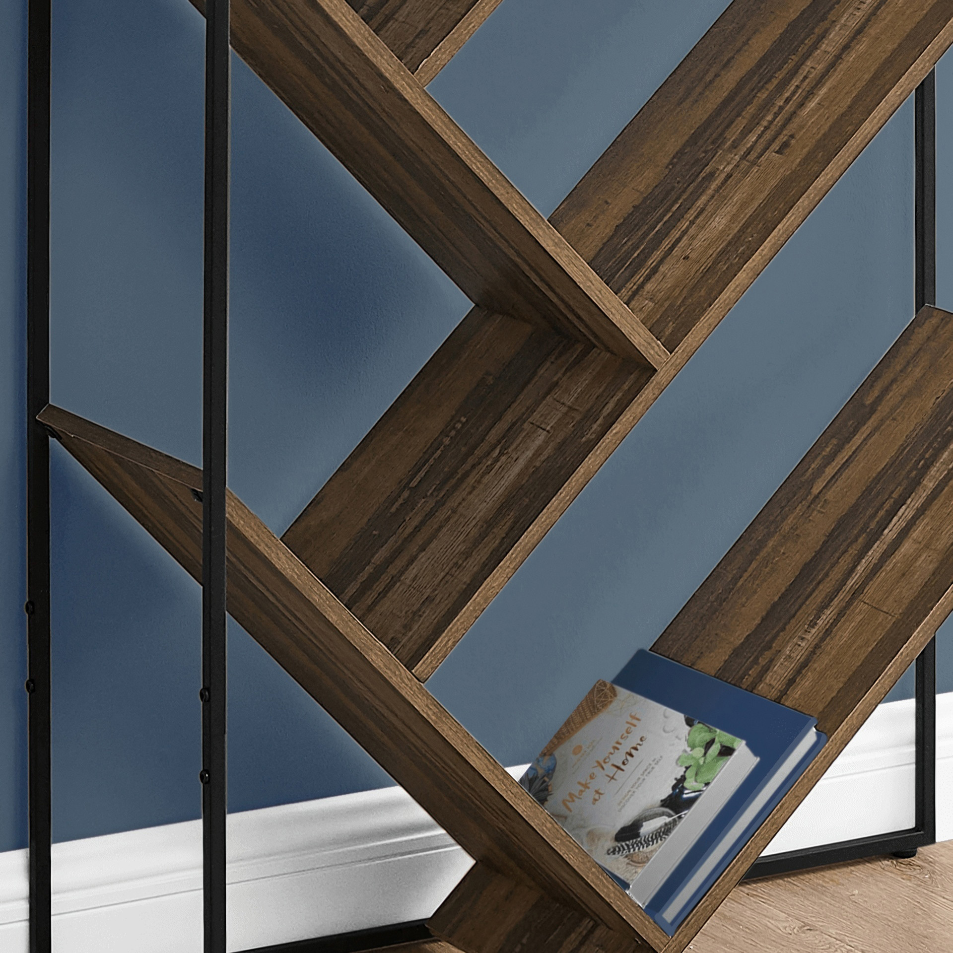 Look at storage from a different angle with this unique bookcase. Slanted shelves in a brown reclaimed wood-look finish with a wood-grain texture create eye-catching geometric angles that form V-shaped display areas in different sizes. The sleek shelving, supported by a black metal frame, gives this 5-tier bookshelf a trendy urban style.