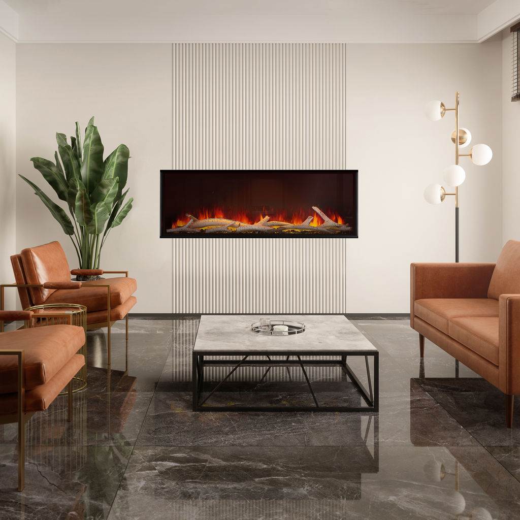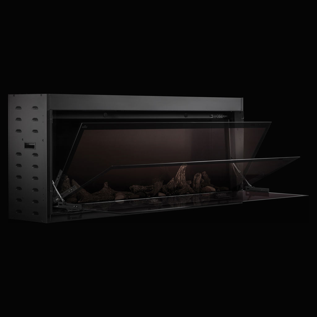 Installation options are limitless; you can choose from a framed or frameless appearance to ensure your aesthetic is captured by this beautiful fireplace. The unique flip-down glass allows easy access for cleaning and changing the included crystals and logs to suit your style.
