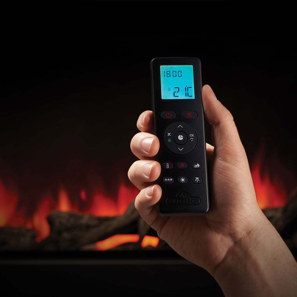 This electric fireplace can be integrated seamlessly into your life and your home with voice control activation, you can also use the WiFi-enabled Napoleon Home App, the included remote or the optional wall-mounted remote.