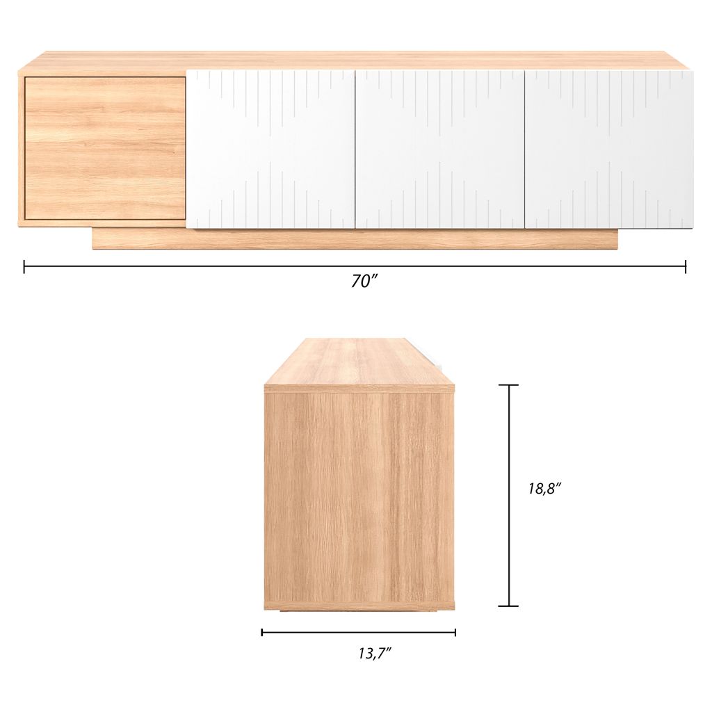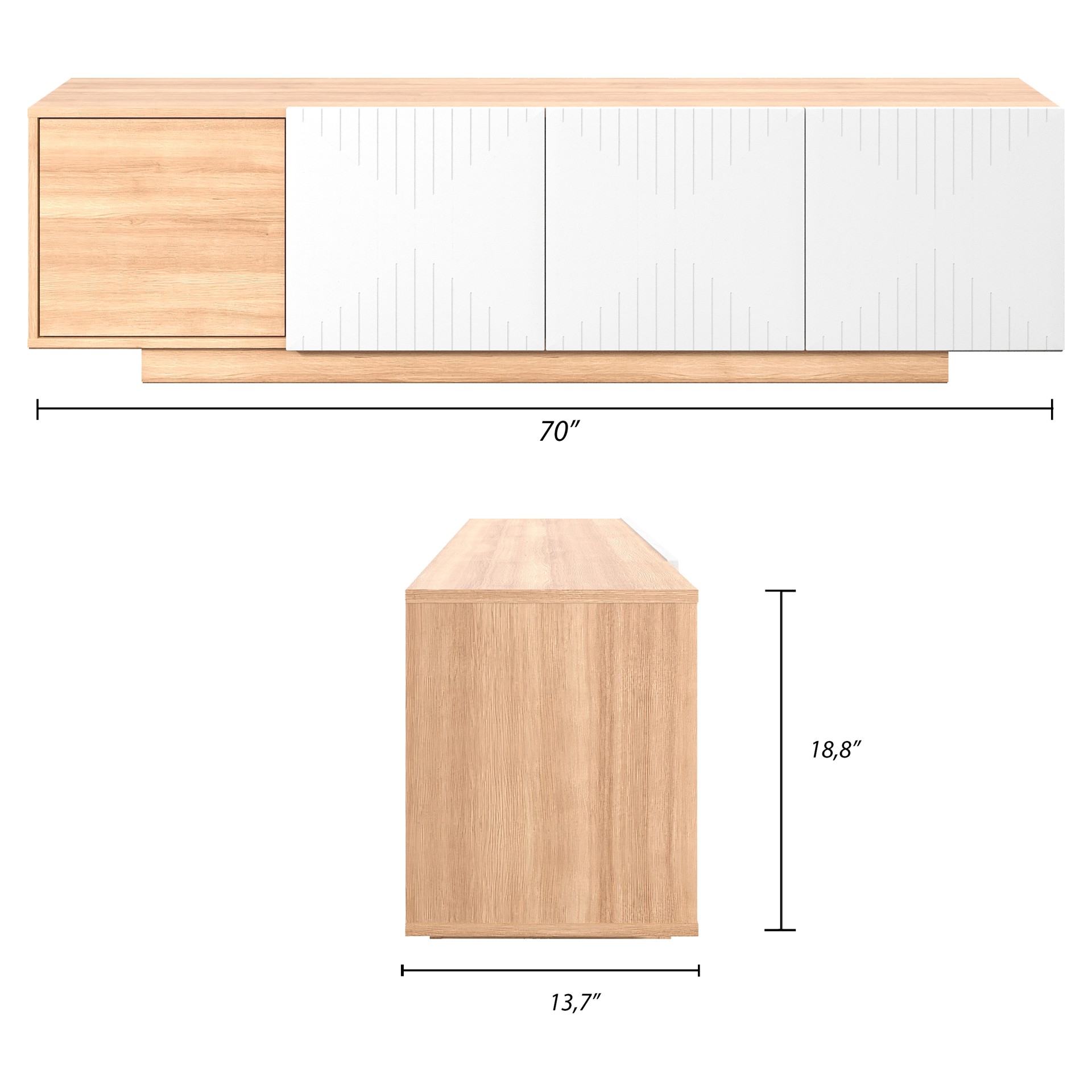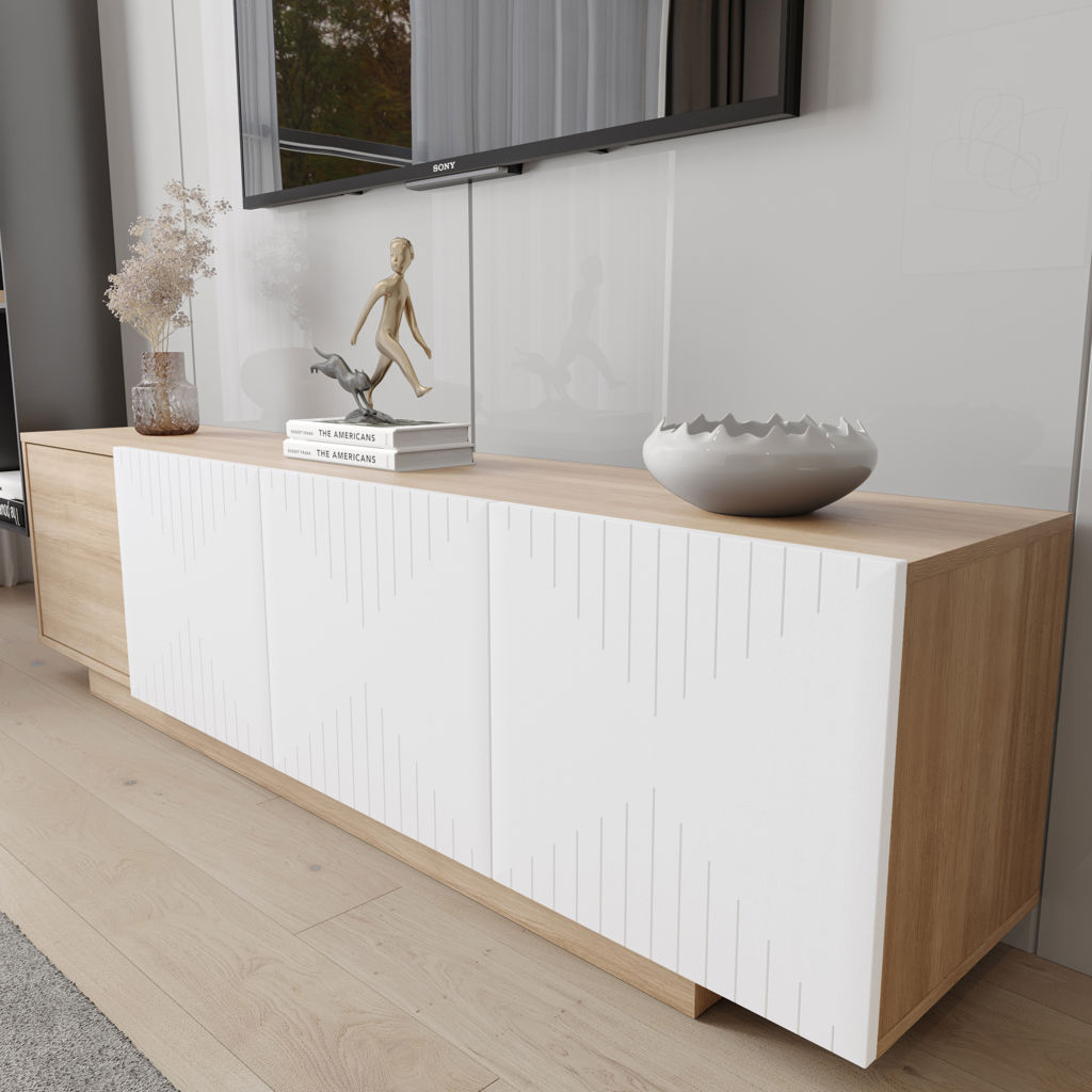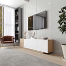 Our TV stand is the epitome of contemporary chic, boasting elegant warm walnut doors and sleek modern grey cabinet fronts.
