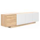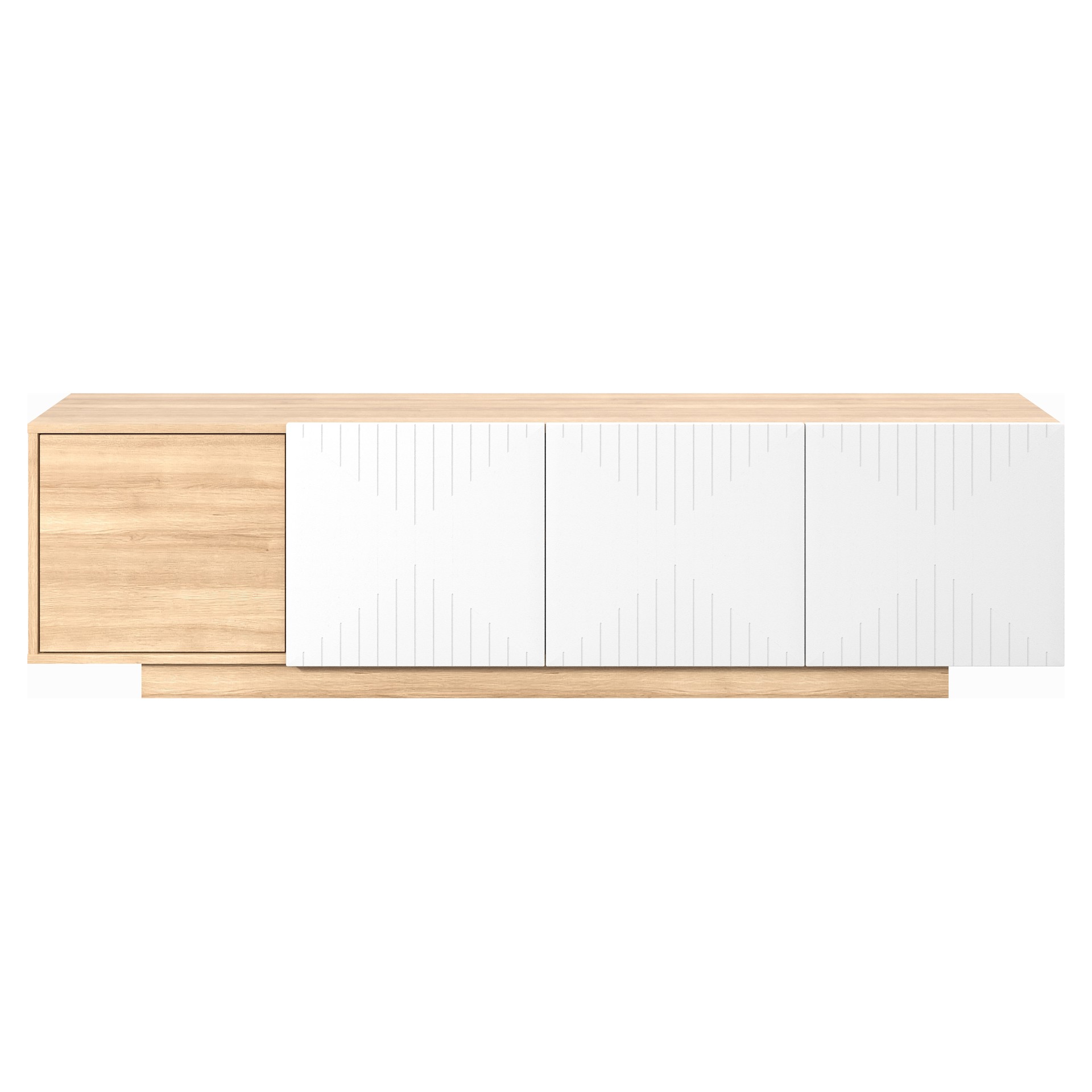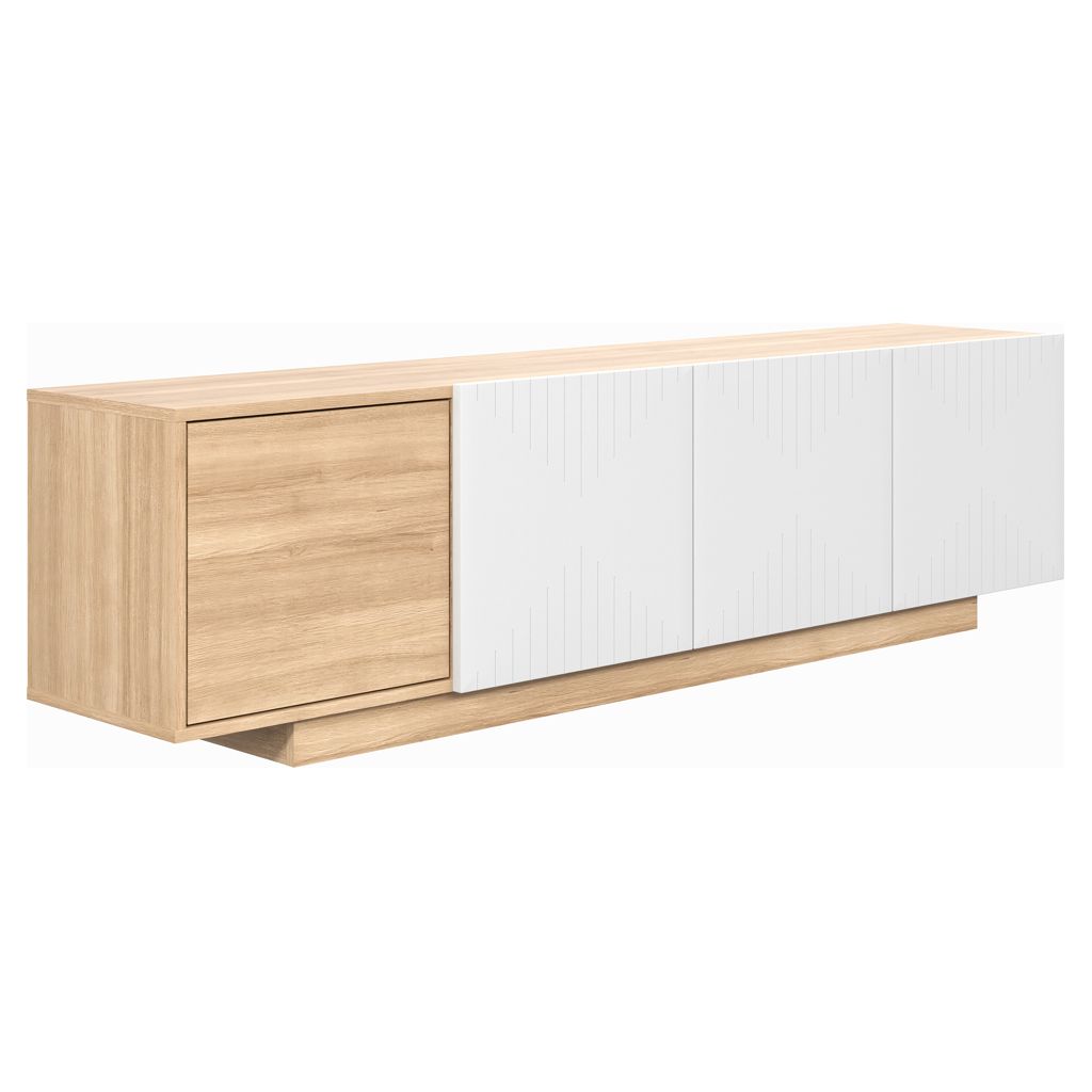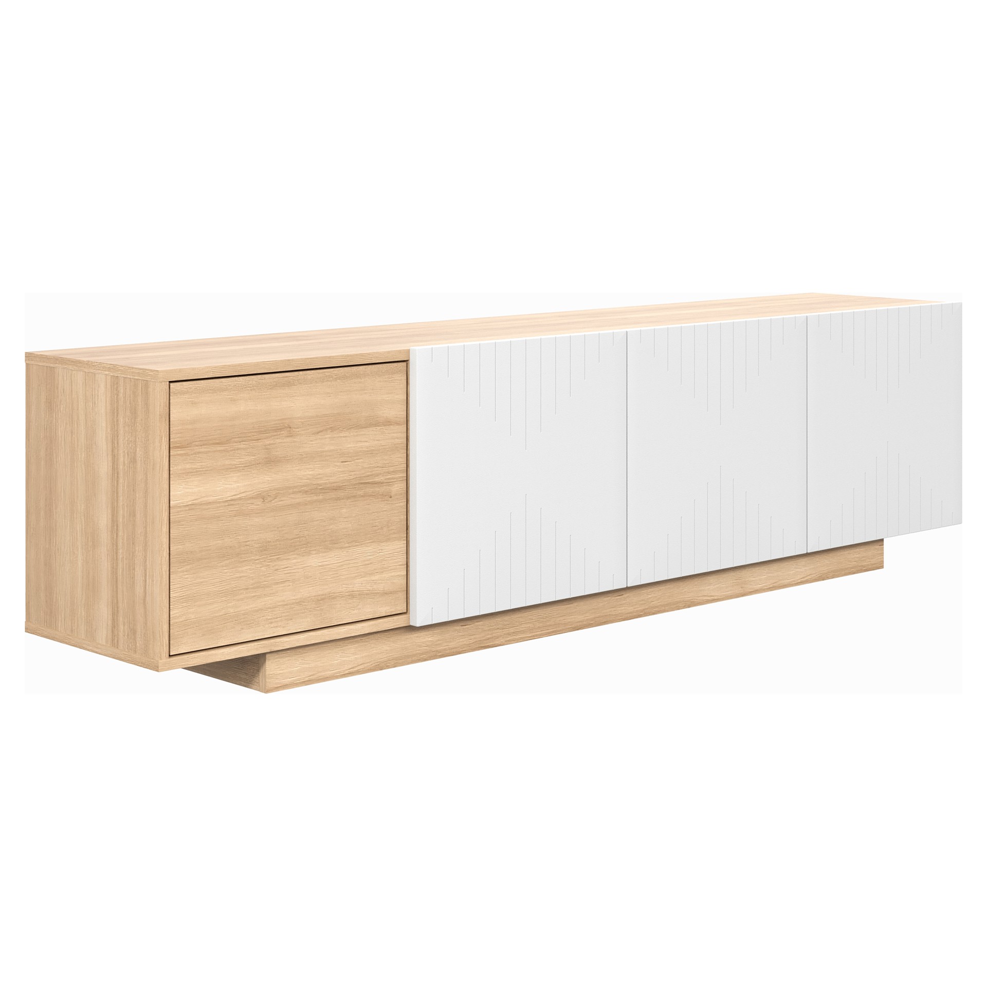 Our TV stand is the epitome of contemporary chic, boasting elegant warm walnut doors and sleek modern grey cabinet fronts.