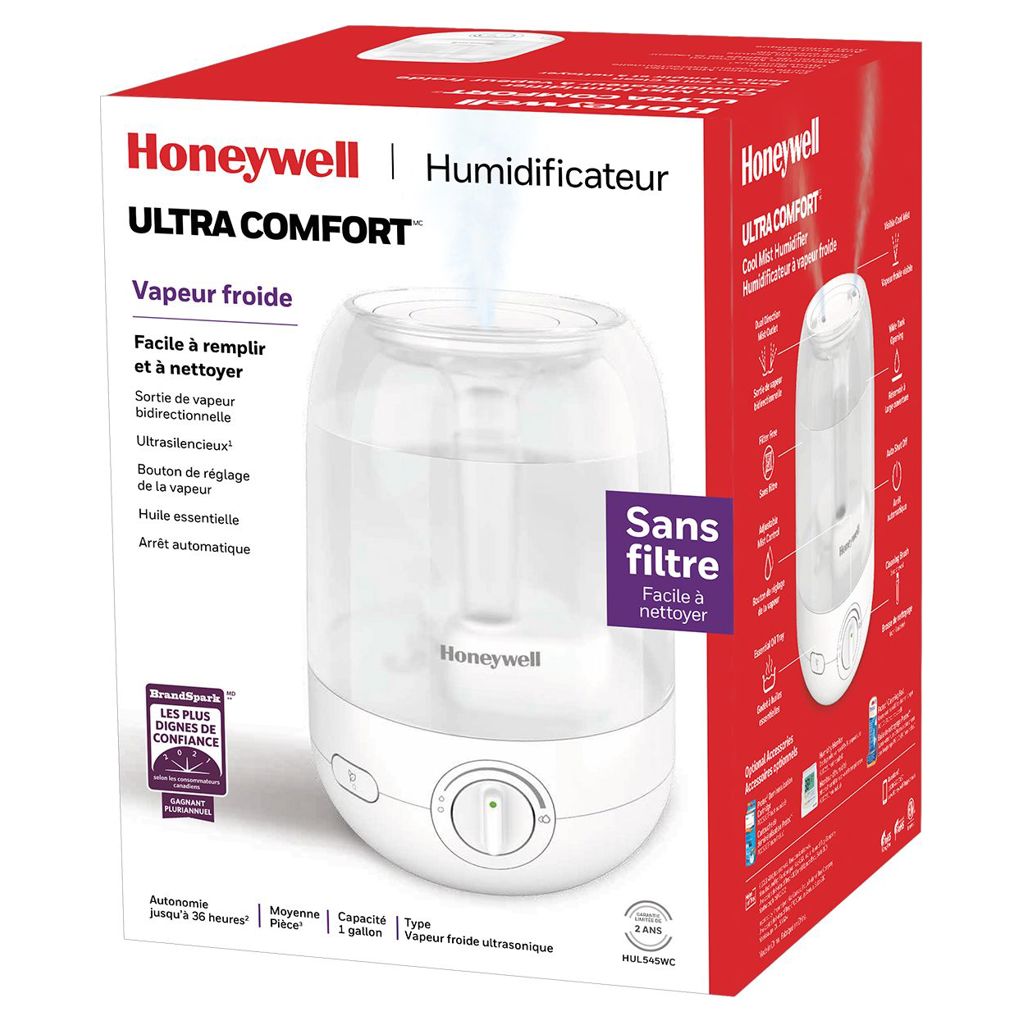 The Honeywell HUL545WC is an ultra-quiet, filterless ultrasonic humidifier that delivers a visible, fresh mist! It features an essential oil tray for extra aromatherapy comfort (essential oil not included), adjustable humidity output settings, dual-direction mist output, transparent water tank and automatic shut-off. The 1-gallon (3.79-liter) tank capacity features a wide opening that's easy to fill and clean (cleaning brush included). An ideal fit for a medium-sized room, it can run for up to 36 uninterrupted hours per filling. Many find that a humidifier for the home, bedroom or nursery is an essential part of a good night's sleep when the air is dry, in allergy season or when ill.
