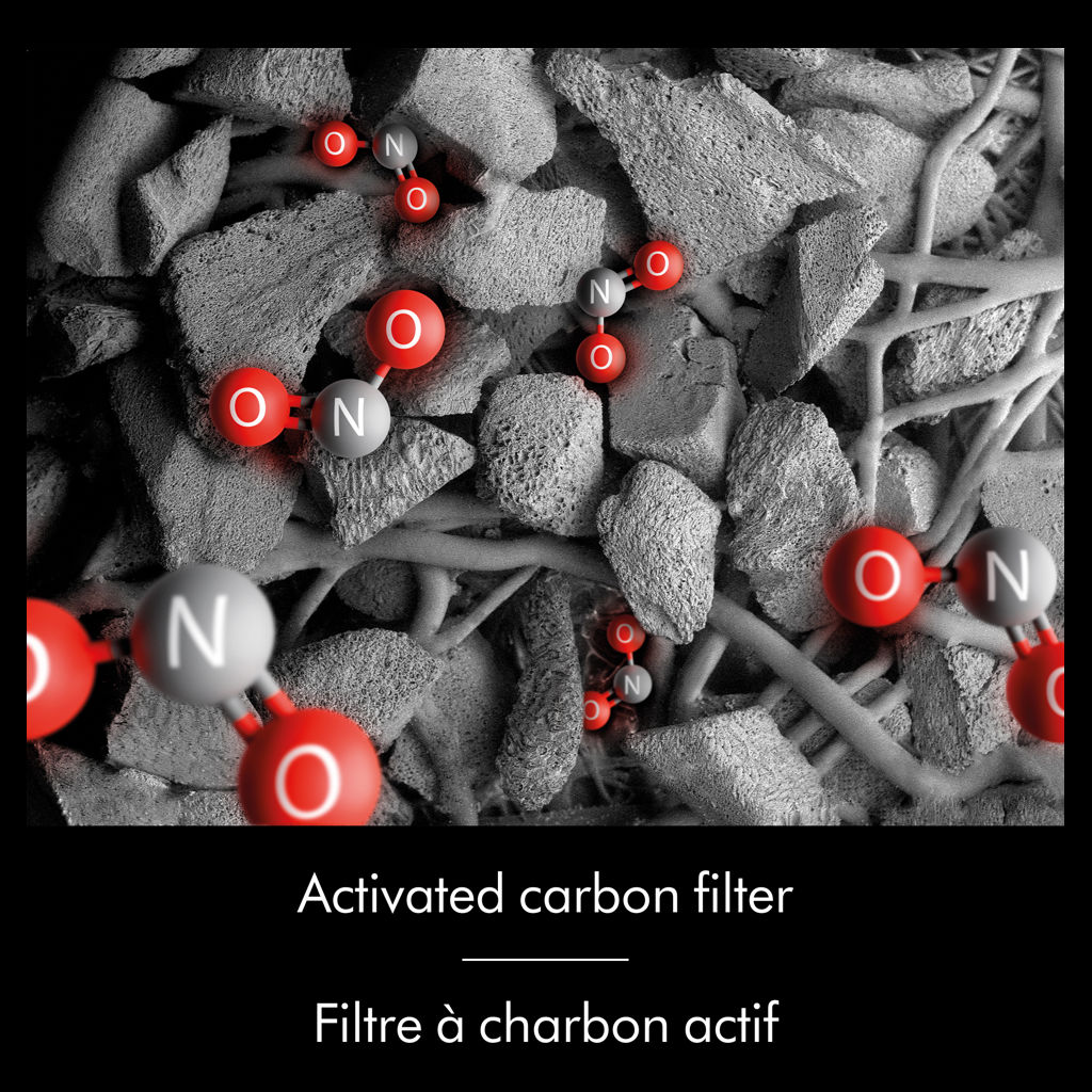The activated carbon filter removes pet and cooking odors, as well as gases like NO?. Its highly porous surface traps airborne pollutants, unpleasant odors, and harmful gases, creating a cleaner, more comfortable living environment.