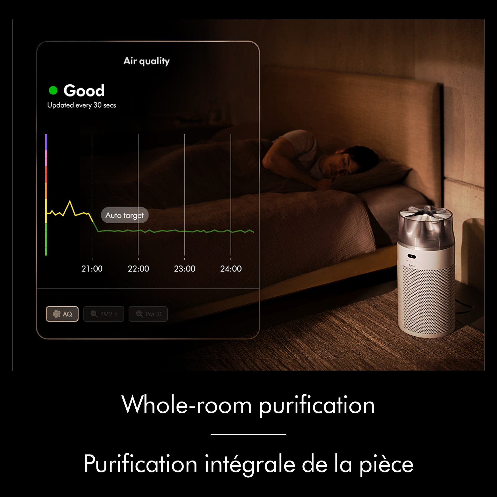 Set it and forget it. The built-in intelligent particle sensor detects PM2.5 particles and automatically adjusts the airflow to purify the air quickly, saving energy by running only when needed.