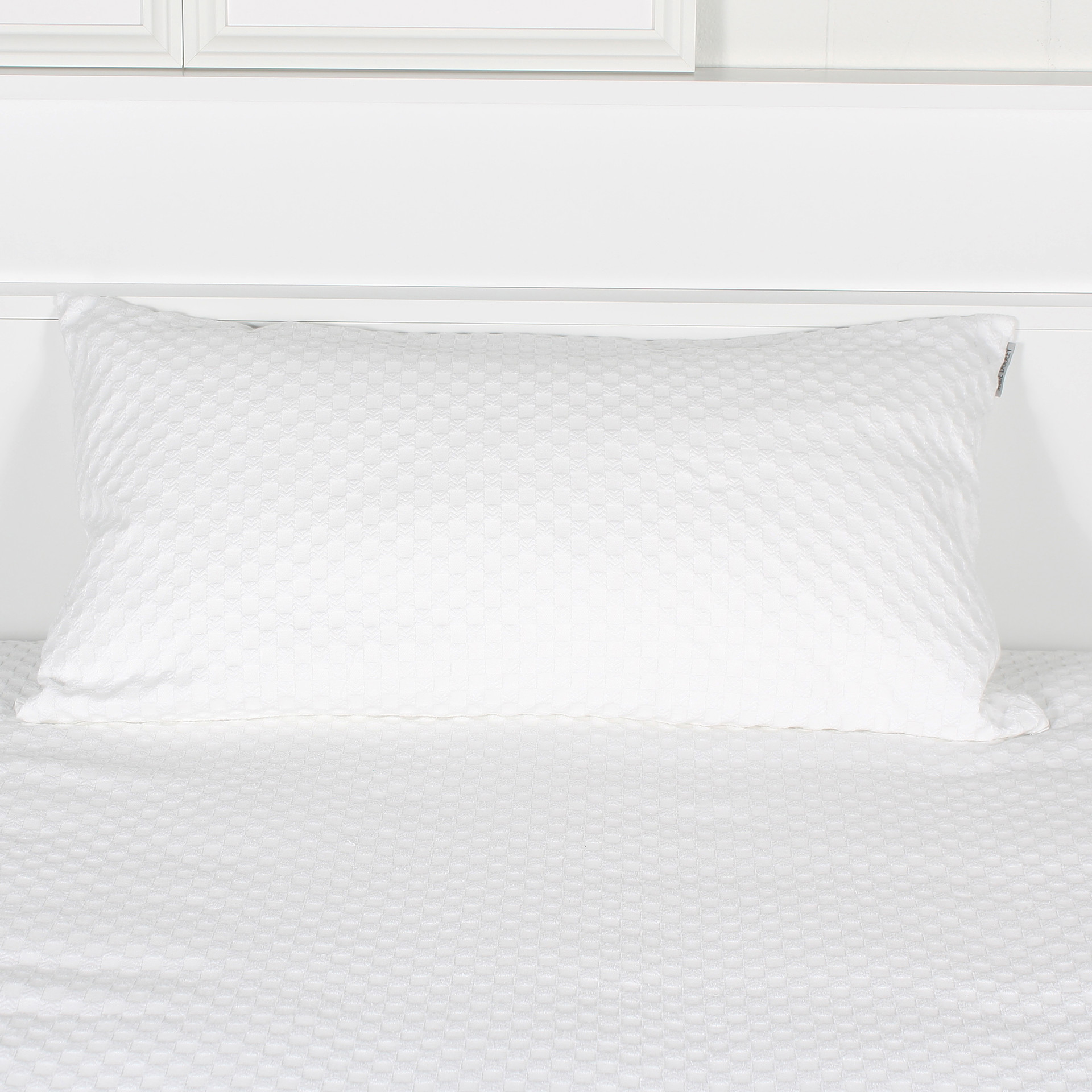Its bright white, tone-on-tone check pattern gives it an air of purity. We suggest you match it with the PENELOPPE coverlet.