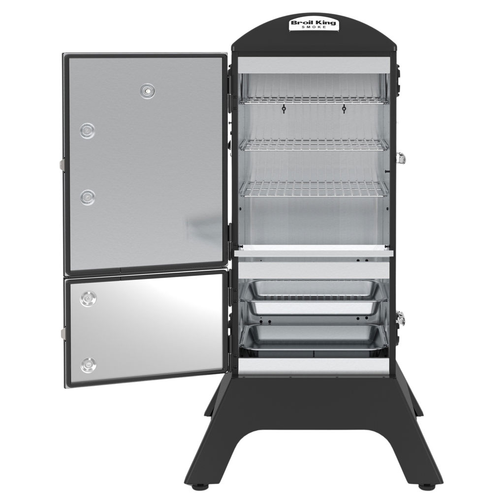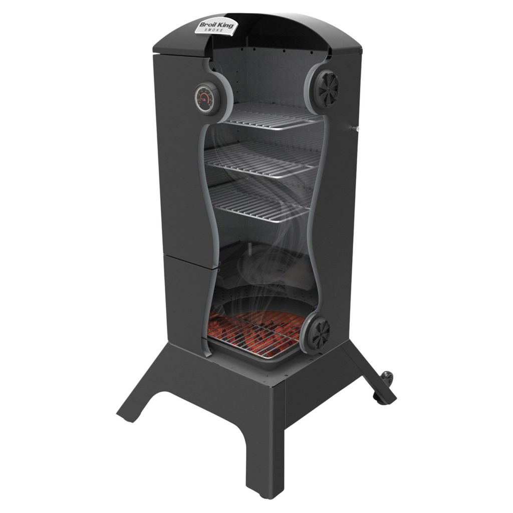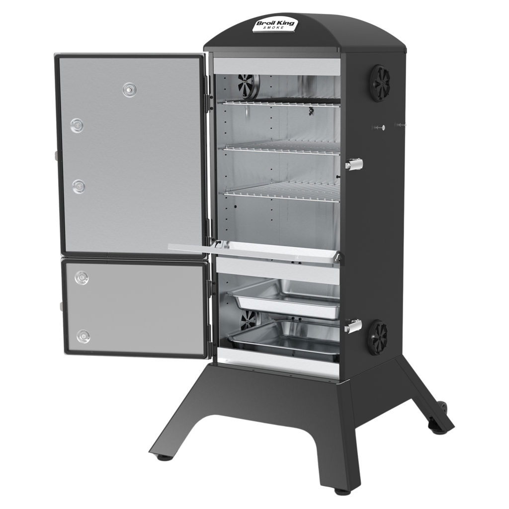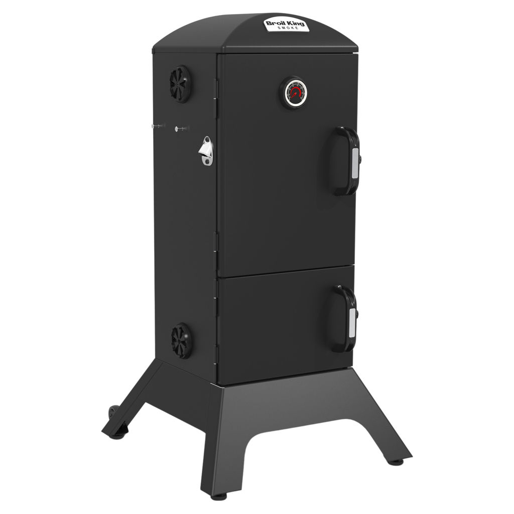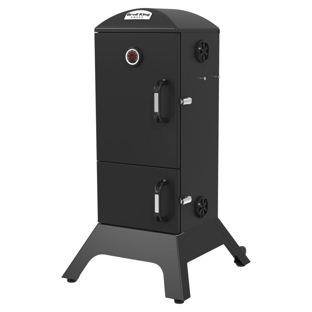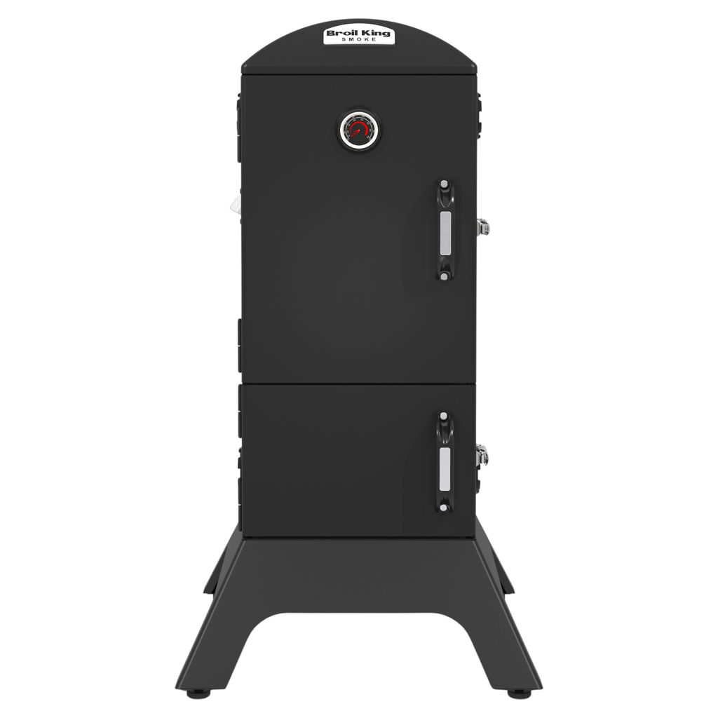 Broil King charcoal cabinet smokers feature a total cooking area of 770 sq. in., four adjustable stainless steel cooking grids, an electronic Sure-Lite™ ignition system, a fully adjustable cast aluminum Roto-Draft™ damper system, and two heavy-duty steel doors with a premium gasketed latch system.