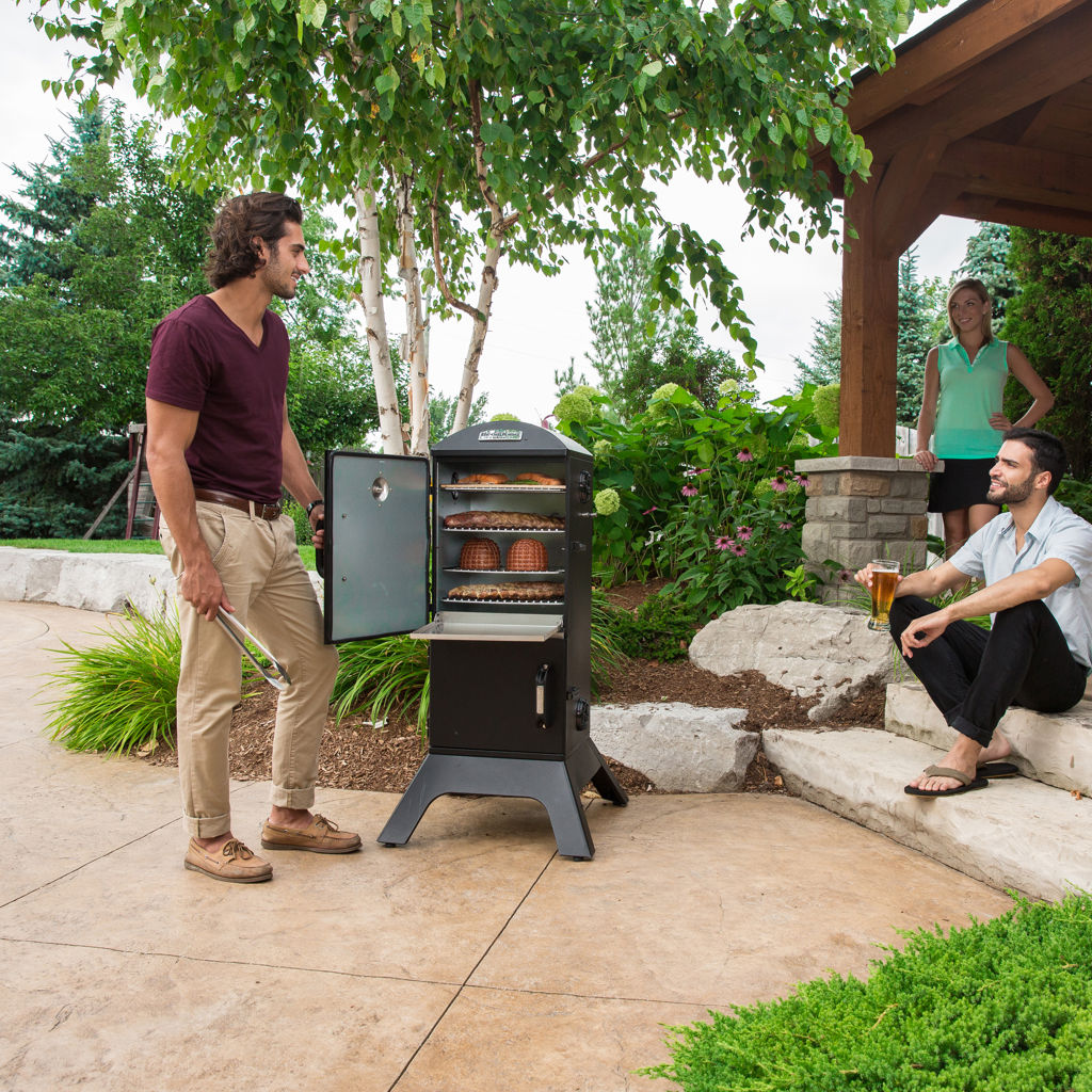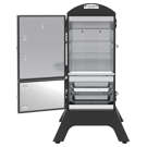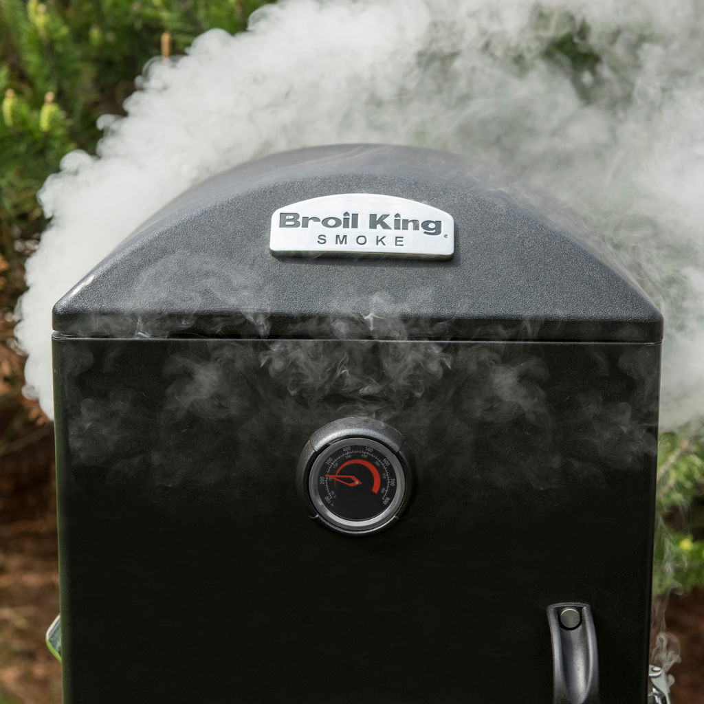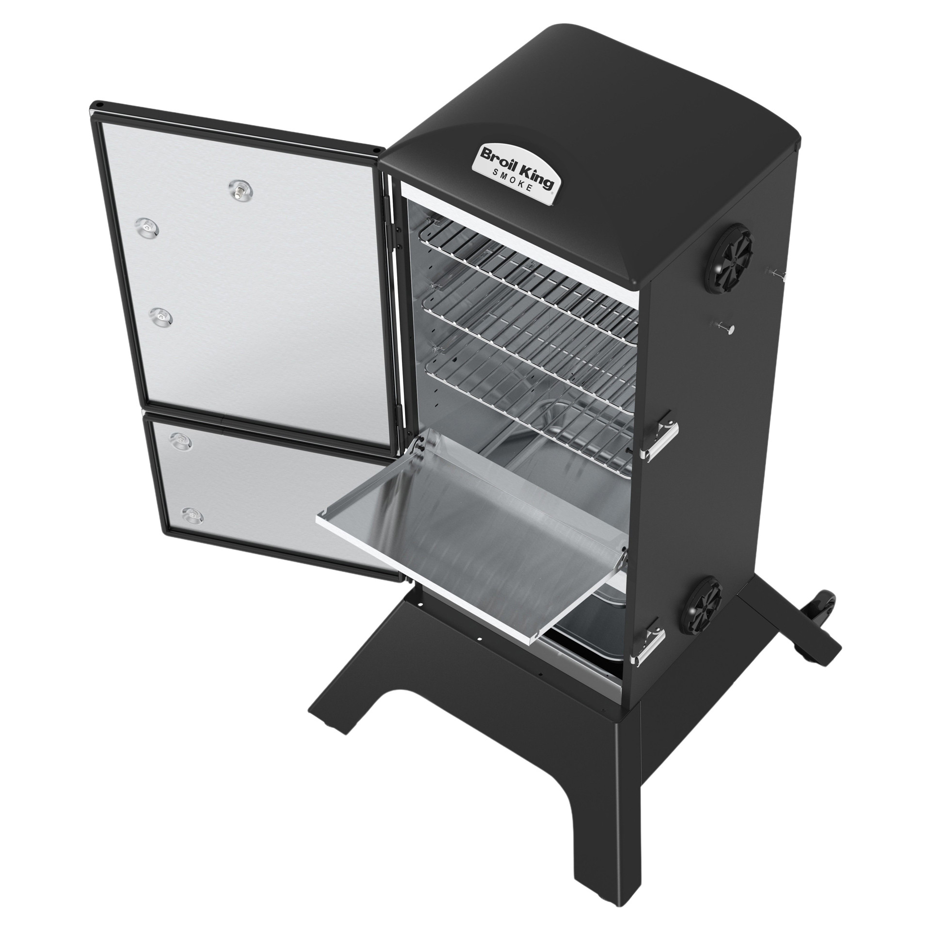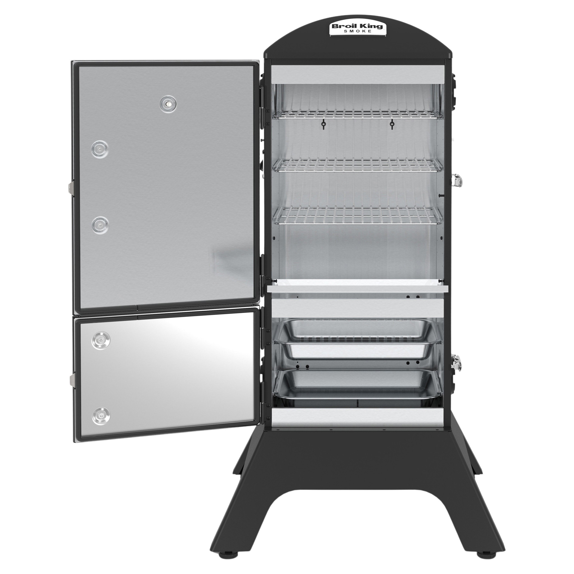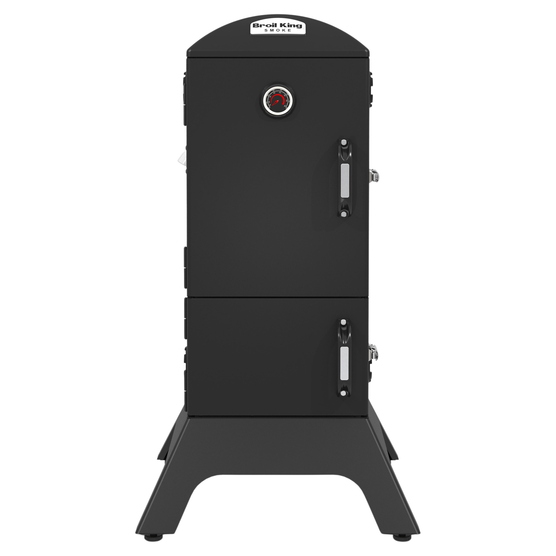 Broil King charcoal cabinet smokers feature a total cooking area of 770 sq. in., four adjustable stainless steel cooking grids, an electronic Sure-Lite™ ignition system, a fully adjustable cast aluminum Roto-Draft™ damper system, and two heavy-duty steel doors with a premium gasketed latch system.