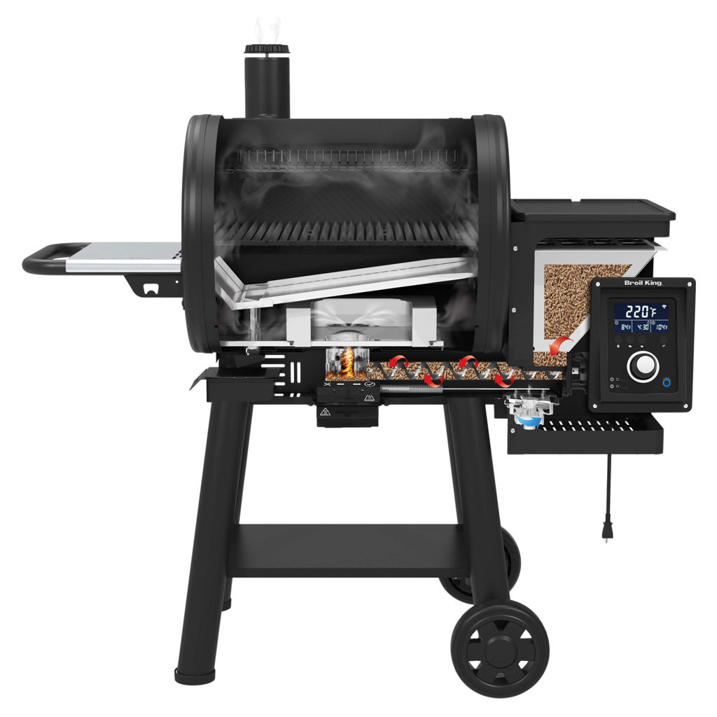 This innovative product is fully equipped with a powerful auger, a 22 lb pellet hopper, a removable grease management system, a unique ash management system, a deluxe rotisserie kit, two electronic meat probes, storage space, and a side shelf.