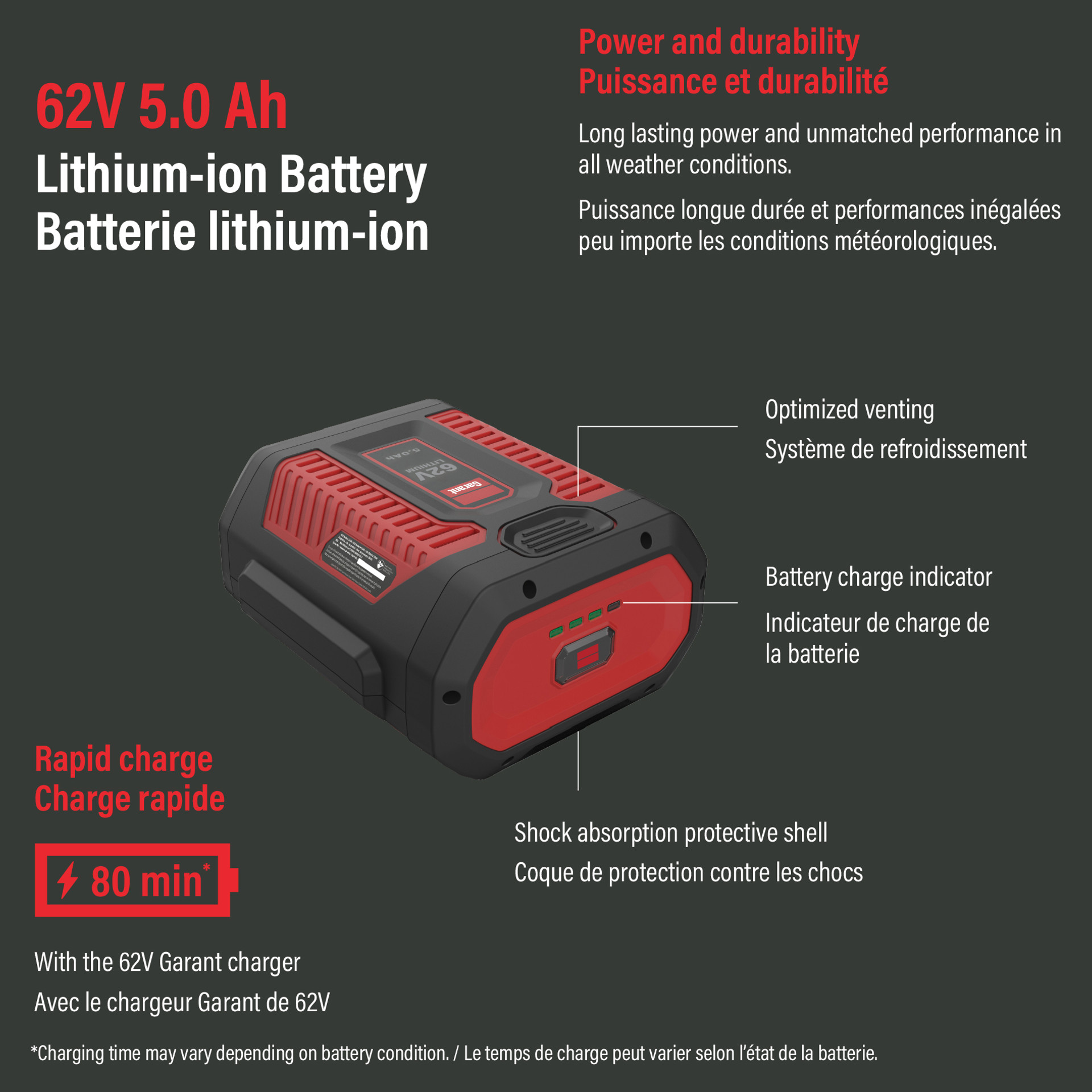 Designed for light-duty or overhead work, the Garant 62V 5 Ah lithium-ion battery delivers reliable performance in an ultra-compact format.