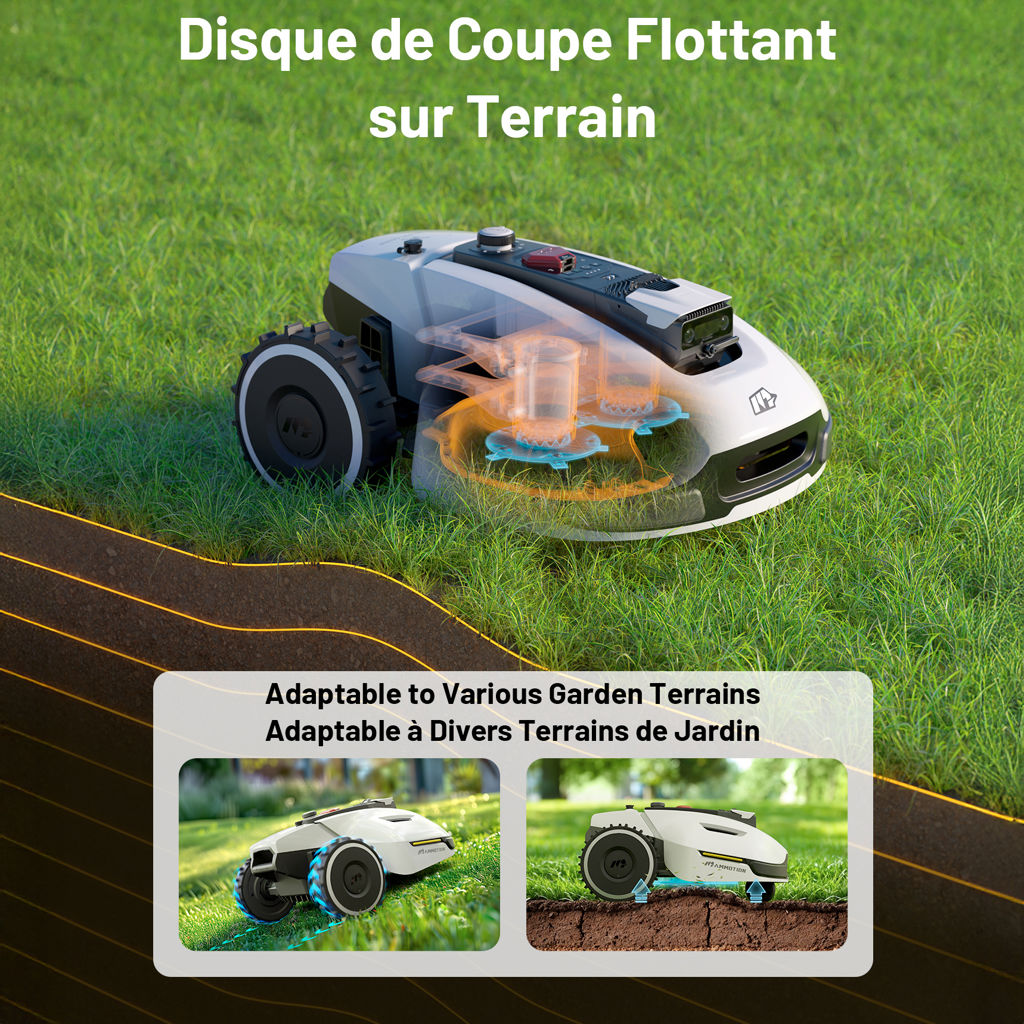 Equipped with two five-blade cutting disks for a total cutting width of 320 mm, the 88W YUKA motor delivers exceptional cutting performance. The floating, anti-clog cutting deck ensures a flawless finish, while the dynamic height adjustment (30–100 mm) maintains consistent cutting height across all terrains. It can mow up to 0.17 acre per charge.