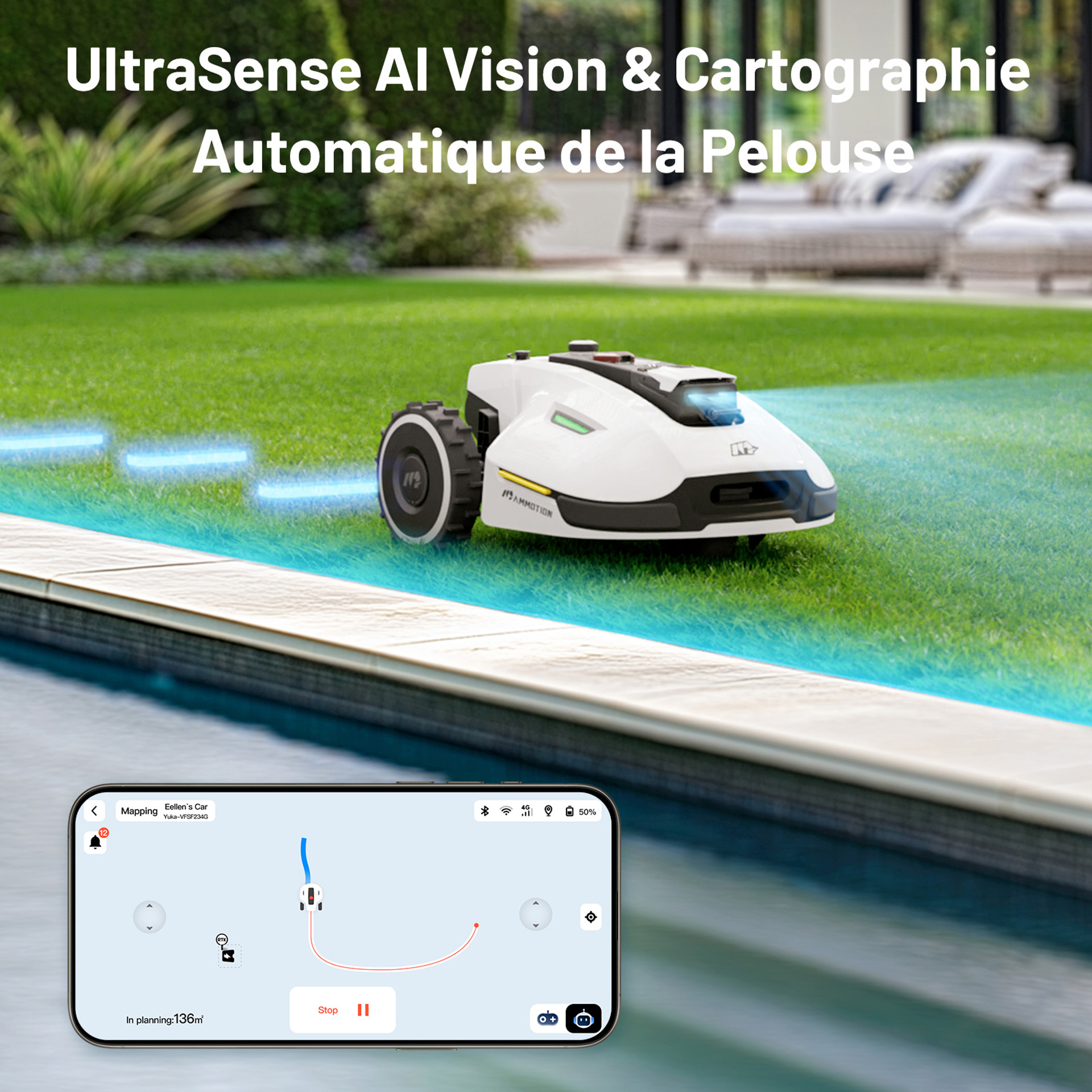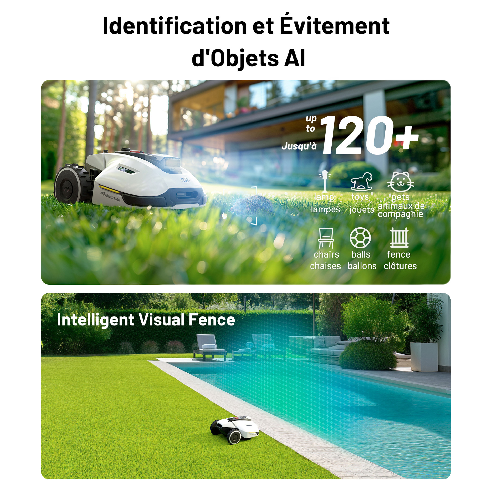 The YUKA 3000 mows cleanly and precisely along borders, even without satellite signals. It detects invisible boundaries to stay within defined zones and uses advanced image processing to distinguish grass from non-grassy surfaces, effectively avoiding restricted areas. With over 200 AI object recognition capabilities, it excels in obstacle detection and avoidance.