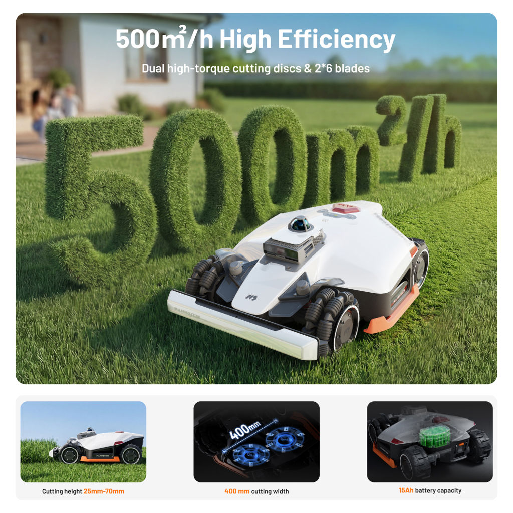 The LUBA 3 AWD features high-performance motors and six-blade cutting discs for consistent, efficient mowing. Its AI automatically adjusts cutting power and speed based on grass density to maximize energy efficiency and mowing quality.