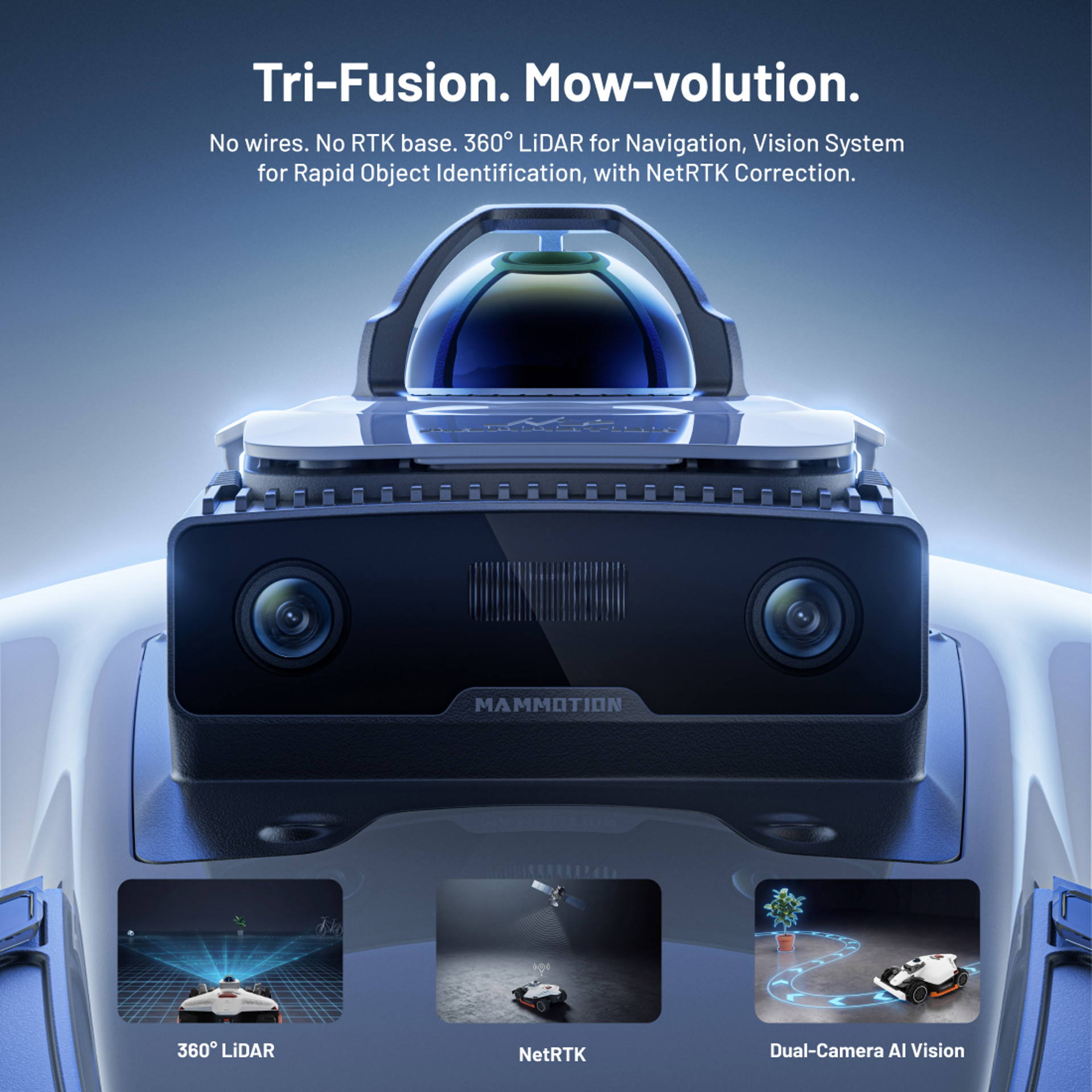 - Tri-Fusion navigation technology: 360° LiDAR + AI vision + RTK