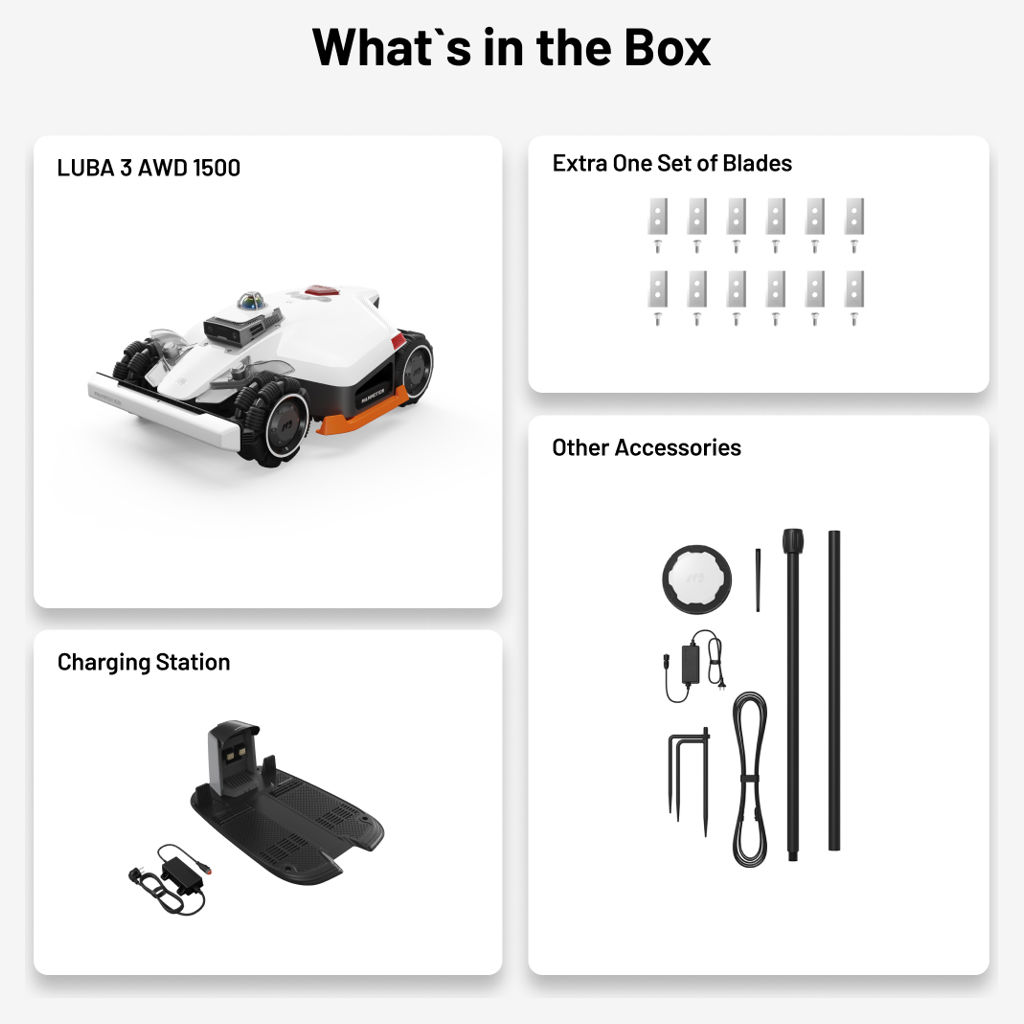 The LUBA 3 AWD features high-performance motors and six-blade cutting discs for uniform and efficient mowing. Its built-in artificial intelligence automatically adjusts cutting power and speed based on grass density to maximize energy efficiency and cutting quality.