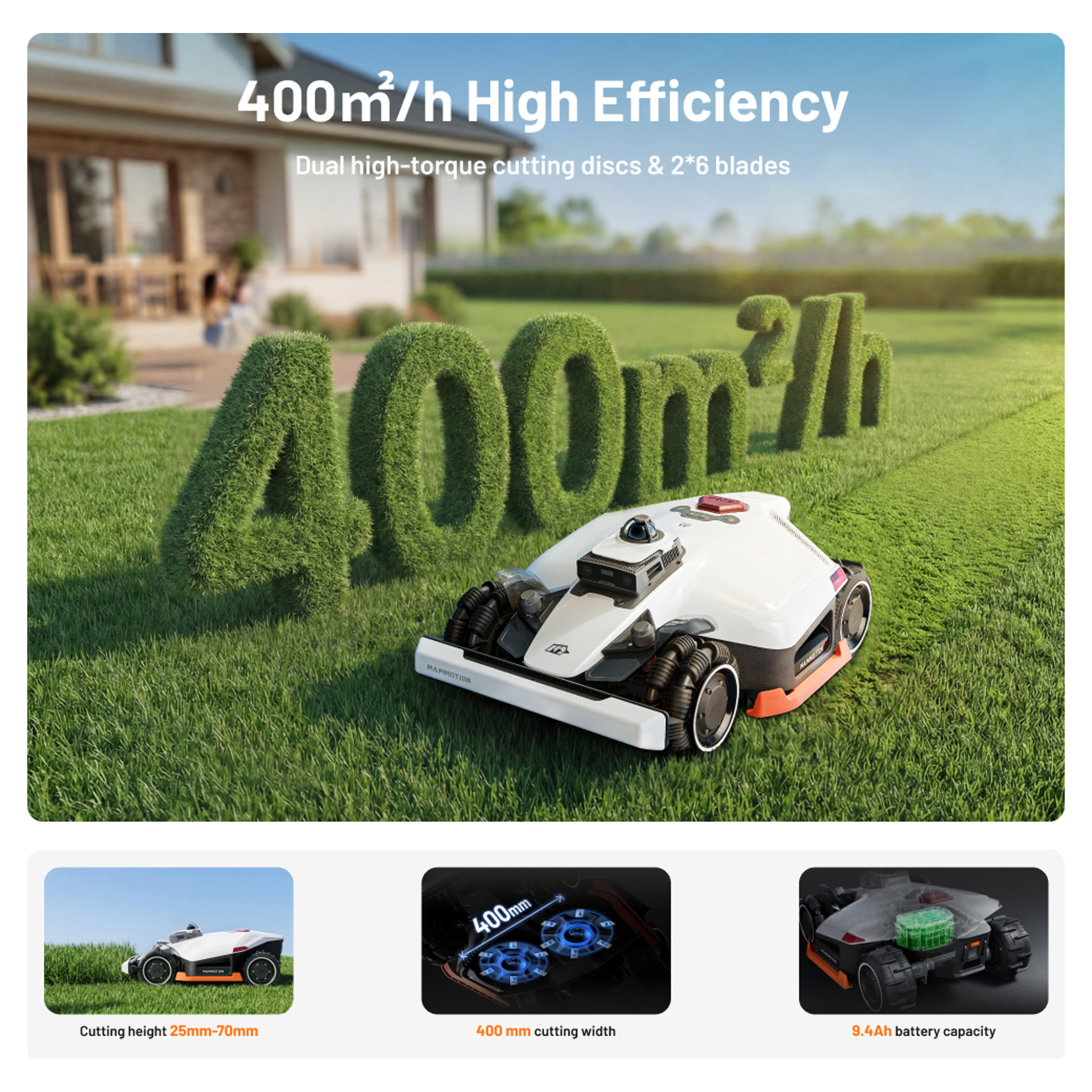 With its advanced navigation technology and all-wheel drive system, this robot easily adapts to complex terrain, steep slopes, and large areas, ensuring a perfectly maintained lawn throughout the season.