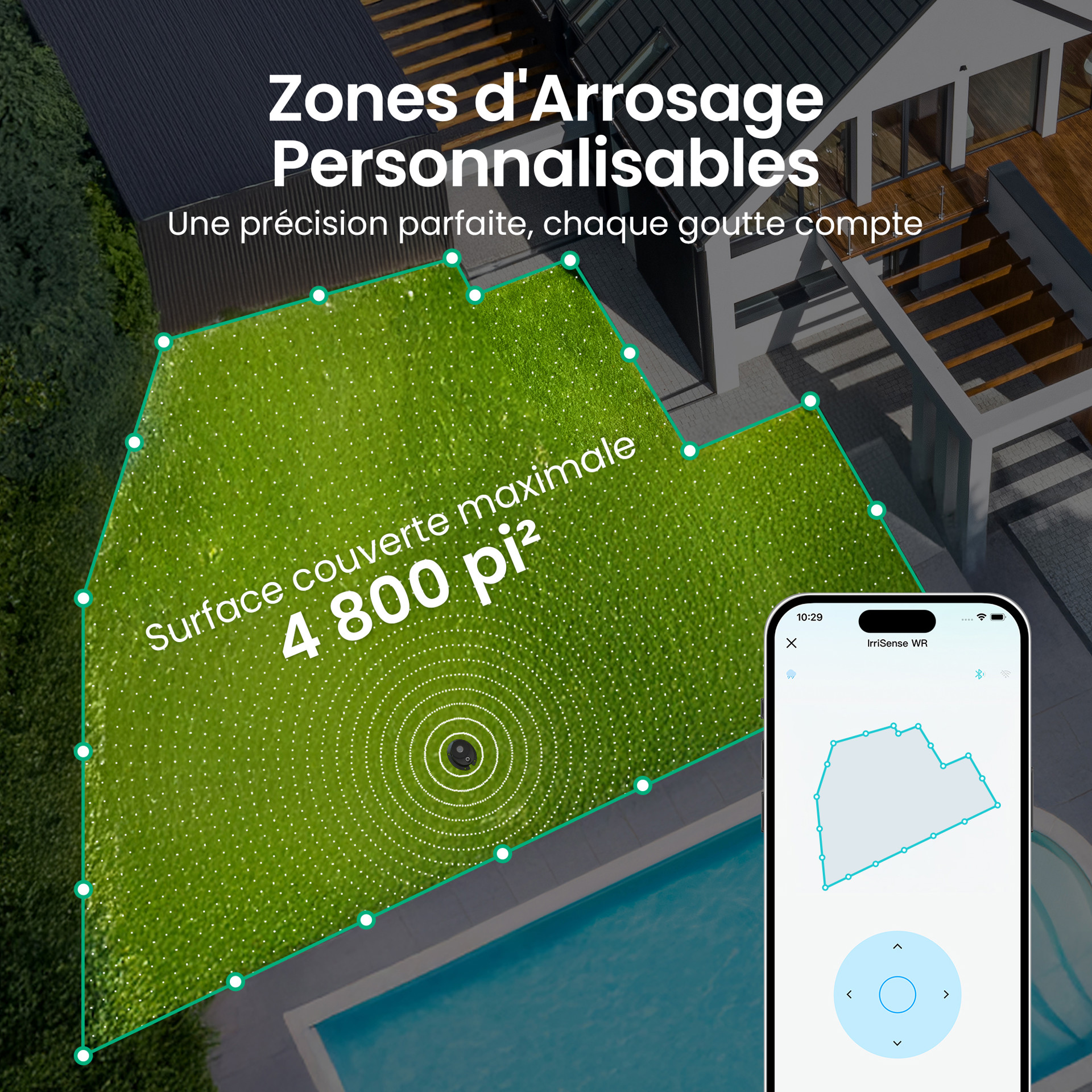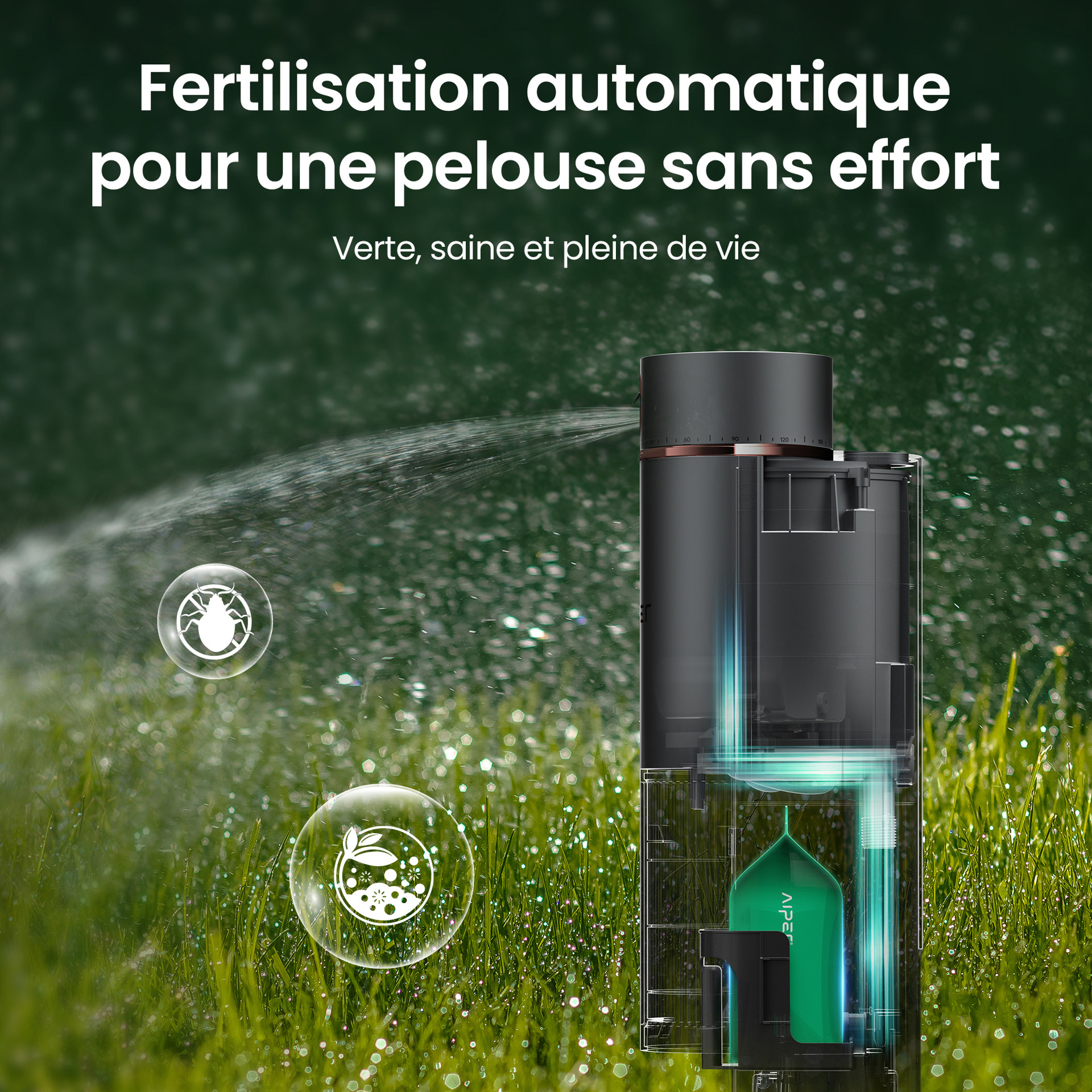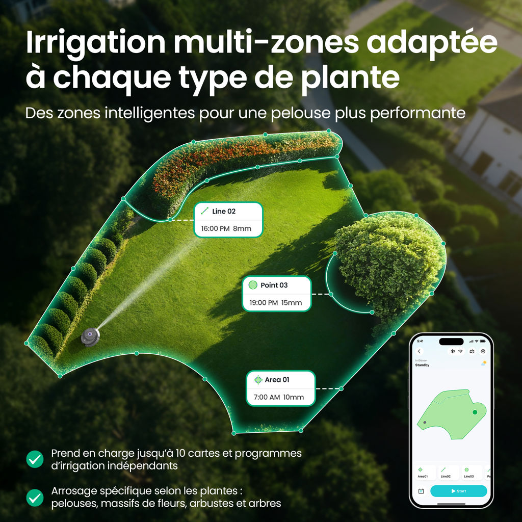 Operating at 45 PSI, the Aiper IrriSense N2 covers up to 446 m² with a 12-meter spray range. EvenRain™ technology mimics natural rainfall, while adaptive spraying ensures full coverage with no blind spots.