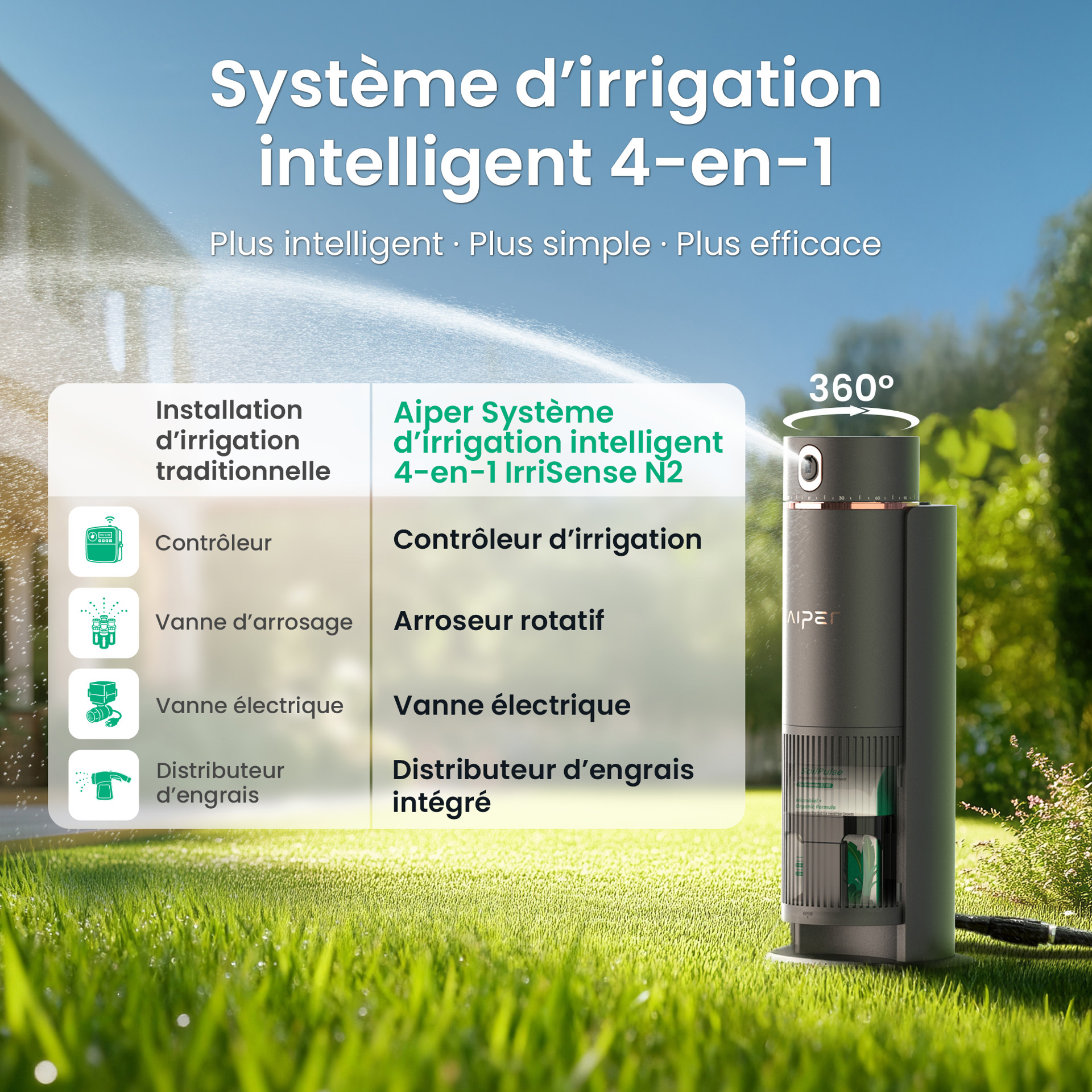 The Aiper IrriSense N2 is an intelligent robotic irrigation system that delivers wide, precise watering coverage of up to 446 m² (4,800 sq ft) with a 12 m (39 ft) spray range. Fully controlled via a mobile app, users can adjust zones, schedules, and watering depth in real time for healthier lawn care, wherever they are.