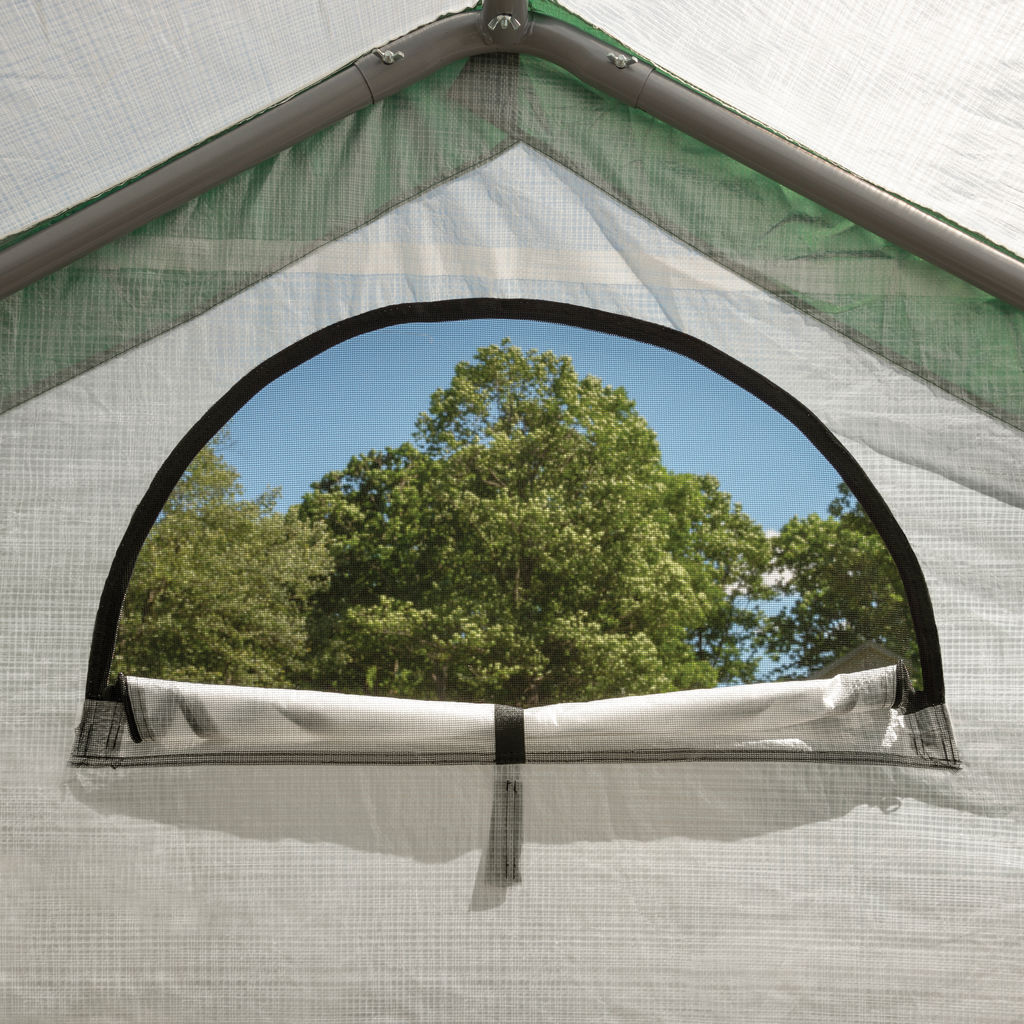 Extend the growing season with the attractive and practical organic growing greenhouse. Quick and easy to assemble, this greenhouse features a sturdy carbon steel frame that connects with wing nuts and bolts. It also includes a one-piece, three-layer ripstop cover made of Luminate Light Diffusion fabric, which is UV-treated and blocks harmful UVA and UVB rays. The translucent fabric protects your plants from the elements while diffusing sunlight and preventing burns. The Organic Growers Greenhouse is the perfect size for the backyard or patio. (1) 6' x 8' x 6'6" / 1.8 x 2.4 x 2 m all-steel 3-ribbed, (1) 1-piece Luminate fitted polyethylene cover with double-zippered door and semi-circular screens, (4) 15"/ 38.1 cm auger anchors, complete hardware kit, easy step-by-step instructions