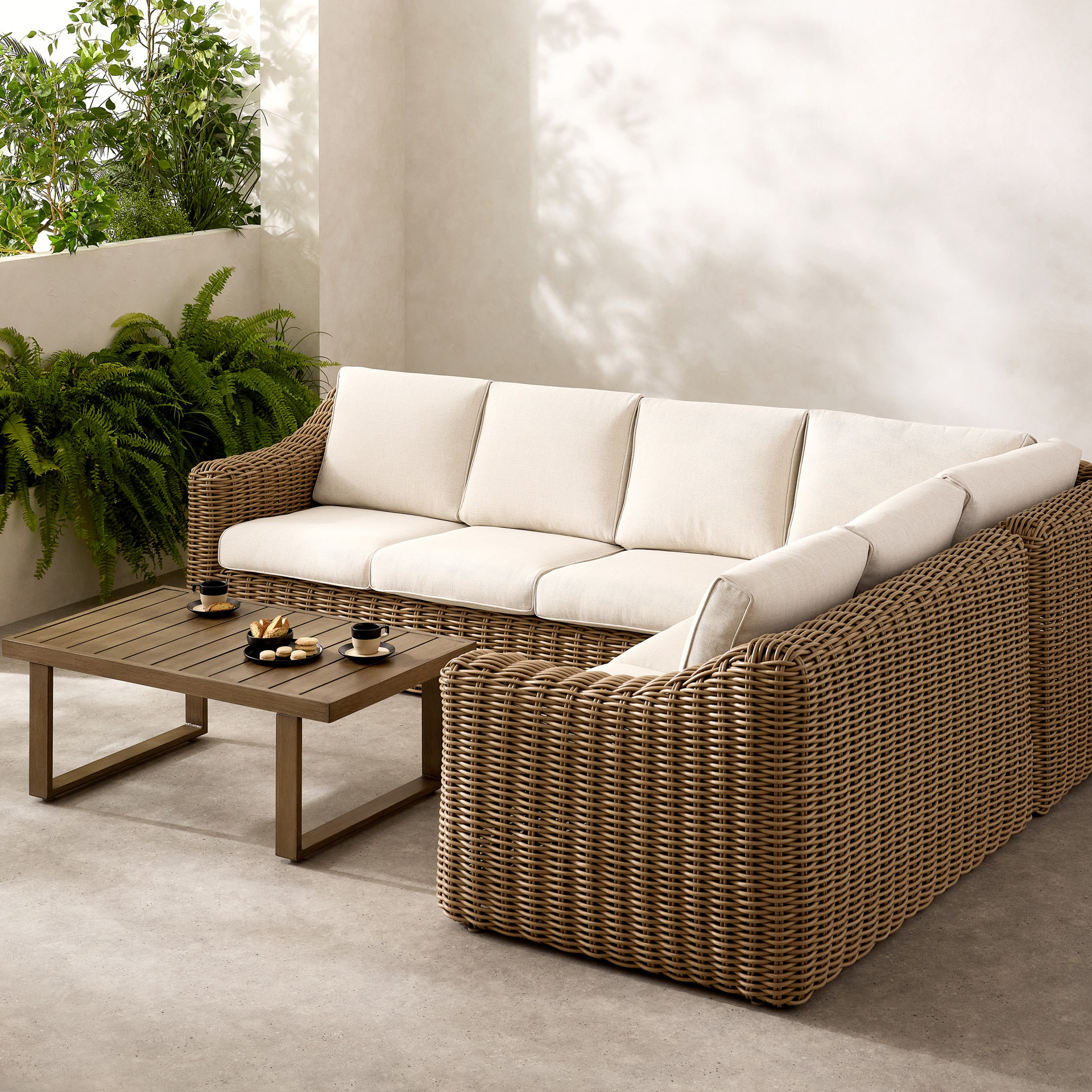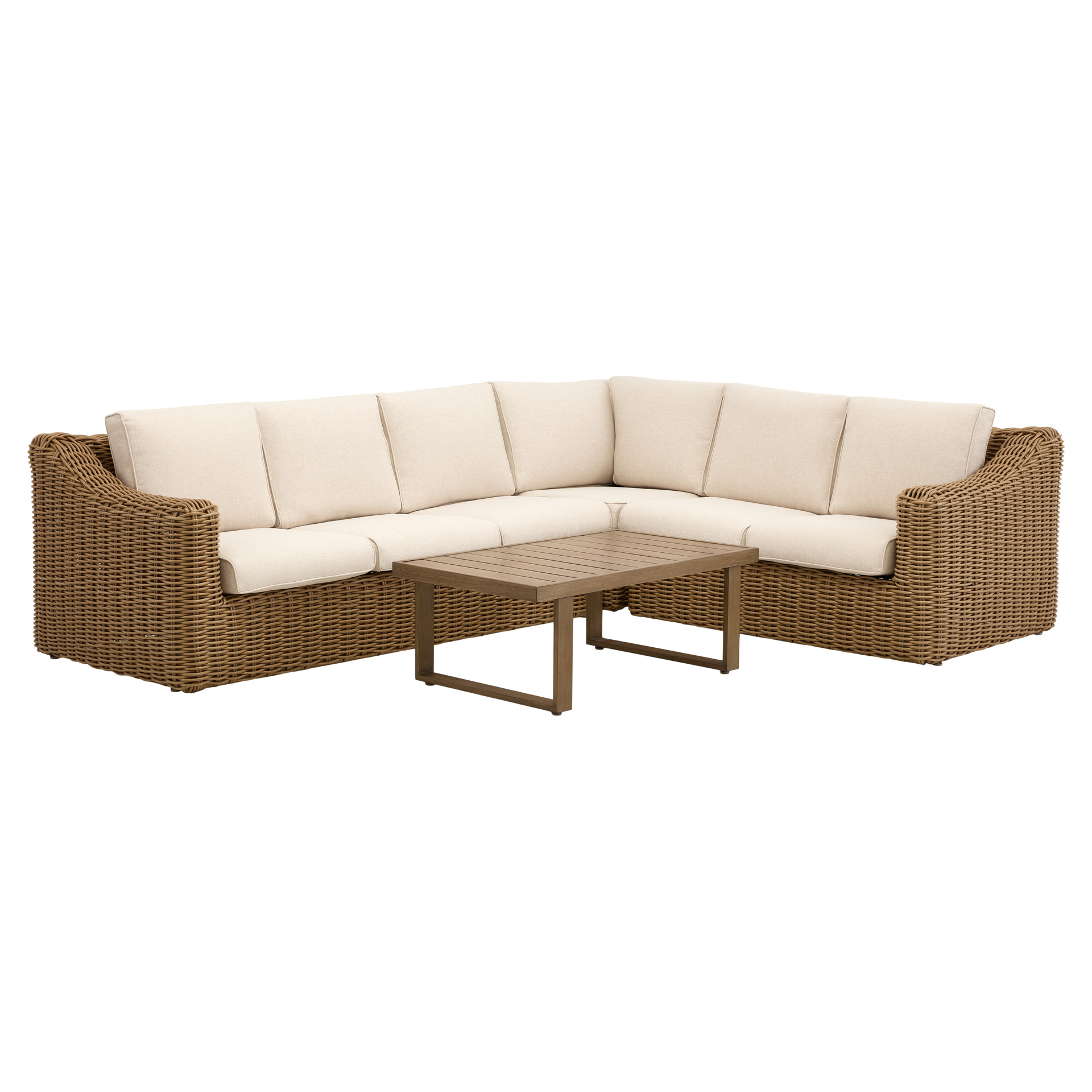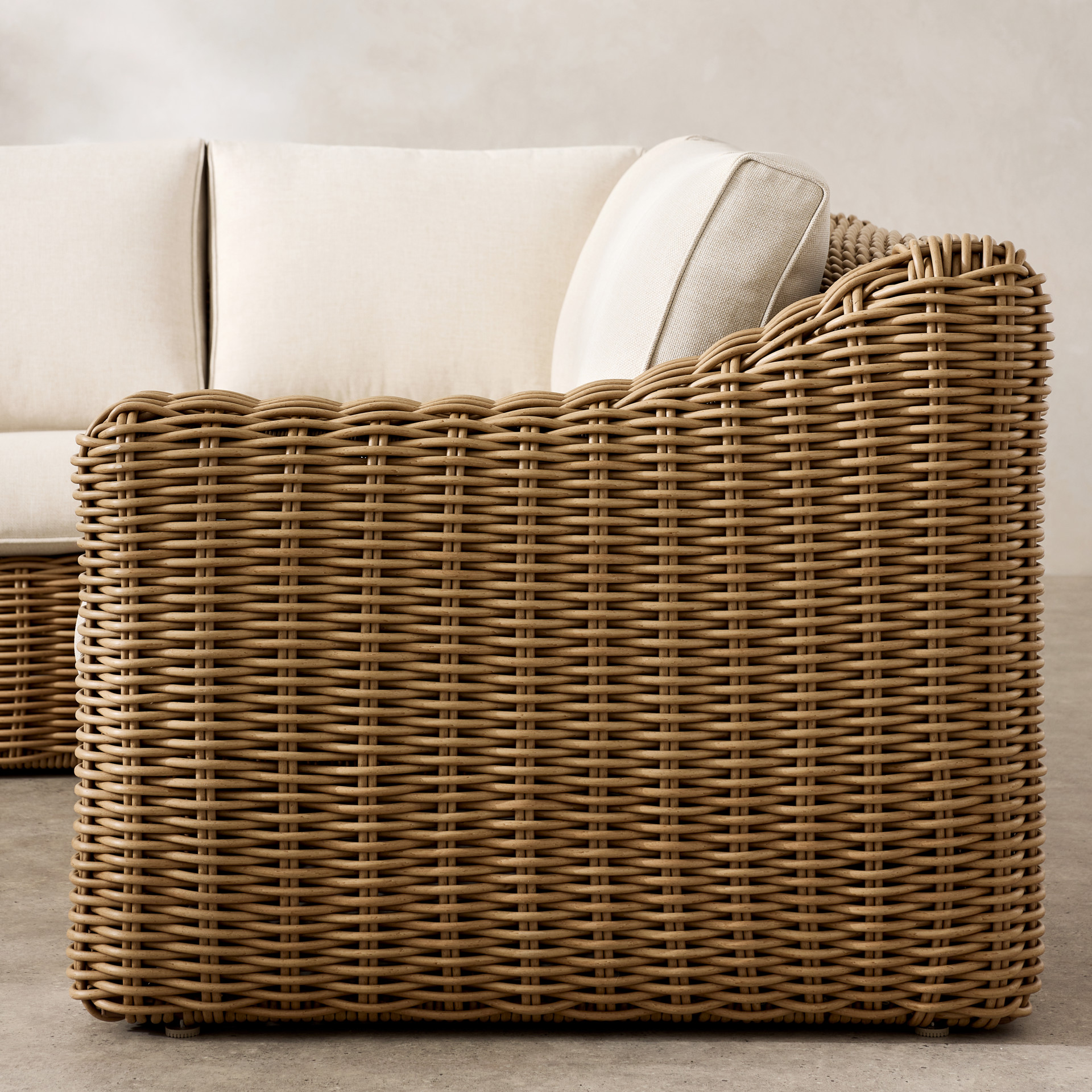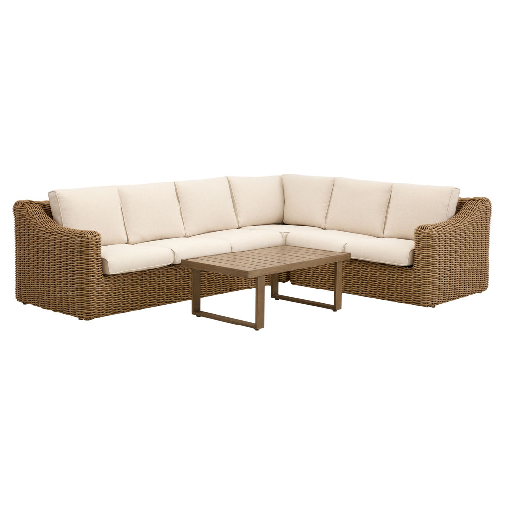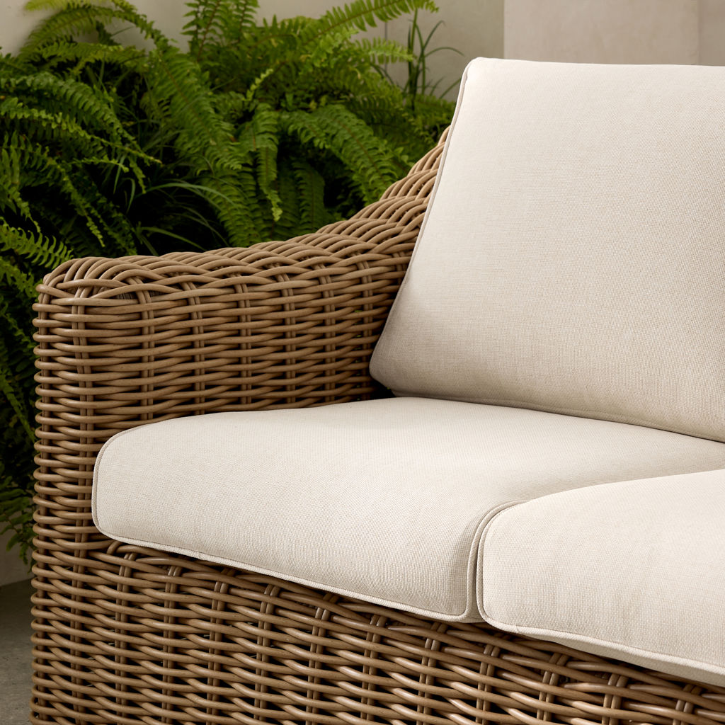 The Gila is a stunning and durable outdoor lounge set. Crafted from round wicker and sturdy aluminum, it offers a beautiful natural look while remaining very easy to maintain. Enjoy warm summer evenings with friends or family, savoring a snack or a drink in the comfort provided by the wide armrests and the sofa.